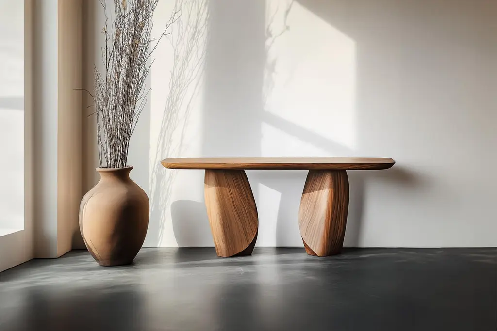 Solace No37 Entry Table – Tactile Legs and Organic Form, by NONO—————————————————————Solace Console Table Series Design by Joel EscalonaThe Solace console table series, designed by Joel Escalona, embodies a quiet sense of balance and presence. With its sculptural legs and fluid contours, each table is a bold statement of form—where function yields to expression. More than furniture, these pieces exist as poetic objects in space.Inspired by Isamu Noguchi’s iconic Pigeon sculpture, the Solace series pays tribute to the fusion of traditional craftsmanship and modern abstraction. Echoing the curves and tensions found in Noguchi’s work, the silhouette of each table evokes a carved, organic form frozen mid-motion.Crafted in solid wood and produced one by one in our Mexico City workshop, each table carries its own subtle variations in tone, grain, and shape—enhancing its individuality. The natural qualities of the material, shaped by time and touch, make every piece a singular presence.Ideal for hallways, foyers, and living spaces, these console tables offer more than utility—they bring a sculptural rhythm to the room. Production time is 7–9 weeks, allowing for the precision and care that each unique piece deserves.—NONO is a Mexican design brand with more than 10 years of experience dedicated to the production of interior furnishings, editions, and custom-made projects. At NONO, we create pieces of extraordinary beauty, accommodating the particular needs and tastes of each client with exclusive high-quality designs.—Some details to consider when placing an order with us:• Catalog images are digitally generated. Actual products may slightly vary in texture, grain, and final finish due to natural material differences. Despite these variations, our expertise ensures each piece maintains high quality and matches the intended design.• All of our products are made to order, and the lead time for standard products is estimated to be 9 to 12 weeks, plus shipping time. However, special pieces or sculptures may require a longer lead time.• We offer customization in dimensions and finish for all of our furniture pieces, which may result in additional charges.• We only facilitate freight services by a third party. The client is solely responsible for any associated import/export taxes, as well as any necessary customs paperwork.• We are not responsible for any damages that may occur during shipping or for any customs-related delays.