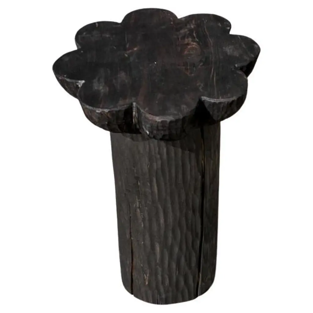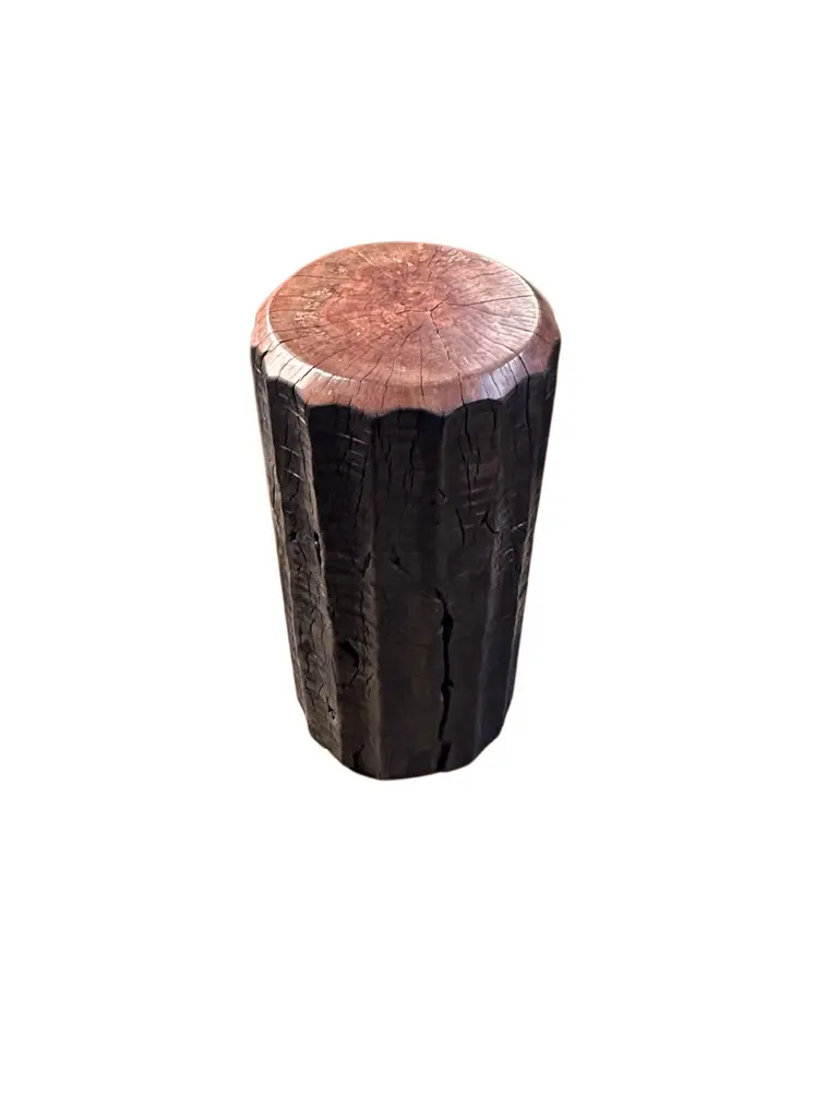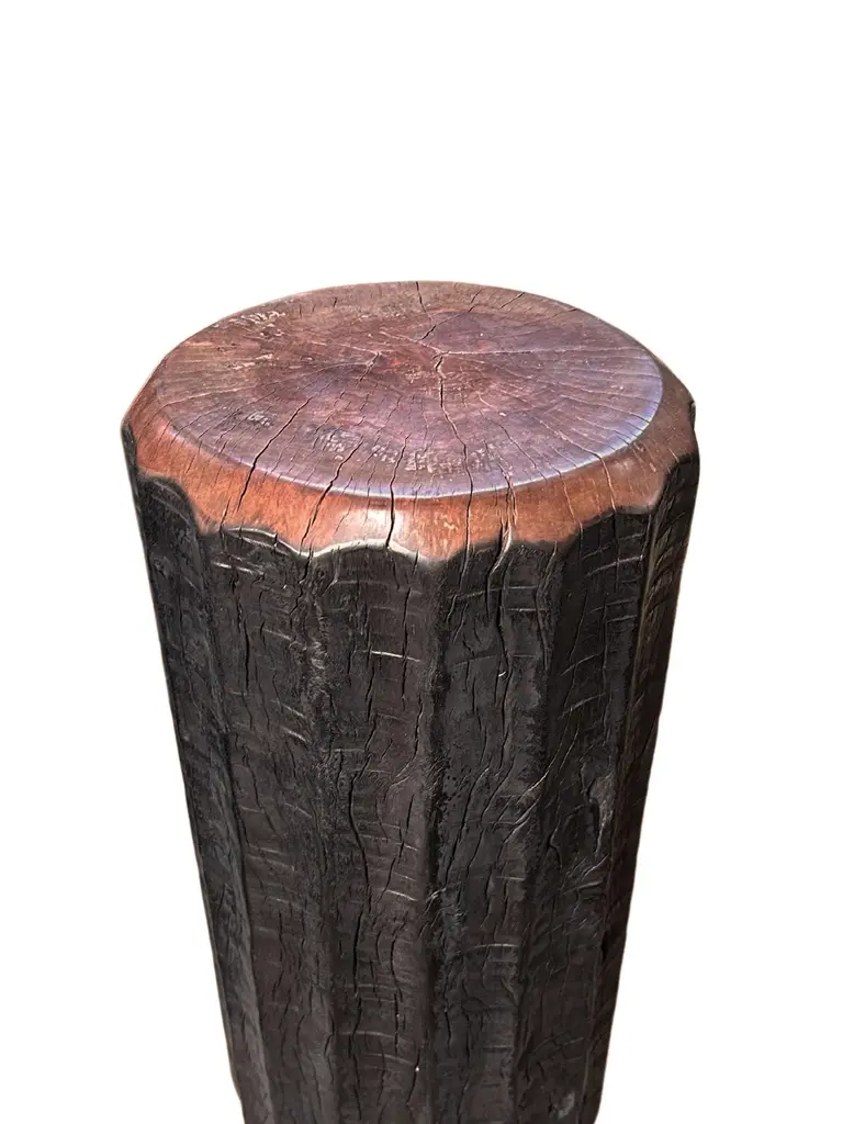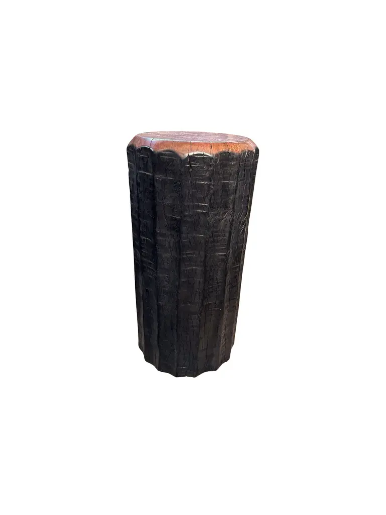 A wonderfully sculptural round side table. Its neutral pigments make it perfect for any space. It was crafted from a solid block of lychee wood and features carved detailing on its sides. The wood textures and shades present on all sides adds to its charm. This table features contrasting finishes on its side and the table top. It's sides were burnt numerous times and finished with a clear coat whilst the table top was meticulously sanded and smoothed.