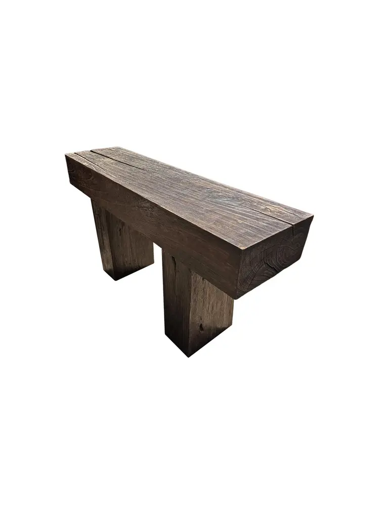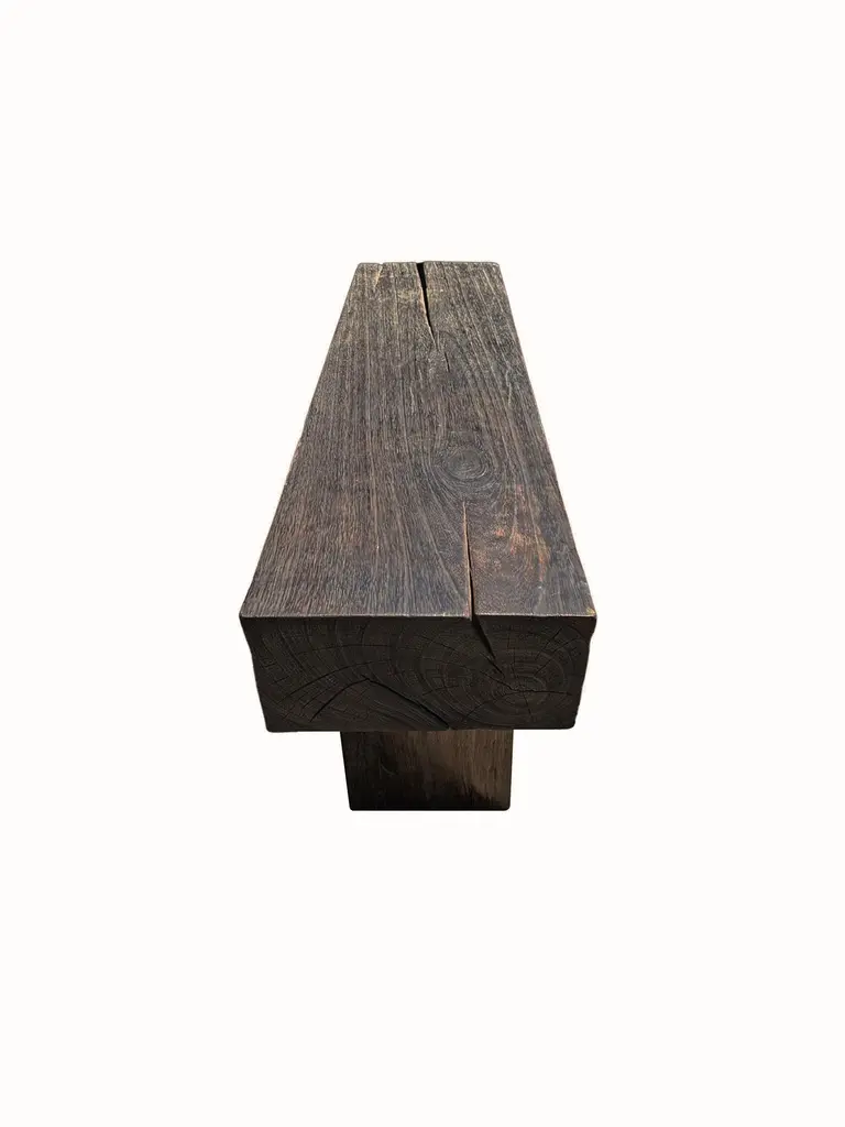 A sculptural mango wood console table crafted from solid mango wood. The table top sits atop two solid, legs. A wonderfully minimalist object. The subtle wood textures present on all sides adds to its charm. To achieve its unique pigment the wood was burnt several times and then finished with a clear coat.
