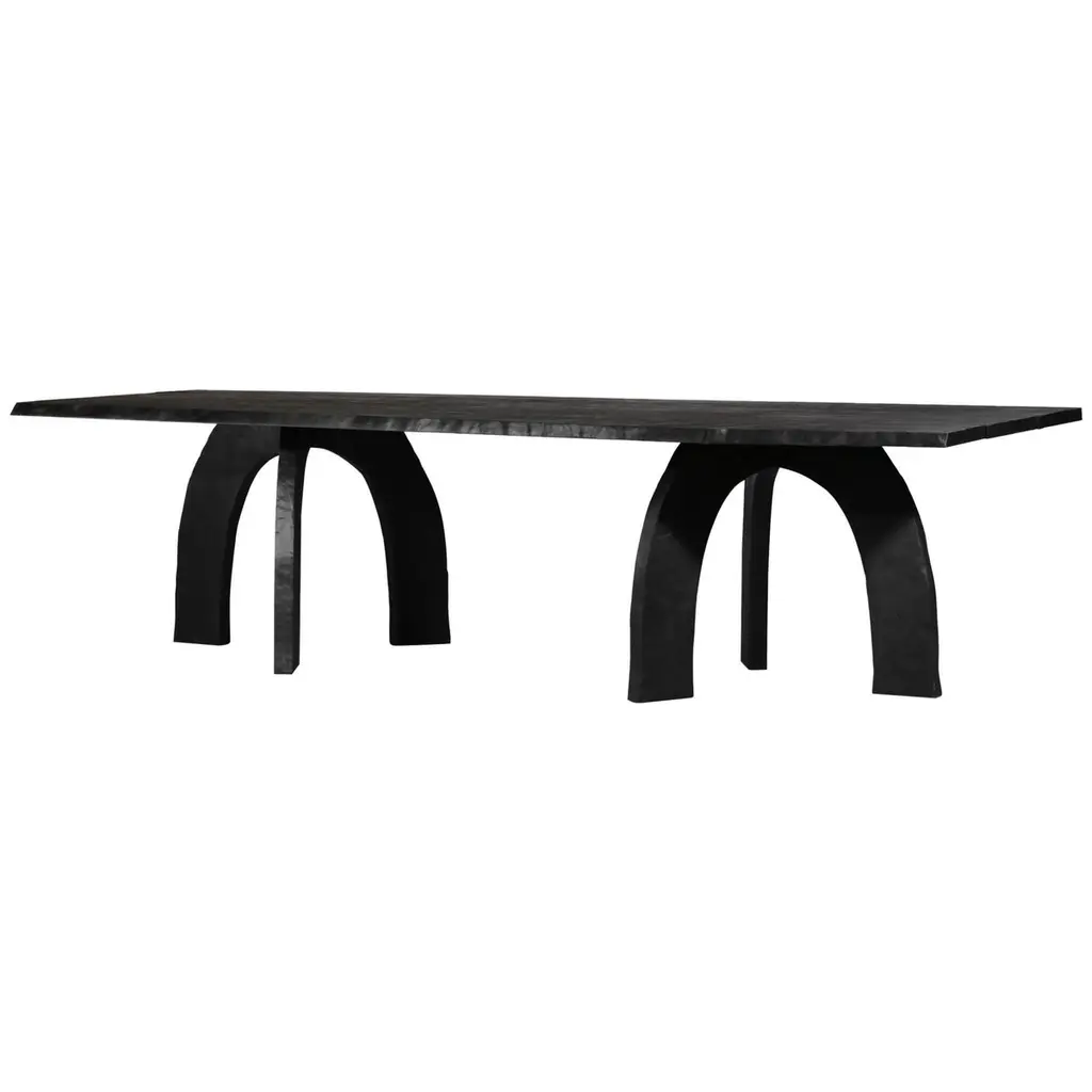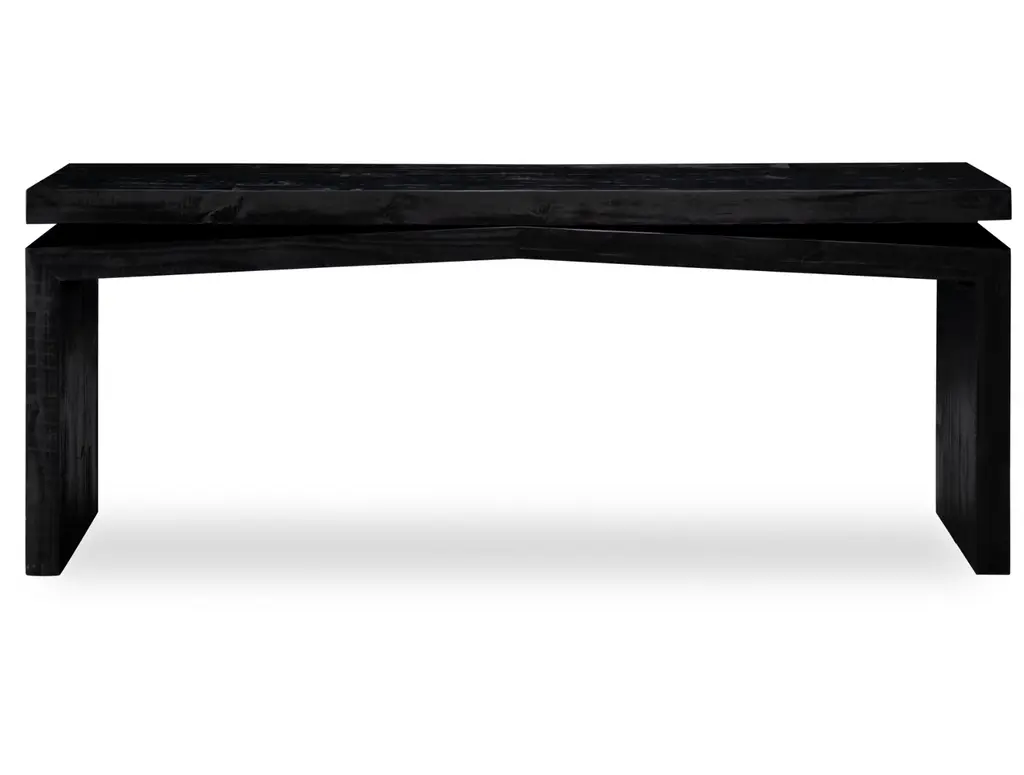 A sculptural mango wood console table. To achieve is rich black pigment the bench was burnt three times and then finished with a clear coat. The table was crafted from a solid block of mango wood. The table top sits atop two solid, narrow legs. The tables legs feature curved edges providing a wonderful mix of curved and straight lines to the table. A wonderfully minimalist object. The subtle wood textures present on all sides adds to its charm.