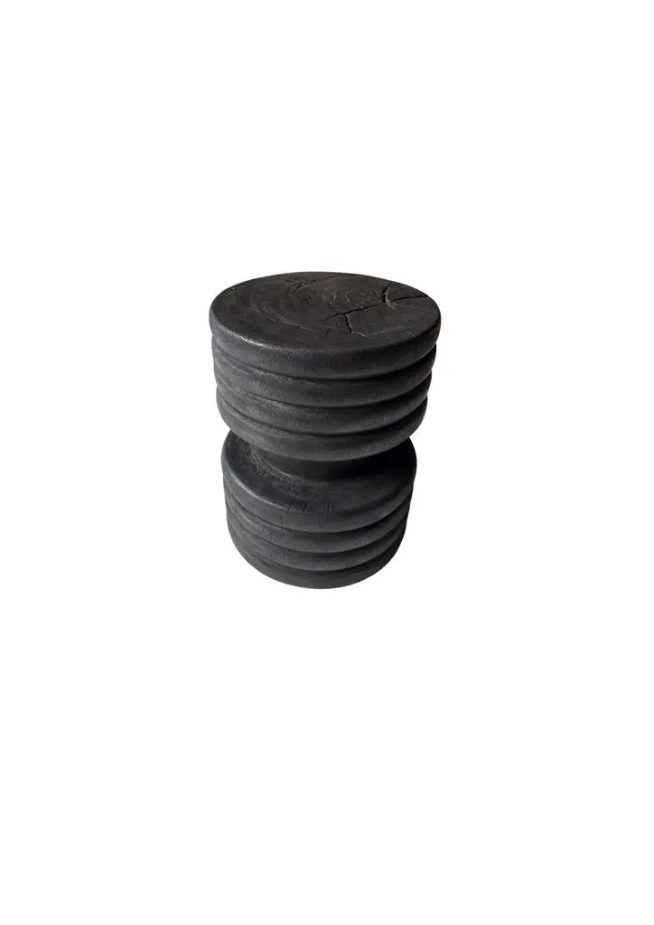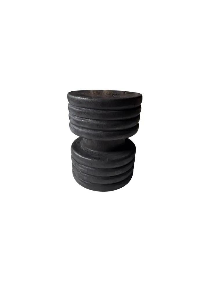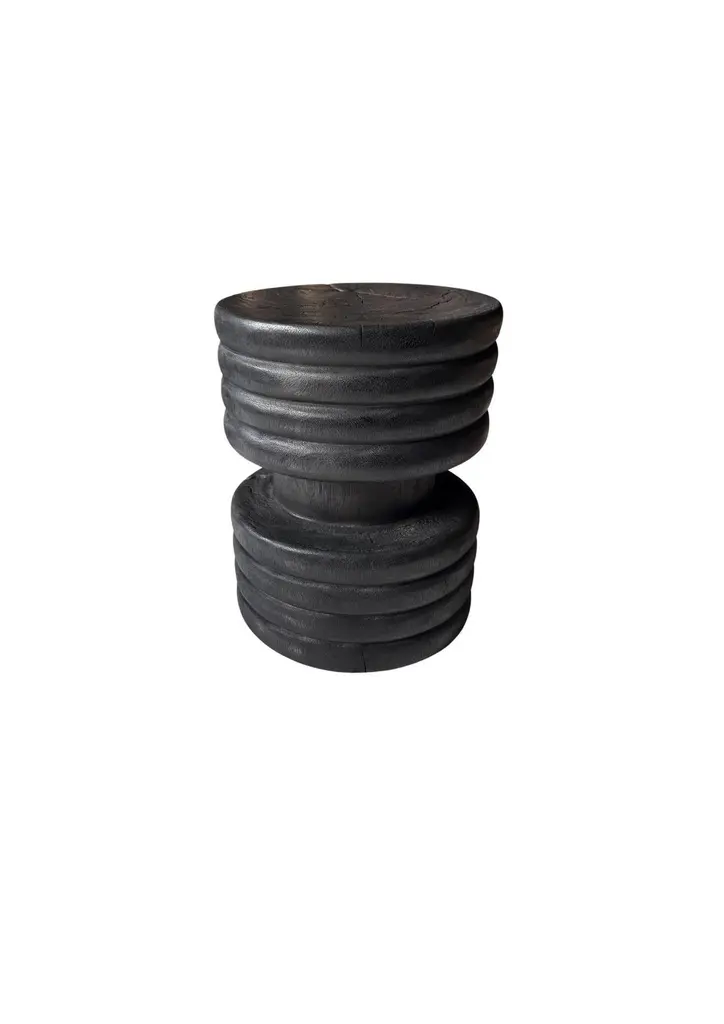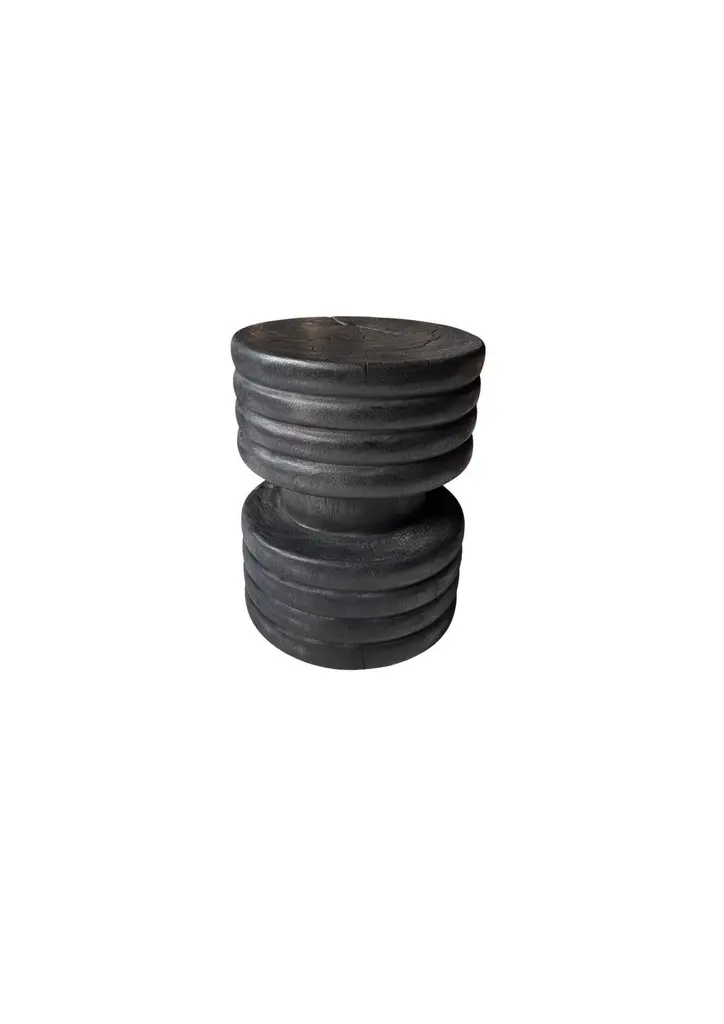 Elevated by artisanal craftsmanship, this suar wood side table is a striking blend of bold character and refined detail. Its cylindrical form is wrapped in elegant, hand-carved ribbed detailing, adding depth and texture to the silhouette. The table features a rich black burnt finish, achieved through multiple rounds of controlled charring—each layer deepening the tone and enhancing the natural grain of the wood. The result is a dramatic yet sophisticated piece that exudes warmth, strength, and sculptural beauty. Perfect as an accent piece or a functional work of art, this side table makes a statement in any modern or organic-inspired space.