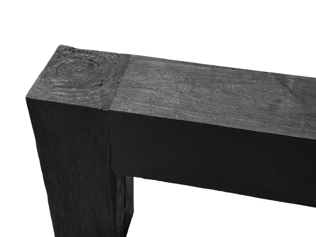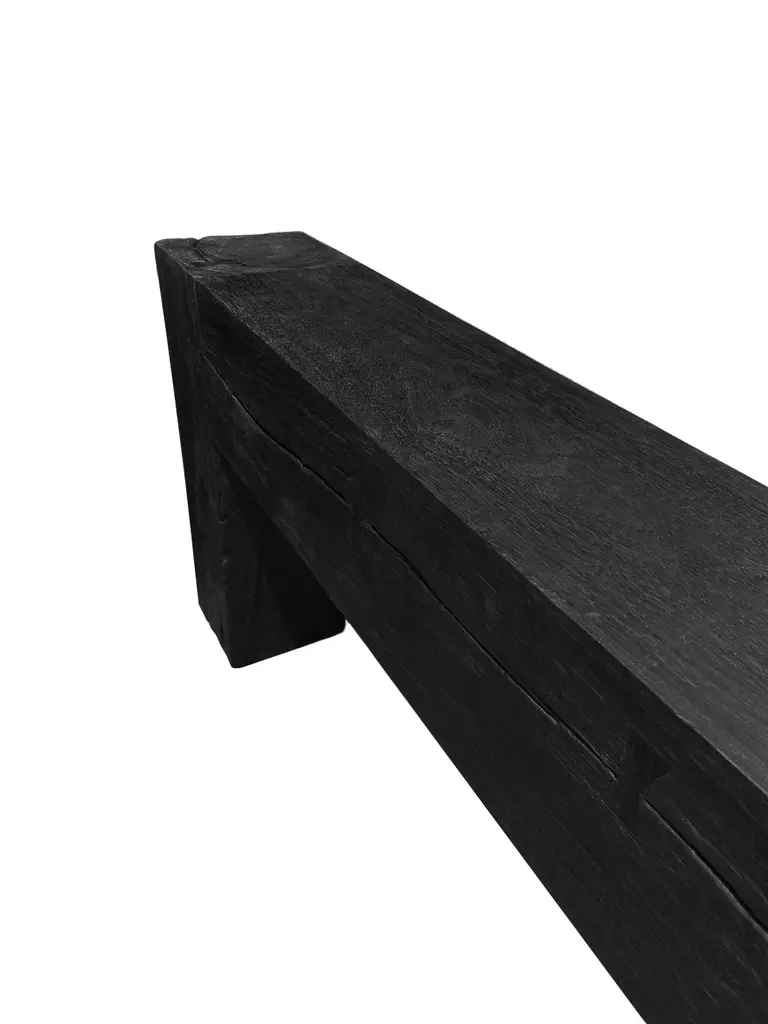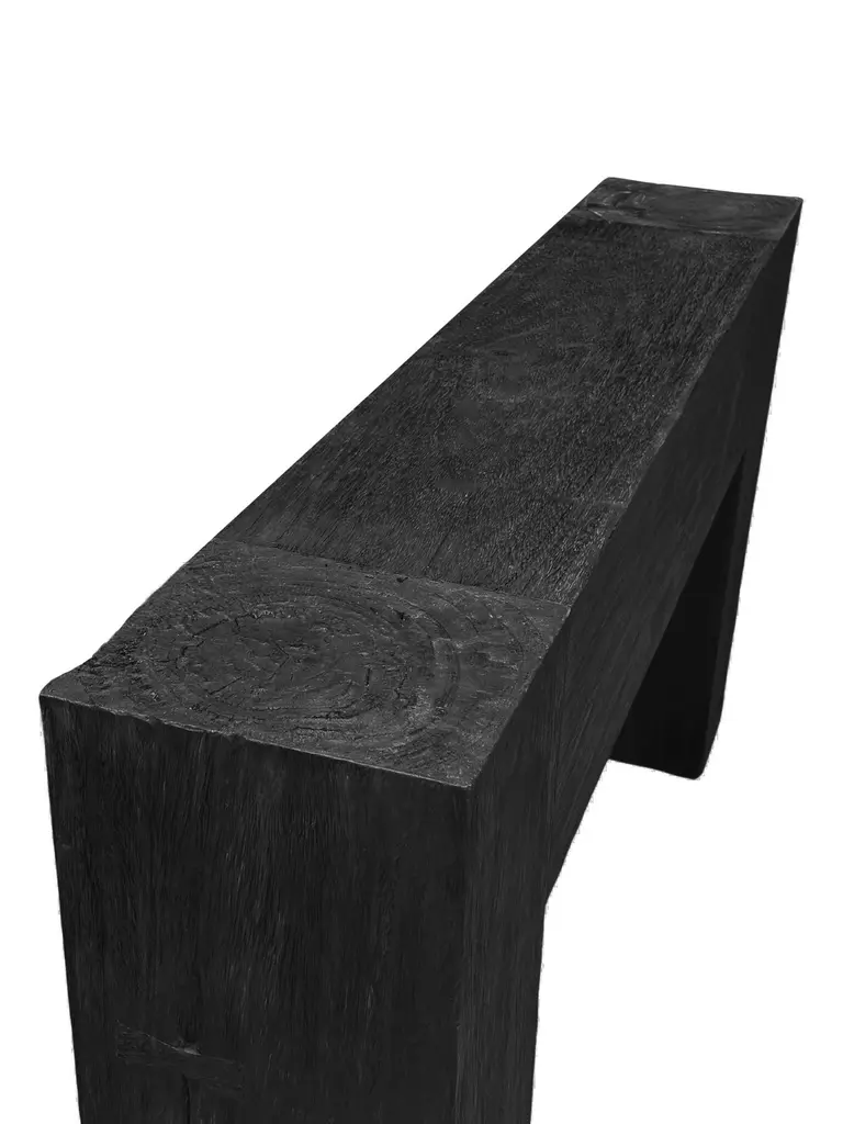A sculptural teak wood console table crafted from solid teak wood. The table top sits atop two solid, legs. A wonderfully minimalist object. To achieve its unique pigment the wood was burnt several times and then finished with a clear coat. The teak used in this console table is sourced from Bojonegoro, Java. Bojonegoro is home to arguably the highest quality teak in the world.Custom sizing is available for this item. Given the nature of the materials used for this item, variations in wood wood textures and markings on all final products is to be expected.