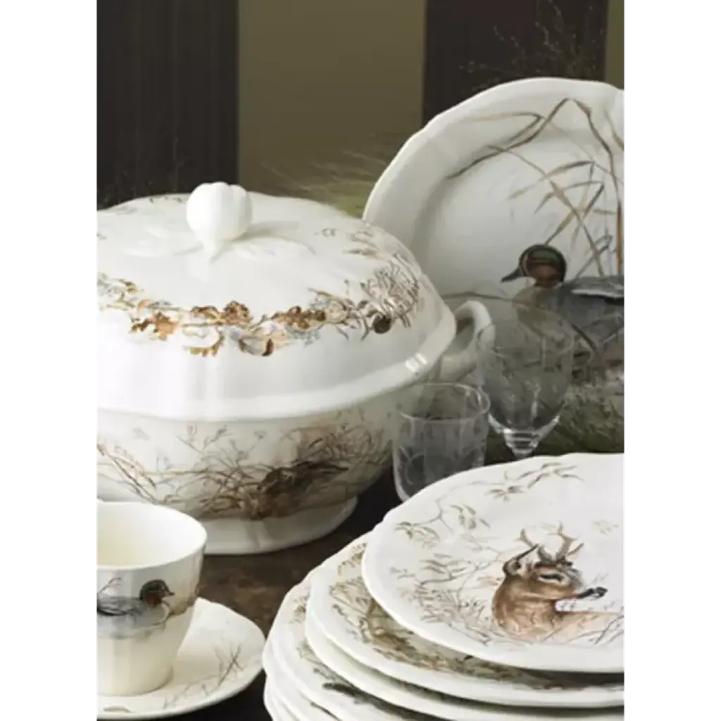 Perfect for mountainside retreats, Gien's Sologne dinnerware brings the outdoors in with wild rabbits, partridges, ferns, quail, and woodcocks. Designer Estelle Rebottaro, a professional animal painter, was inspired by the wildlife of Sologne and the hide-and-seek movements of the animals in the area. Faience earthenware made in France by Gien. Four-piece place setting includes dinner plate, dessert plate, bowl, and mug. Five-piece place setting includes dinner plate, dessert plate, canape plate, US tea cup, and saucer. Located near the Loire Valley castles, the Faïencerie de Gien has been synonymous with prestigious faience tableware and decorative objects since its founding in 1821. Gien pieces are renowned for their warm white clays decorated with traditional motifs reminiscent of the French countryside.