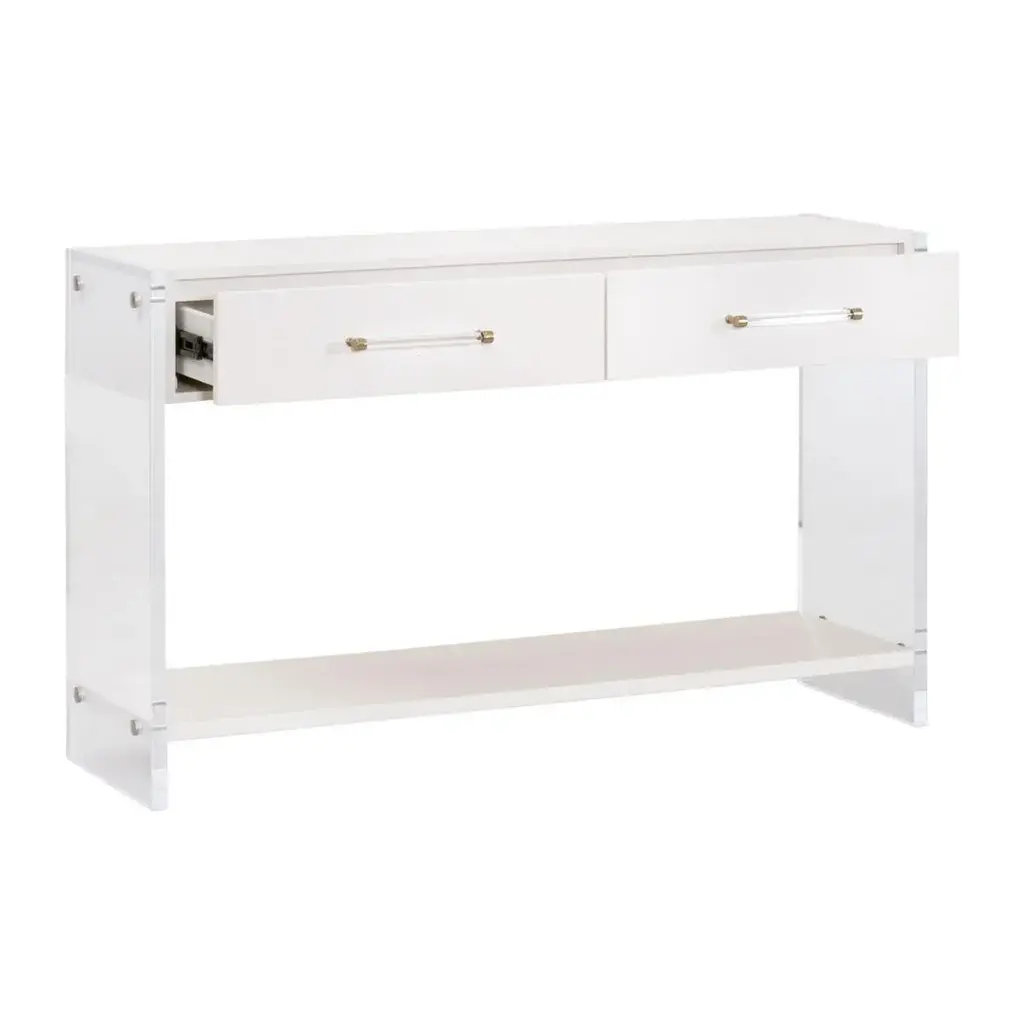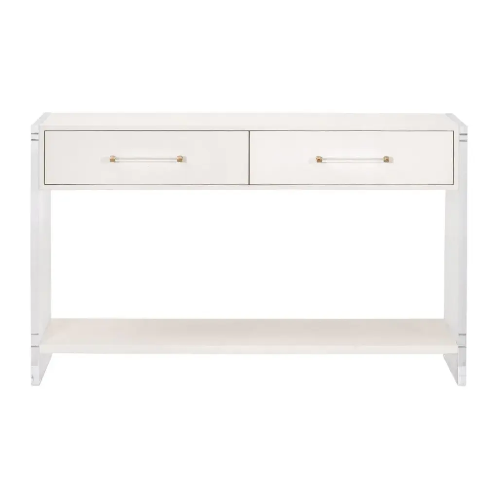 Sonia Shagreen Console Table Embrace the sophisticated elegance of the Sonia Shagreen Console Table by Essentials For Living. This transitional piece uniquely showcases a pearl white faux shagreen finish, which is made to mimic real stingray skin. Meticulously crafted from faux shagreen resin, solid rubberwood, solid beech wood, acrylic, and metal, it exudes unmatched durability and style. It measures 52" wide, 15" deep, and 31.5" high, making it perfect for any living room or foyer. The table is remarkable design features front drawer panels with a geometric pattern adorned with deep groove lines and clear handles with brushed brass accents. The two storage drawers are equipped with a hold-in detent to prevent roll out, ensuring the safety of your stored items. Its lower storage shelf provides additional space, while the clear acrylic sides with brushed brass accents contribute to its modern aesthetic. This console table effortlessly combines functionality and style, making it a captivating addition to any interior, Sonia Shagreen Console Table Features: Dimensions: W 52 x D 15 x H 31.5 Weight (lbs): 110 Colors: Pearl Shagreen, Brushed Brass Materials: Faux Shagreen Resin, Solid Rubberwood, Solid Beech, MDF, Acrylic, Metal Faux Shagreen Resin Drawer Panels & Surround Geometric Patterned Drawer Fronts Clear Acrylic Panel Legs Lower Storage Shelf