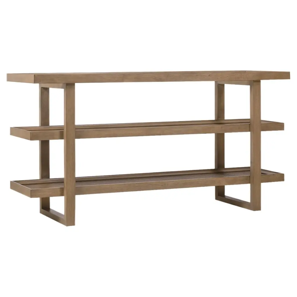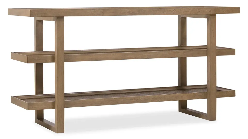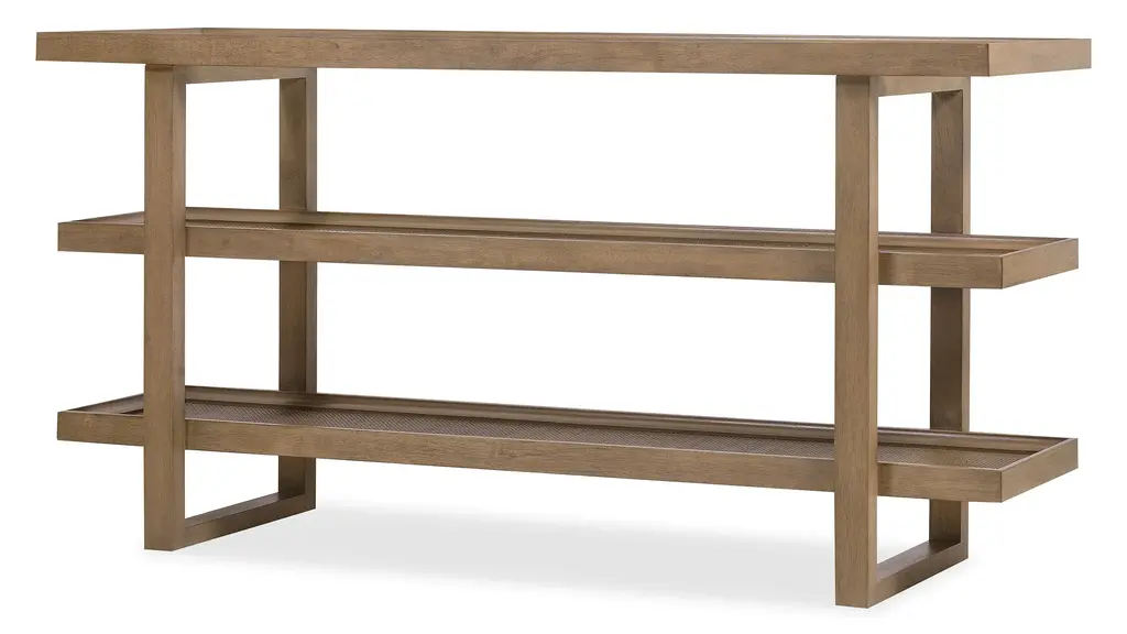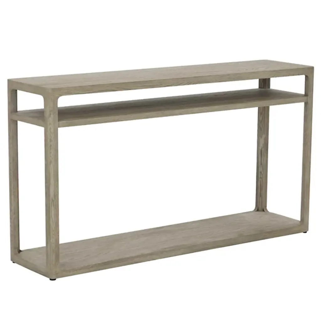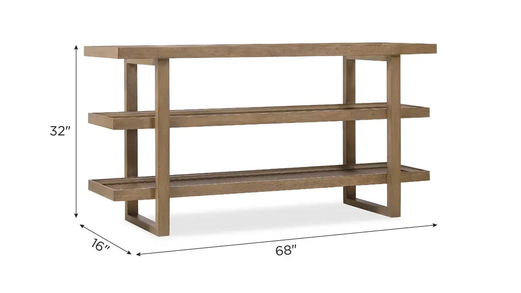 Blending organic textures and neutral tones with a refined minimalist silhouette, the stylistically versatile Sonnet Console Table exudes a natural luxury. Featuring a narrow rectangle shape only 16 inches deep, it has a tempered glass insert top and two fixed shelves with cane inserts. The table is crafted of Quartered and Cathedral-Cut White Oak Veneers in a light earthen finish.