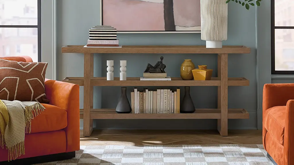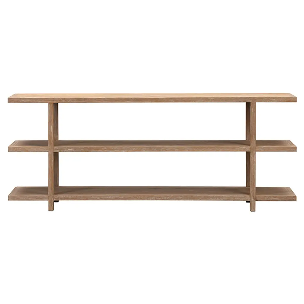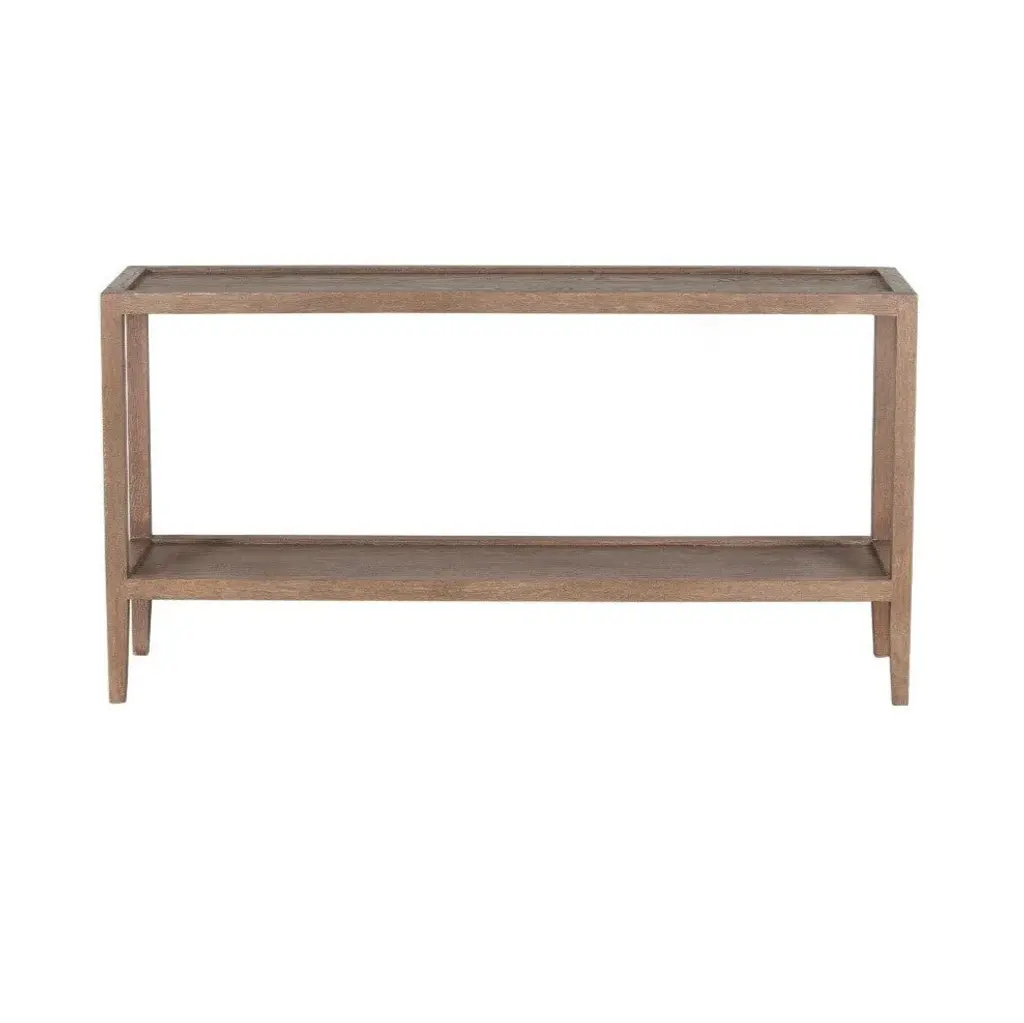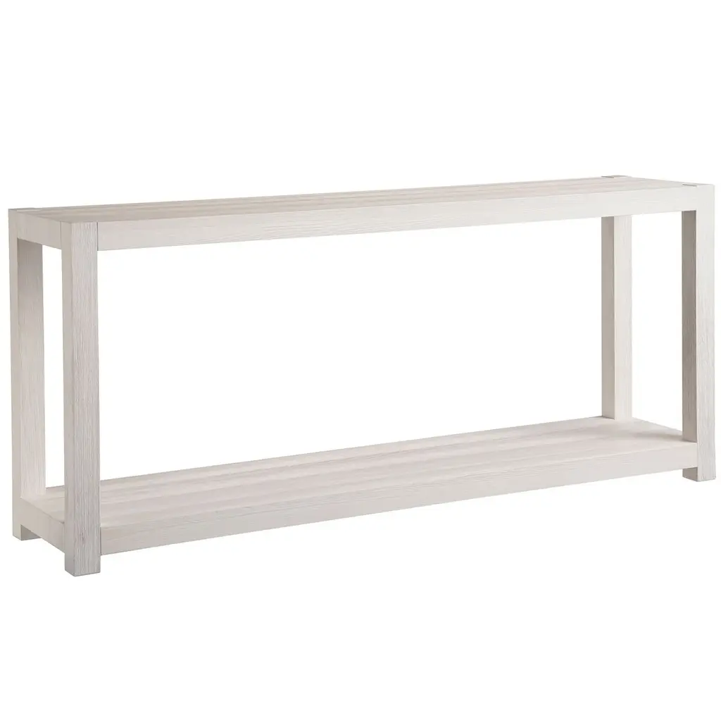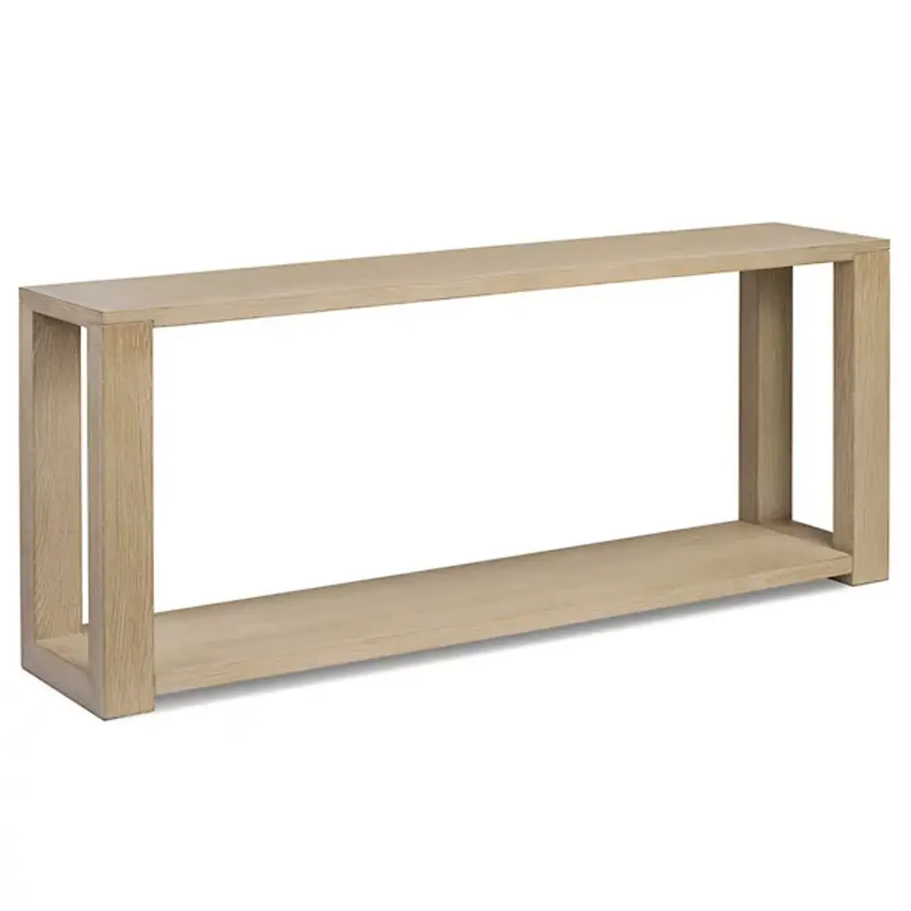 Blending organic textures and neutral tones with a refined minimalist silhouette, the stylistically versatile Sonnet Console Table exudes a natural luxury. Featuring a narrow rectangle shape only 16 inches deep, it has a tempered glass insert top and two fixed shelves with cane inserts. The table is crafted of Quartered and Cathedral-Cut White Oak Veneers in a light earthen finish.
