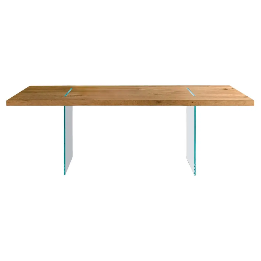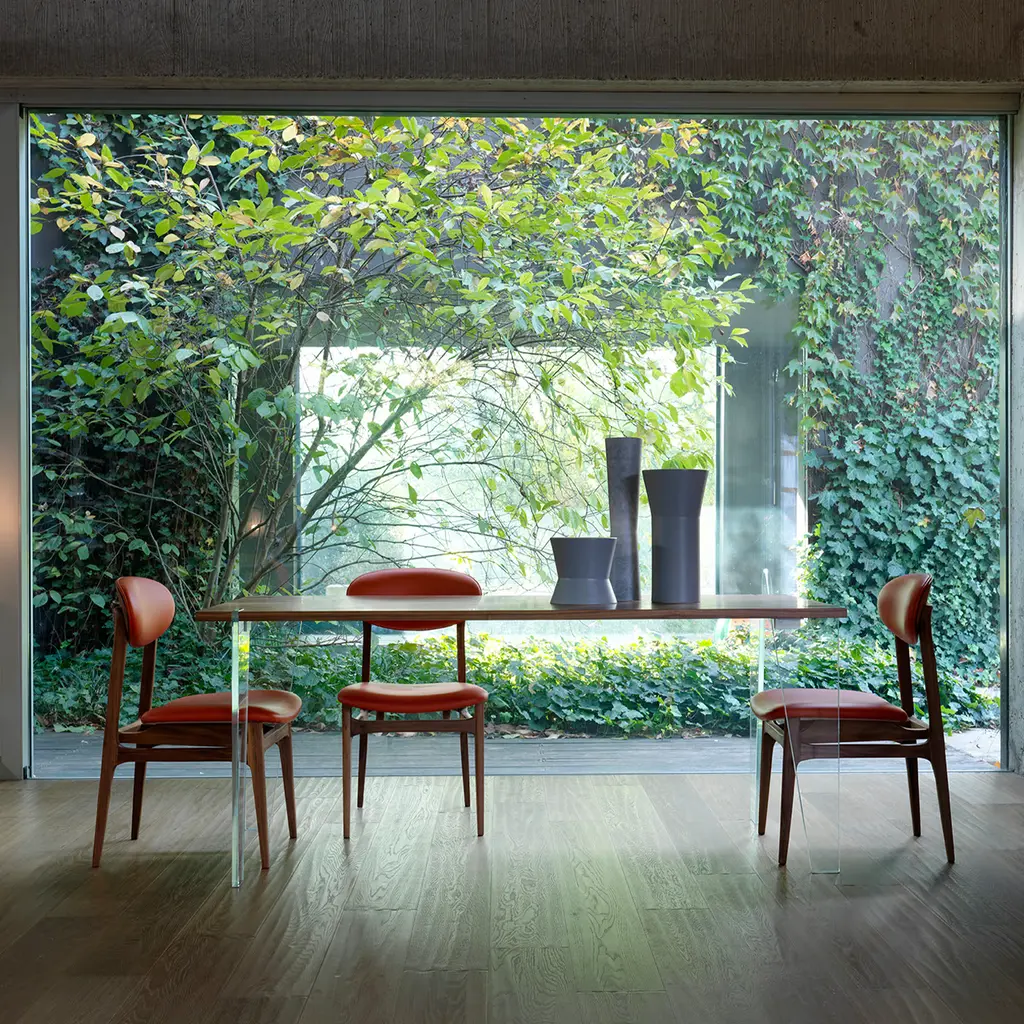 Illusion combines with the substance of traditional solid wood processing. The Sospeso collection of tables are created by the expert hands and vision of our artisans. The linear and formal design of the wooden top rests on legs in extra clear glass with visible joints to convey a floating effect.