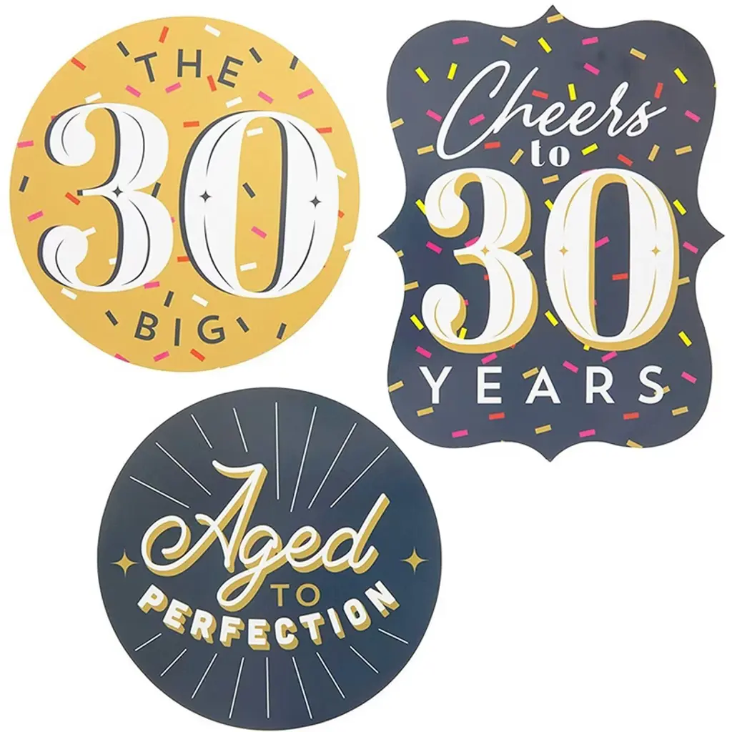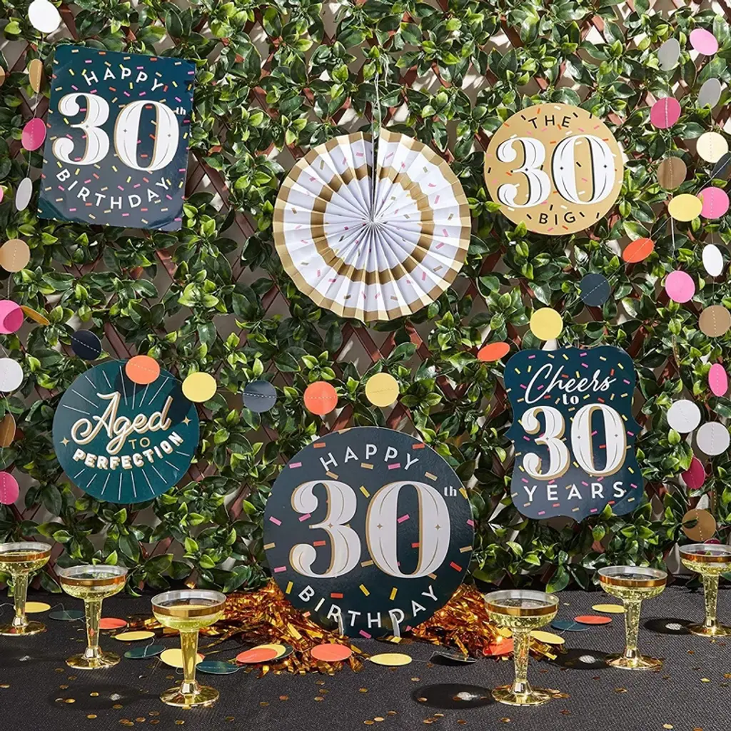 Make your party decor stand out thanks to our 30th birthday decoration pack. Each pack features festive table and wall decor in black and gold colors that you can easily set up anywhere. Use the fun decor on your dessert table, main table, or as photo booth props. Each pack includes 2 paper ceiling fans, 2 table centerpieces, 4 cutout wall signs, and 4 strings of confetti rounds banner for a total of 12 pieces. Sparkle and Bash is your source for spectacular, high-quality party and event supplies. We carry exactly what you need to create a visual statement to help elevate your party space while keeping things affordable and easy.