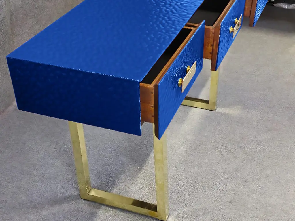 Spectacular blue Murano glass console table with three spacious drawers, expertly crafted in Italy. This mid-century modern console table is made of solid birch wood, with a beveled blue Murano glass top that features exquisite hand-painted and carved details. Elegant brass legs and velvet accents add a touch of luxury to its refined design. Oevery element is meticulously handcrafted, including the soldered brass and Murano art glass, a testament to Italian craftsmanship. With a beveled finish and a durable structure, this console table offers style and functionality, making it a statement piece for any entrance or living space. It perfectly combines classic mid-century aesthetics with unique craftsmanship. Its exclusive design was presented during Milan Fashion Week, underlining its prestige and collector's value.