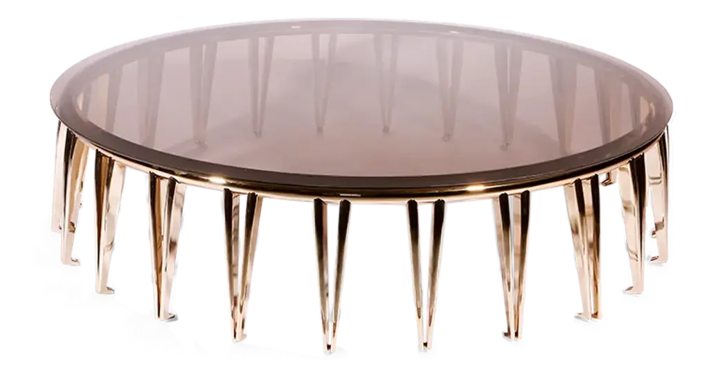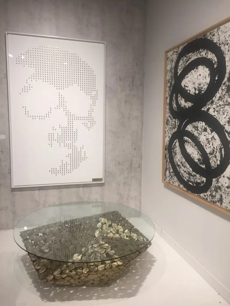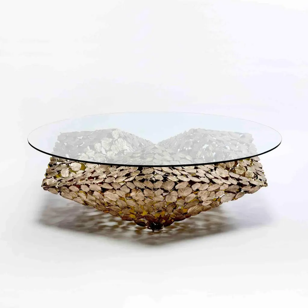 Stellated Spherical Spring Table is a unique and artistic table, that was featured at Salon NYC. Made to order the artist casts thousands of bronze winter hazel leaves ,or ginko leaves ( not shown) and welds and assembles a unique embellished minimalist geometric base consisting of three interlocking tetrahedronal shapes made using leaves. A naturalistic feature for any project using concrete, modernist or clean aesthetics. All made by the artist at their 18th century Foundry using ageold techniques to make Modern Furniture. Please contact us to discuss the custom finishes available.
