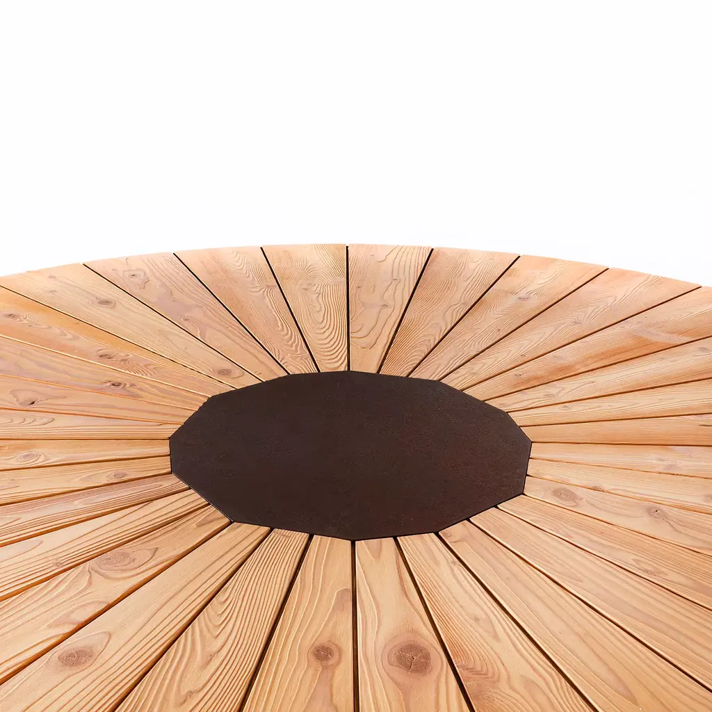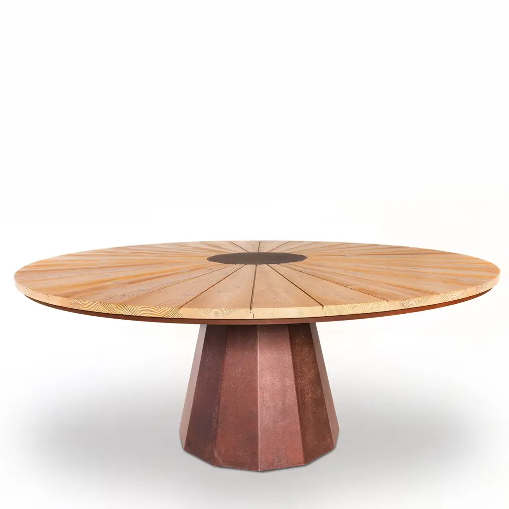 The Spica table takes its name from the star in the constellation Virgo, and is considered among the brightest in the sky. The design of the table top recalls the radiant movement of light beams through the segments of natural larch wood arranged in a radial pattern and supported by the dodecahedron-shaped base in waxed Corten steel.