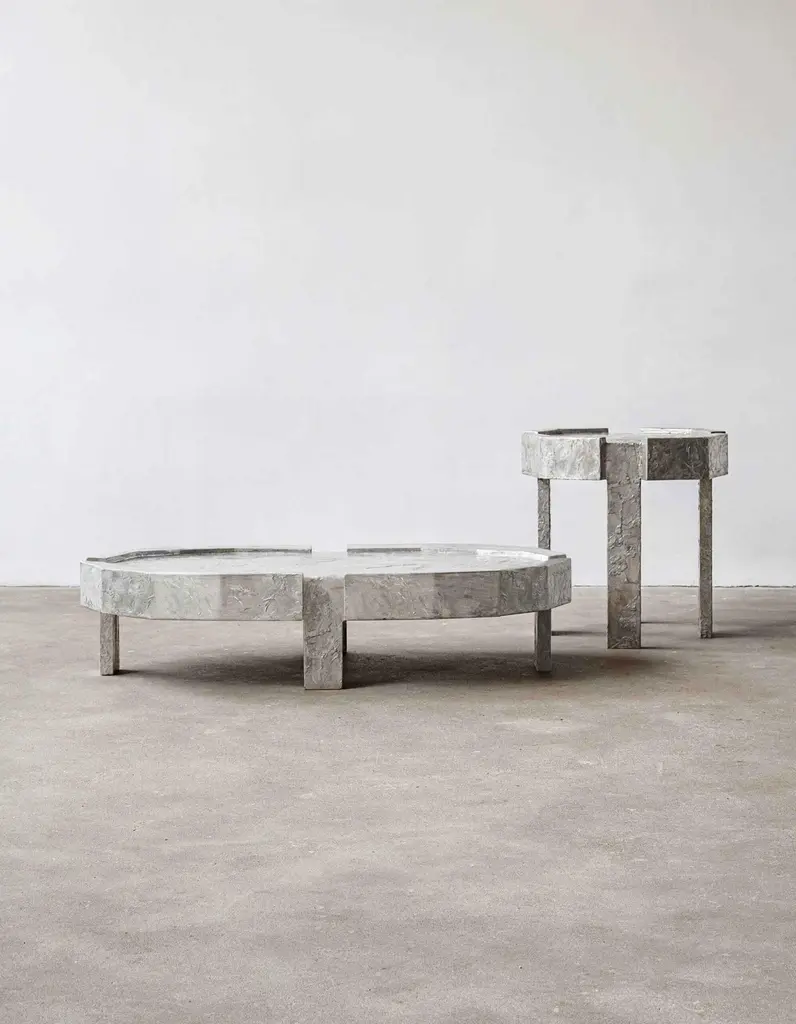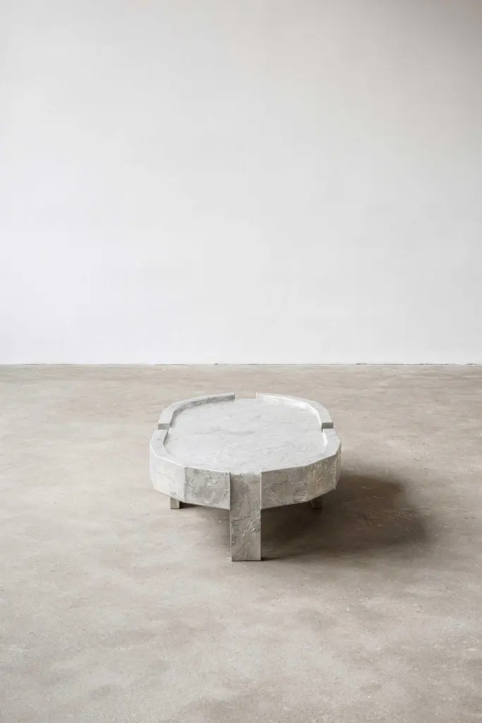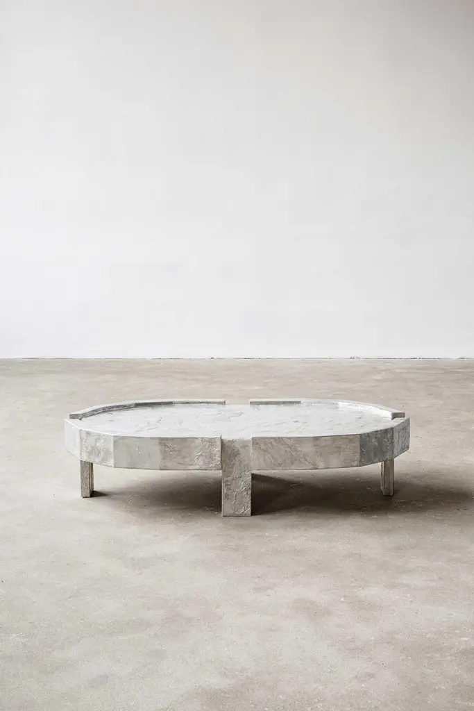 SPLAV Bigger Table M by ZEMNADesigned by Tetiana Krasutska.Dimensions: D 55 x W 110 x H 25 cm. Materials: Steel and tin.These objects draw inspiration from a powerful past, imbued with mysticism and resilience. These tables have the name 'SPLAV'. We treat the metal base with molten tin, which is applied by hand at its melting point of 232°C. This meticulous process ensures a unique texture and finish for each piece. Please contact us.We tell stories through shapes, textures, and symbols. And invite you to dialogue with yourself, nature, and the moment.