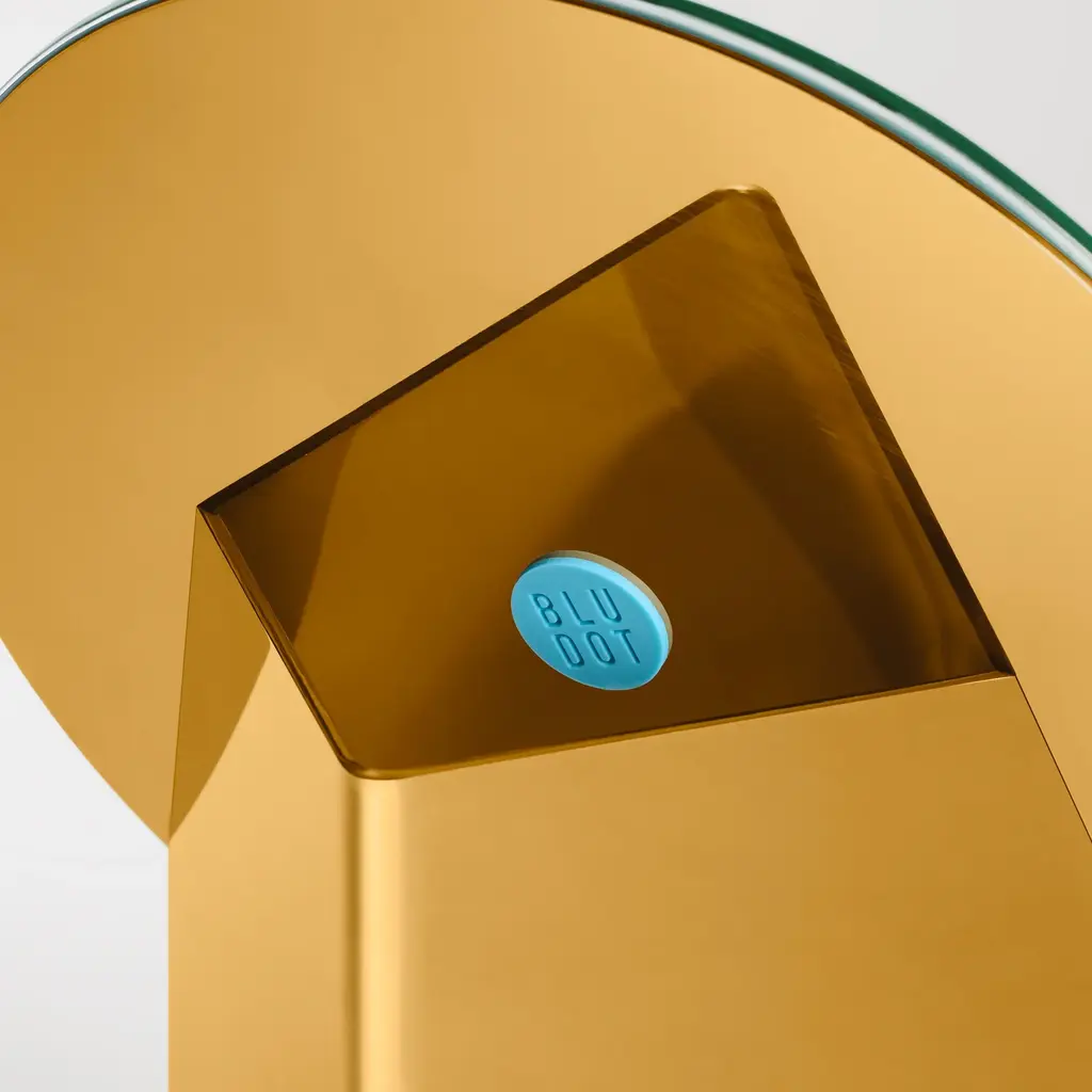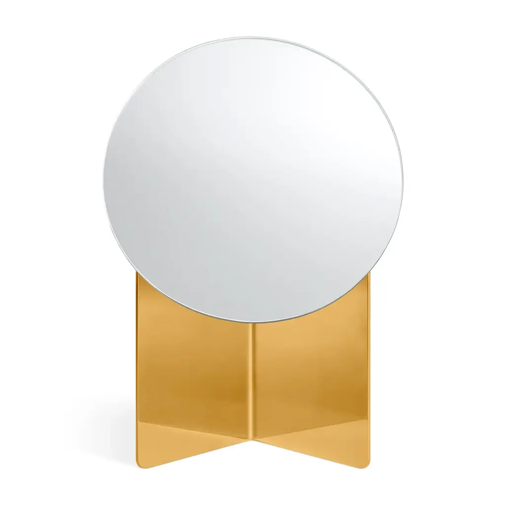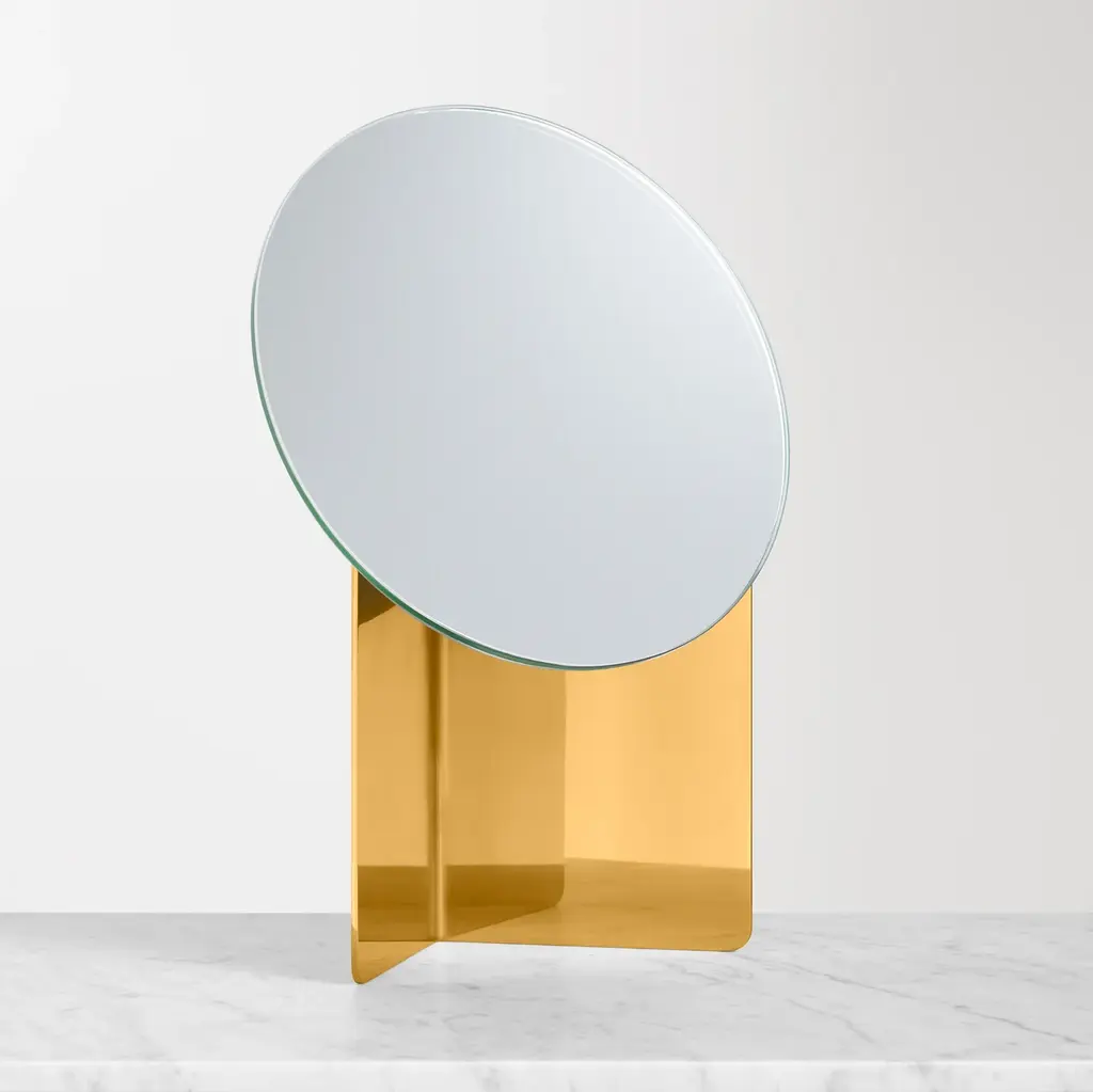 Take a good long look. A simple round mirror sits atop an angled steel base that flaunts flashy finishes and guarantees you’ll always like what you see.