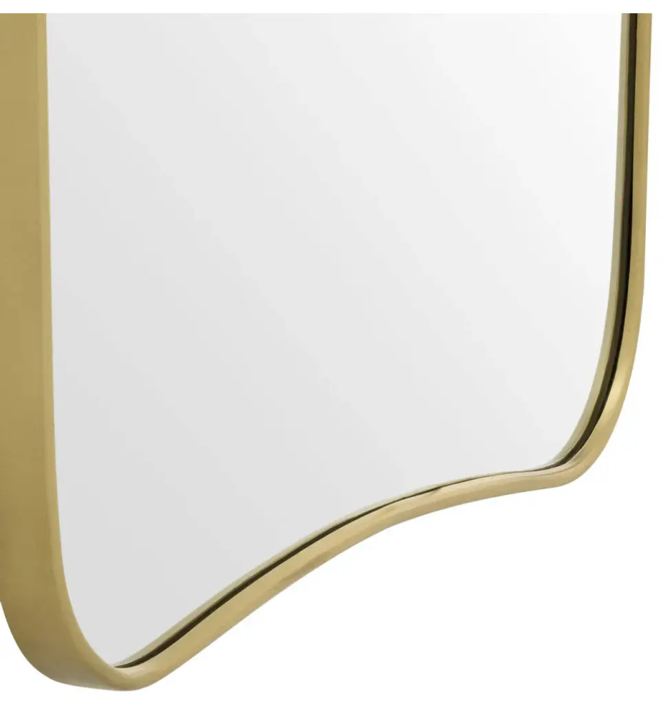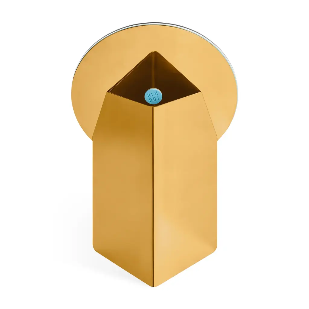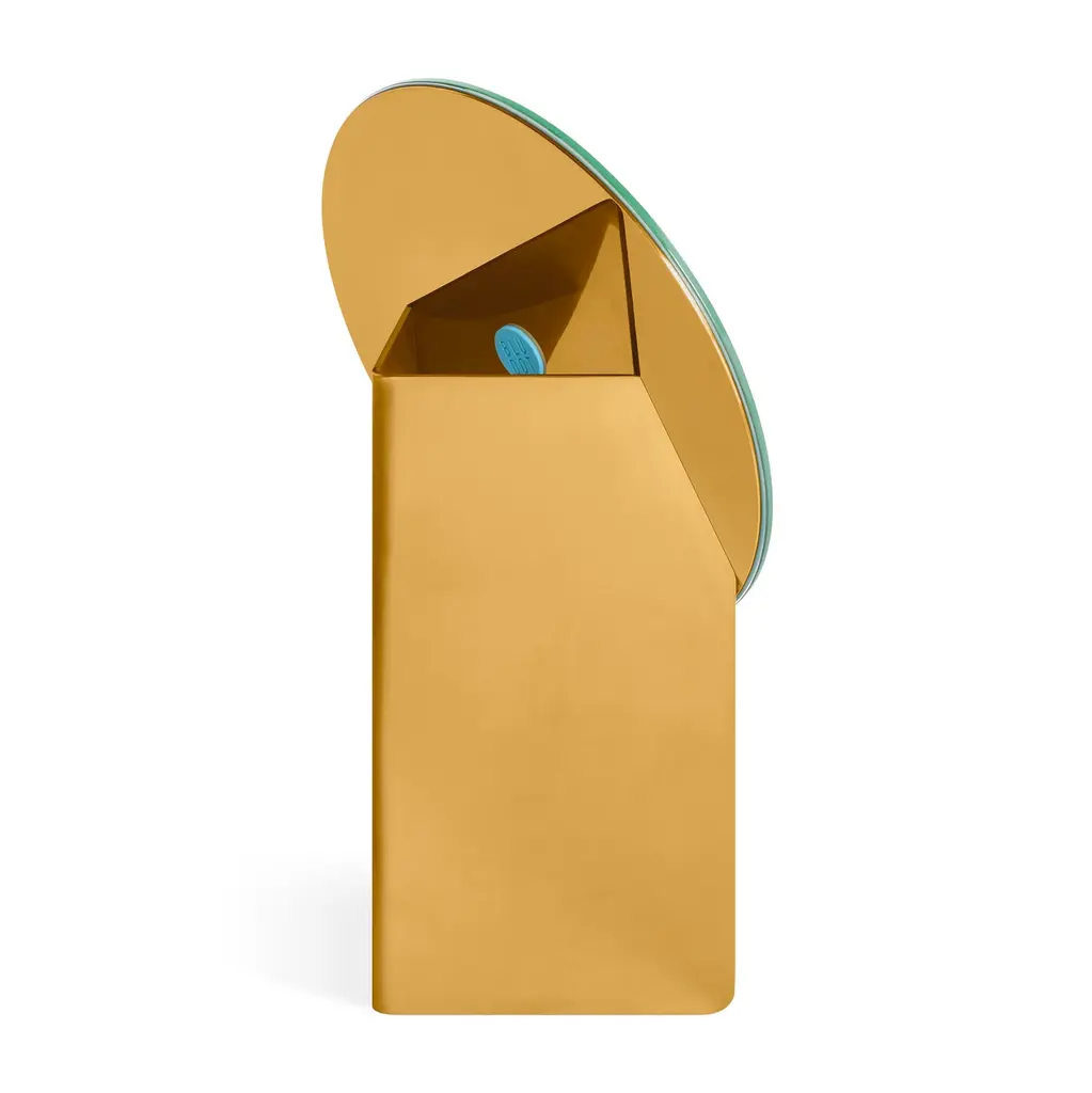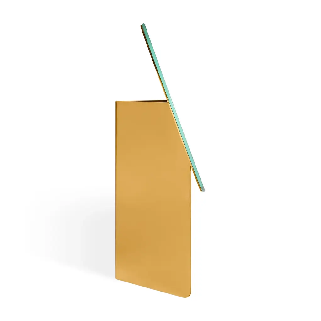 Take a good long look. A simple round mirror sits atop an angled steel base that flaunts flashy finishes and guarantees you’ll always like what you see.