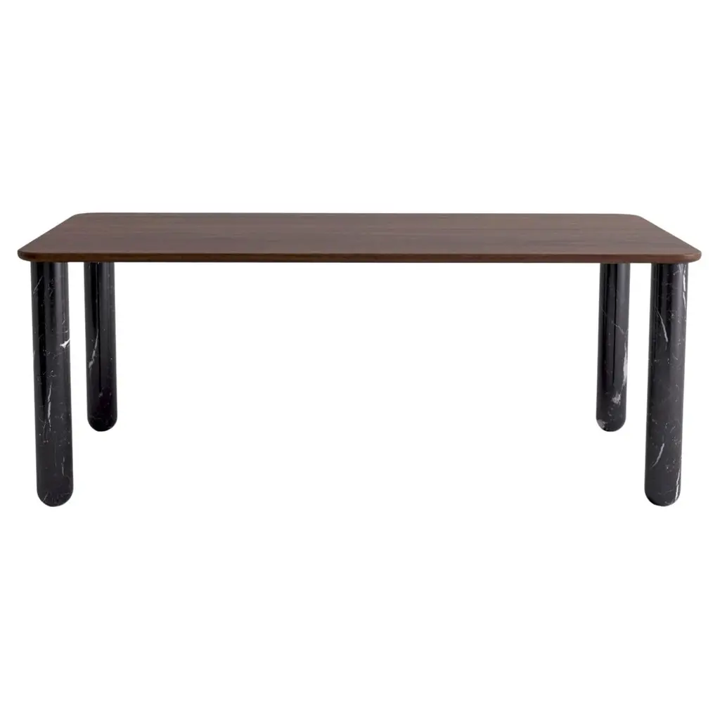 Squid M is a hexagonal die cast aluminium and Sahara Noir marble table.The name Squid is an instant reference to nature, referring to a “cuttlebone”, which sums up the unusual shape of the leg. This table adapts to different environments, from indoors to outdoors, from home to the office, from public spaces to catering; it is available in various shapes and sizes, it can accommodate tops not only in HPL but also in marble, plus it can be both fixed and extendible. Hence, Squid is like a complex system that involves the use of different materials and production technology. The result is a highly flexible and customisable product, but also simple to assemble and care for. The signature feature of this project is the leg in die-cast aluminium that, along with the metal frames in different shapes and sizes, results in a comprehensive and varied collection of tables. From an aesthetic point of view, it revolutionises the traditional interpretation of the “flat” leg in favour of a more original “cuttlebone” shape, which resulted in the name of the project. This makes the leg as light in its shape, as it is solid in its material. The slight change in the lengthwise surface that can be seen on the front has two purposes: to add a “ridge” to the leg to make it sturdier and create an interesting contrast of light and shadows. The metal tubular frame completes the structural part of the project and is sized, so that it can also include extra-large tables with heavy tops in marble without compromising its stability.