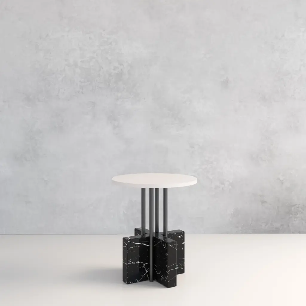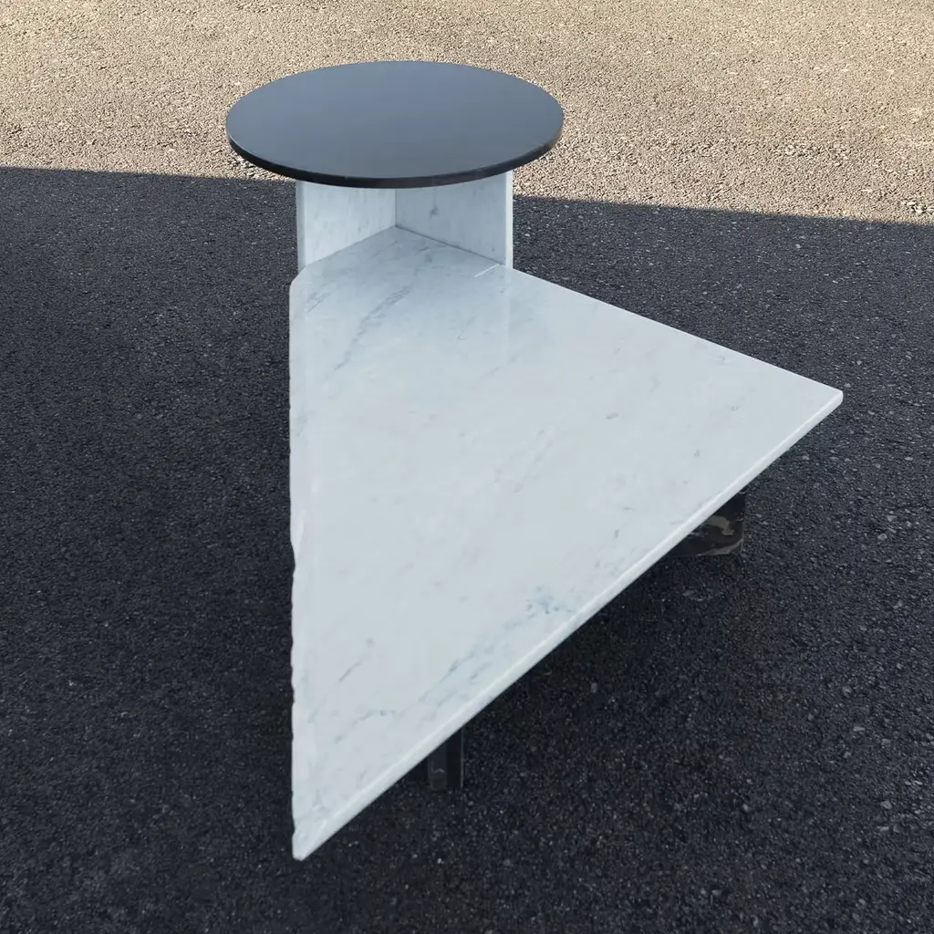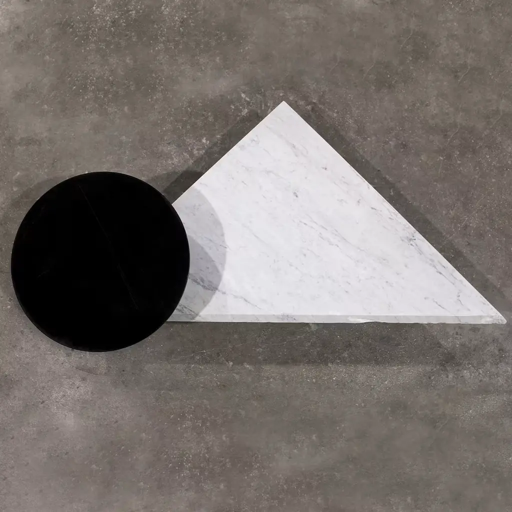 This is a statement piece that is beautifully balanced in geometric shape, form, and the choice of marble. The singular low table is made of Carrara, a subtle beauty, emphasized by the rotatable spherical top. The combination of Marquina and Carrara marbles makes this set a unique piece.