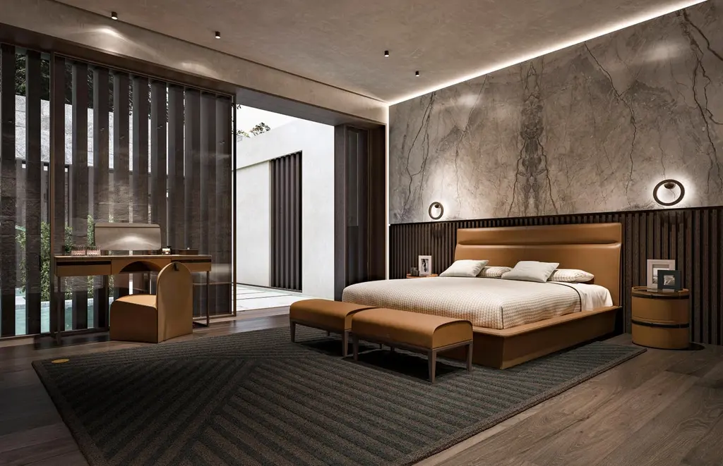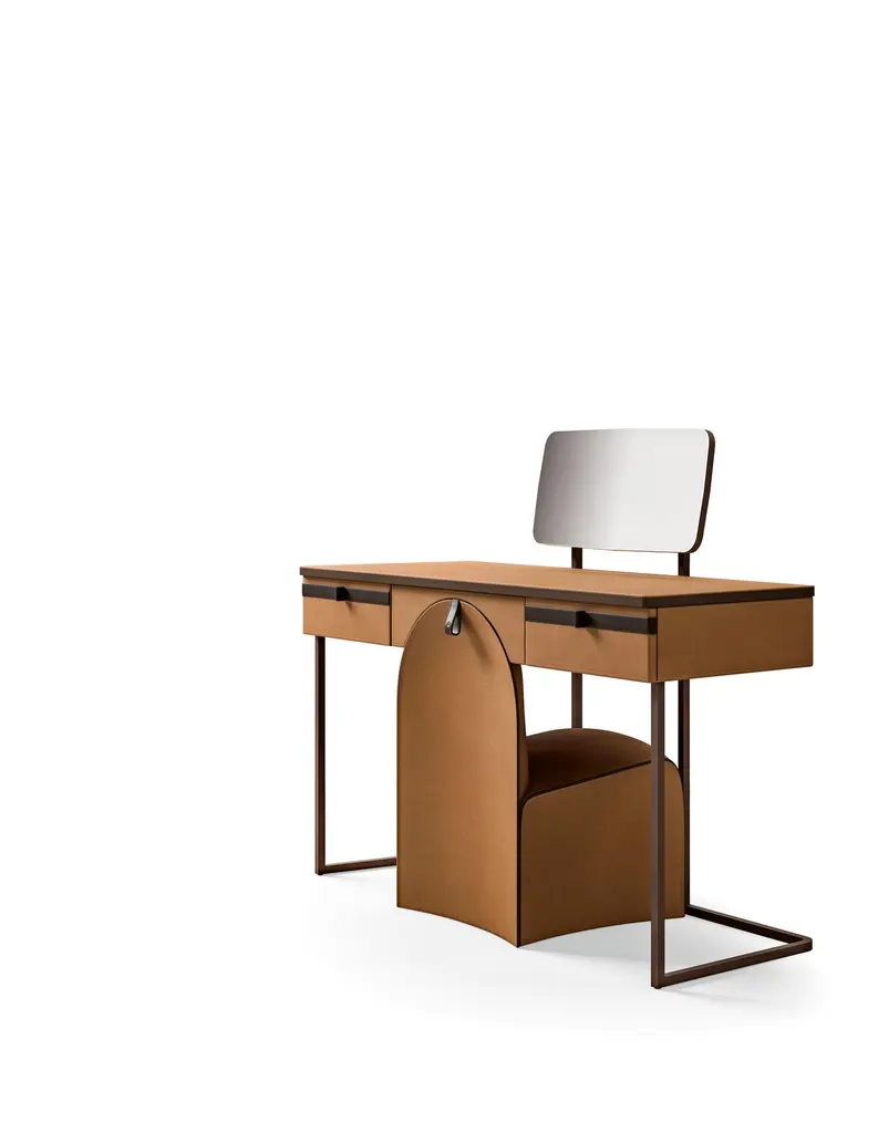 A vanity table fully covered in saddle leather, featuring a sleek metal base. The table has an elegant, contemporary design with smooth saddle leather upholstery that gives it a luxurious and refined look. The metal base is sturdy yet modern, providing a sophisticated contrast to the softness of the saddle leather. It includes an integrated mirror, seamlessly blending into the design of the table. The combination of saddle leather and metal creates a stylish and functional piece of furniture, perfect for a chic and modern dressing area.