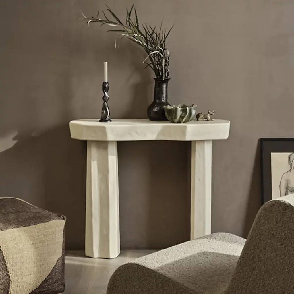 The Staffa Console Table by Ferm Living draws inspiration from the unique volcanic rock formations of Scotland's Staffa Island and pays homage to its namesake, meaning "pillar" in Old Norse. Crafted entirely from glass fiber-reinforced concrete, each piece undergoes an innovative casting process to achieve a rough, uneven shape reminiscent of carved stone blocks. Suitable for indoor and outdoor use, this console table merges artistry with utility, making it a striking addition to any entryway, hallway, or outdoor space. Its sculptural and stately character enhances any area, creating a captivating focal point.