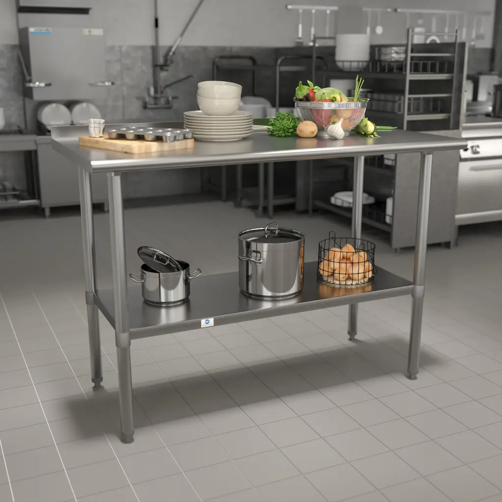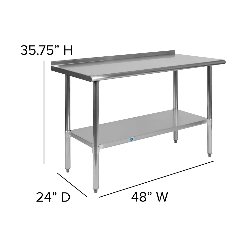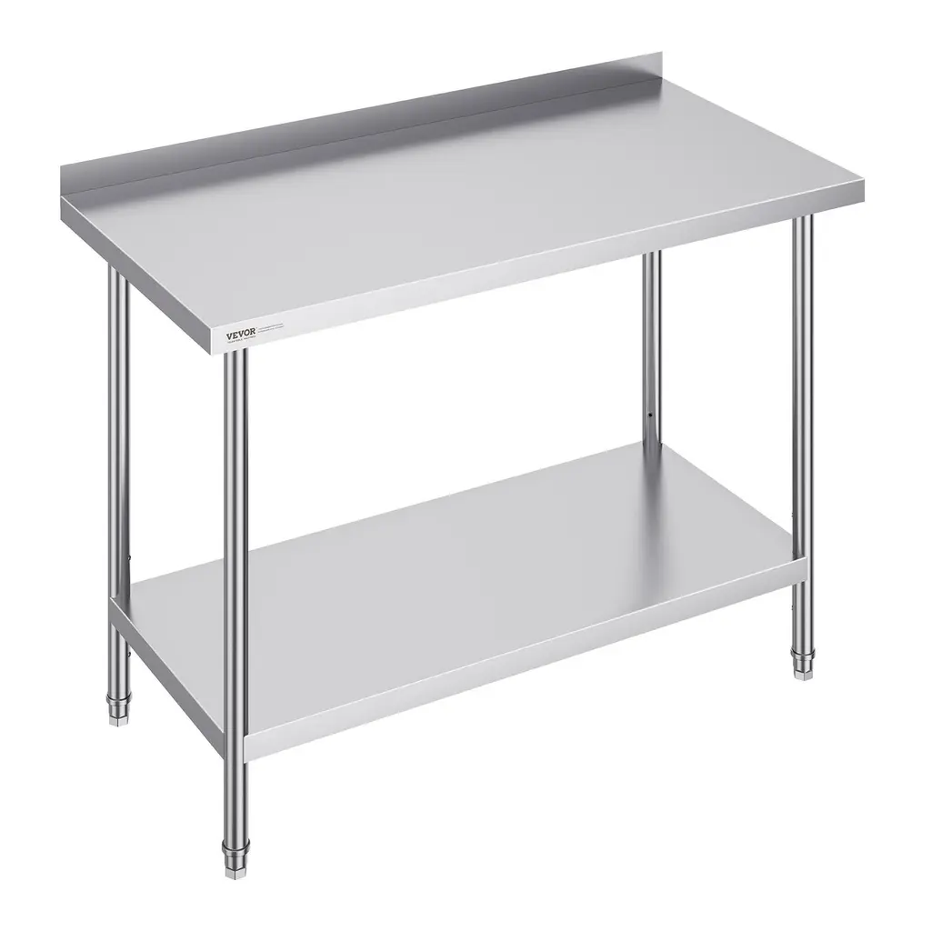 Give yourself some extra space for catering parties or setting up the buffet line at your eatery or bistro and increase functionality in your busy restaurant kitchen with this commercial kitchen prep and work table with adjustable undershelf and backsplash. This steel commercial work table is a great space for bulk food preparation for businesses such as daycares, hotels and restaurants. This versatile steel table can be placed against a wall or used as a freestanding kitchen island. The 1.5" backsplash helps keep your walls free of food debris and prevents items from rolling away reducing breakage and waste. Strength and durability are important factors when choosing equipment. Made from quality stainless steel, this metal utility table resists corrosion and holds up to 600 lbs. weight capacity while the undershelf holds up to 200 lbs. This commercial grade work table is certified to NSF quality standards reducing the chance of foodborne illness. Not only for kitchen use, this stainless prep table can be used in an outdoor kitchen away from the elements on a covered patio or deck, as a planting station in your greenhouse or a work surface in your garage. Rounded corners prevent scrapes and cuts and this multi-use work table easily assembles in under 10 minutes with the included tools. Adjustable feet move up to 1" to keep you level on uneven flooring. Remove any traces of food contaminants with water and a neutral detergent followed by a dry cloth to keep this shiny piece looking new.