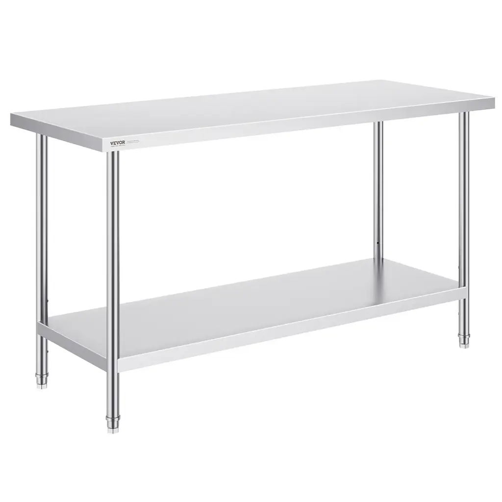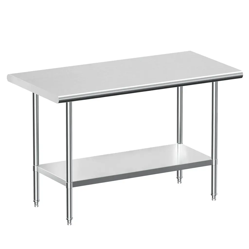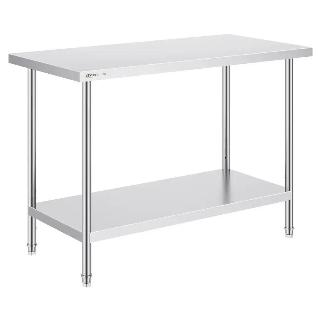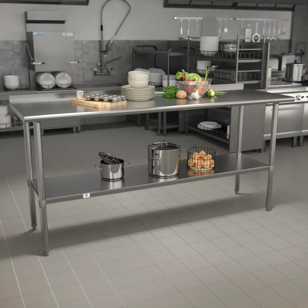 Give yourself some extra space for catering parties or setting up the buffet line at your eatery or bistro and increase functionality in your busy restaurant kitchen with this commercial kitchen prep and work table with adjustable undershelf and backsplash. This steel commercial work table is a great space for bulk food preparation for businesses such as daycares, hotels and restaurants. This versatile steel table can be placed against a wall or used as a freestanding kitchen island. The 1.5" backsplash helps keep your walls free of food debris and prevents items from rolling away reducing breakage and waste. Strength and durability are important factors when choosing equipment. Made from quality stainless steel, this metal utility table resists corrosion and holds up to 600 lbs. weight capacity while the undershelf holds up to 200 lbs. This commercial grade work table is certified to NSF quality standards reducing the chance of foodborne illness. Not only for kitchen use, this stainless prep table can be used in an outdoor kitchen away from the elements on a covered patio or deck, as a planting station in your greenhouse or a work surface in your garage. Rounded corners prevent scrapes and cuts and this multi-use work table easily assembles in under 10 minutes with the included tools. Adjustable feet move up to 1" to keep you level on uneven flooring. Remove any traces of food contaminants with water and a neutral detergent followed by a dry cloth to keep this shiny piece looking new.