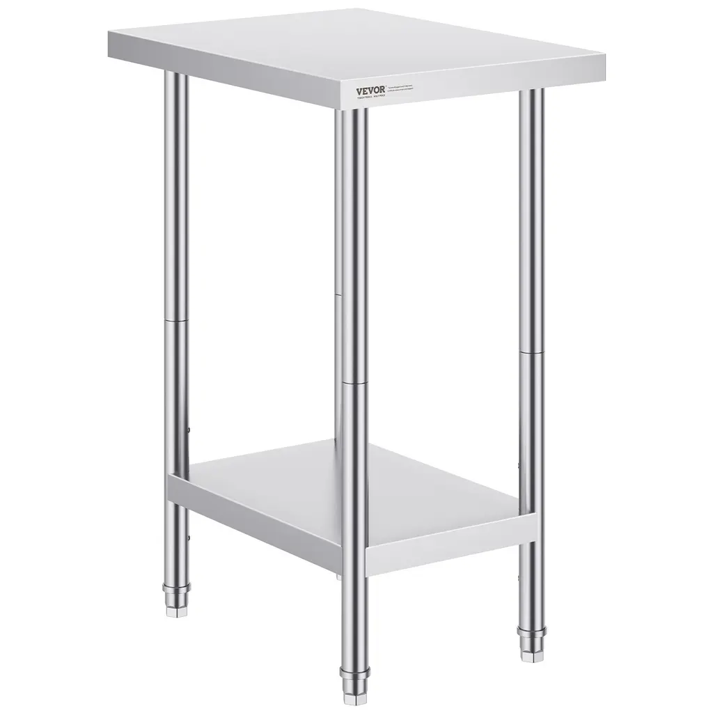 This stainless steel workbench is suitable for the kitchen, garage, workshop, bar, restaurant, laundry room, school, hospital, warehouse and other places that accommodate for workbench, dinner table, laundry table. The bottom shelf has 3 levels for height adjustment, allowing you to place your microwave, meat grinder and other appliances more freely. The thickened columns feature a triangle support design, which improves the durability and stability of this table. The stainless steel table uses high-quality 201 stainless steel material, corrosion-resistant, rust-resistant, easy to clean, and with a long lifespan. With the wire-drawing surface, this table offers a beautiful appearance. The smooth edges can keep your hand from getting hurt. 0.6MM thickened stainless steel plate with thickened tubing and high-quality fittings provides a total of 840 LB load bearing. It meets the needs of a wide range of uses such as storing items and daily operations for both commercial and domestic use.