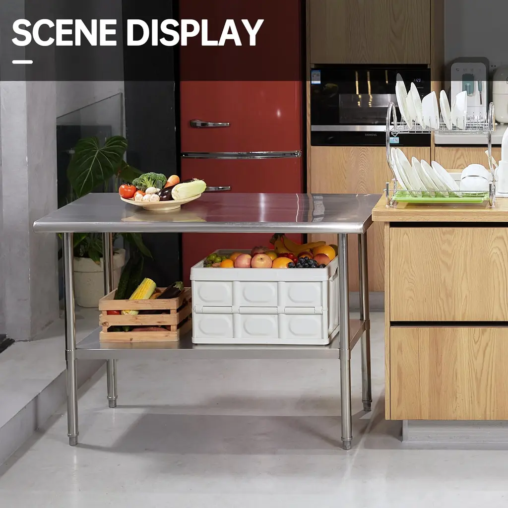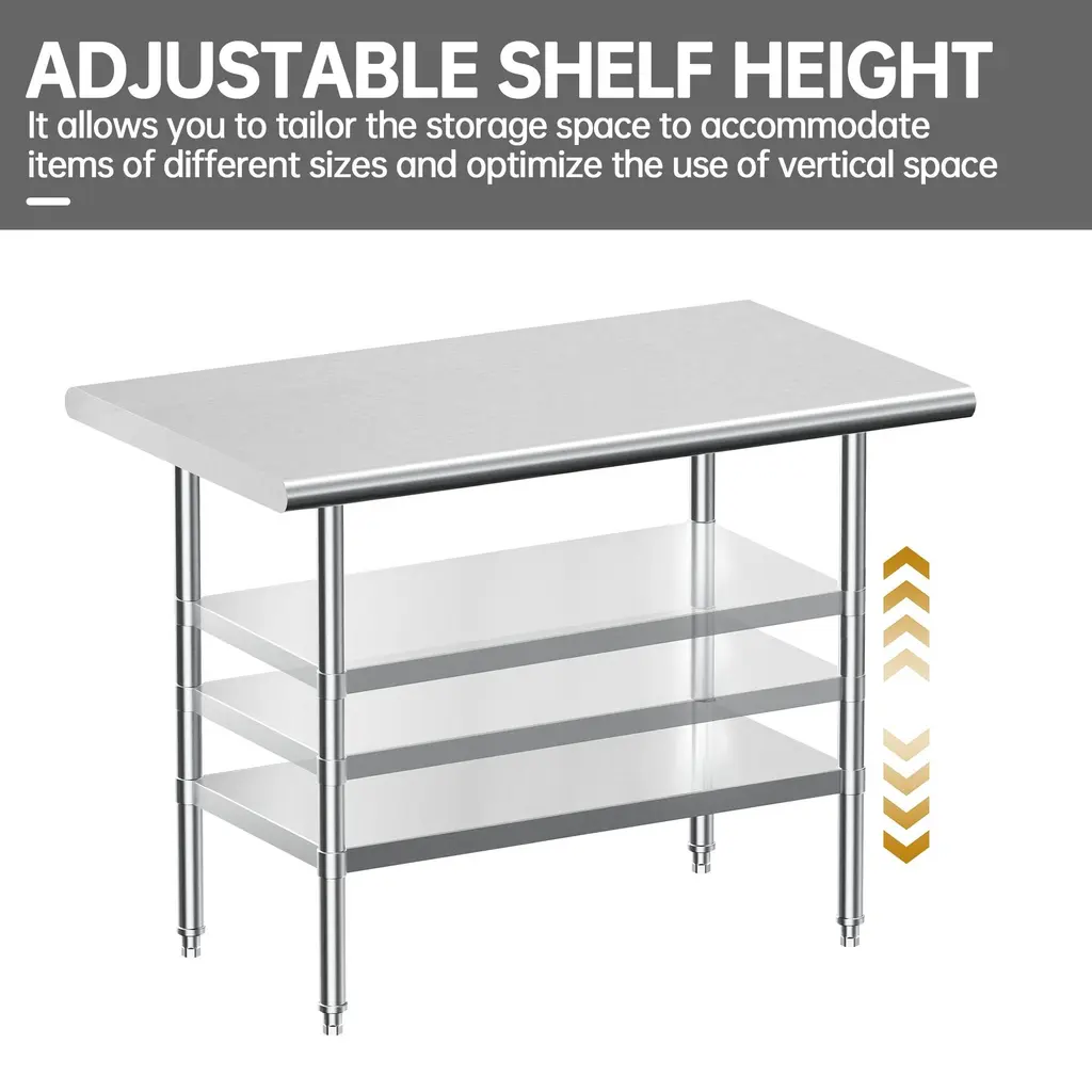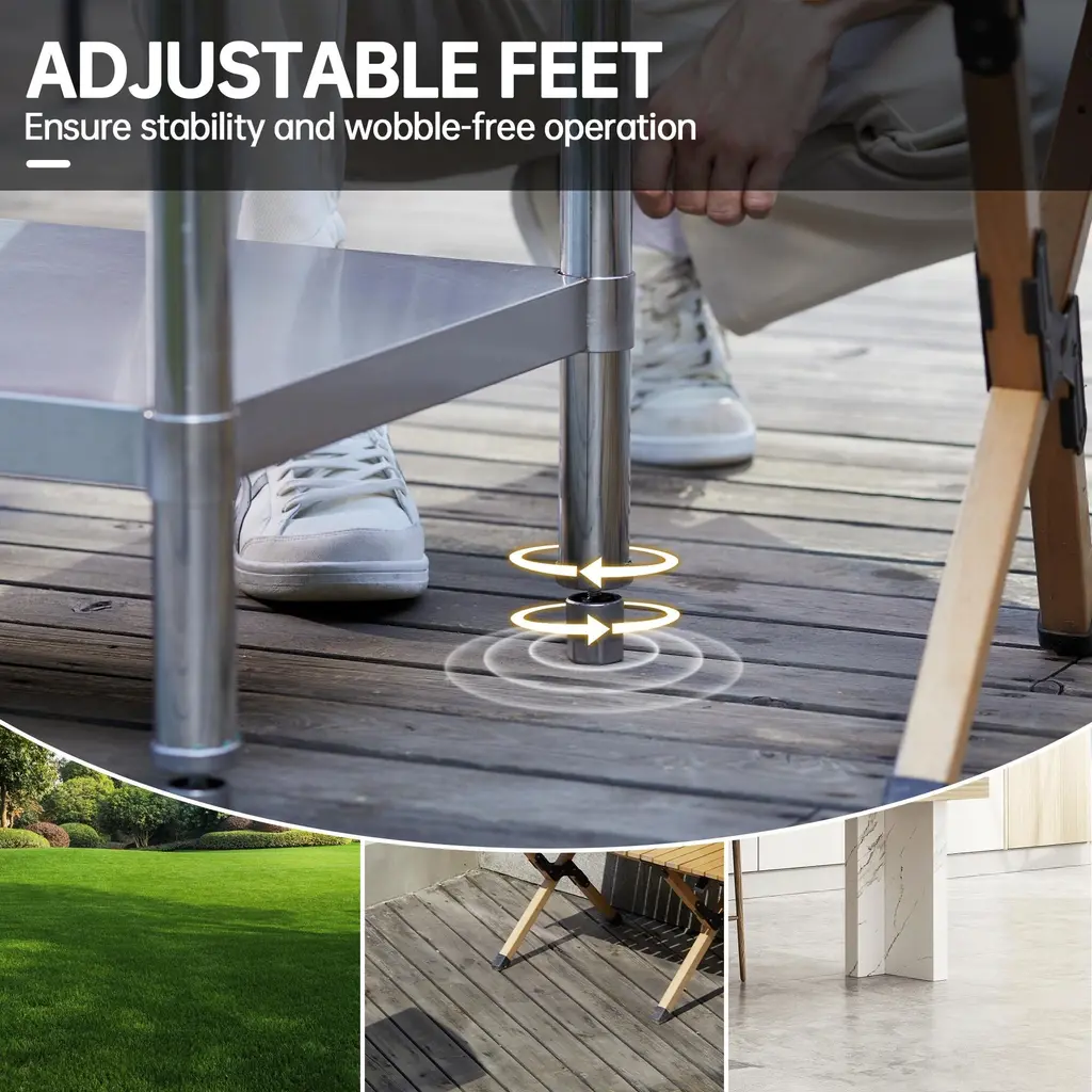 This workbench is made of stainless steel which is rich in various designs, the table is designed with rounded corners to avoid bumps and injuries. The table top is brushed and polished for a smooth finish that is easy to clean, and the adjustable base and legs provide the height you need and keep the table stable. We also have an NSF certified work table for commercial and home use.1.NSF-certified table can better guarantee your health.2.Rounded corner design: The table is designed with rounded corner to prevent injury.3.Stability: Adjustable feet ensure stability on uneven surfaces.4.Adjustable height: The height of the undershelf can be adjusted to your needs.5.Easy to clean: Smooth tabletop surface is easy to clean.