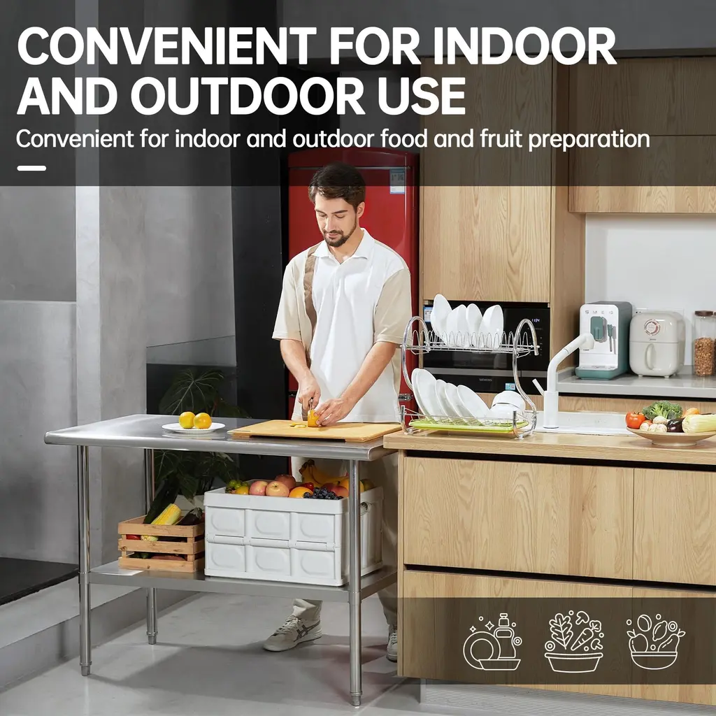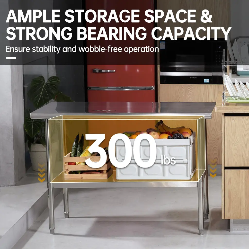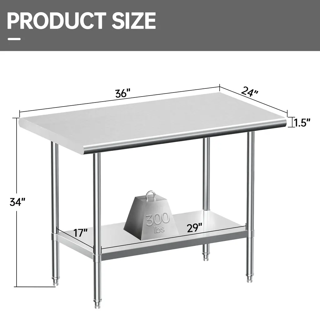 This workbench is made of stainless steel which is rich in various designs, the table is designed with rounded corners to avoid bumps and injuries. The table top is brushed and polished for a smooth finish that is easy to clean, and the adjustable base and legs provide the height you need and keep the table stable. We also have an NSF certified work table for commercial and home use.1.NSF-certified table can better guarantee your health.2.Rounded corner design: The table is designed with rounded corner to prevent injury.3.Stability: Adjustable feet ensure stability on uneven surfaces.4.Adjustable height: The height of the undershelf can be adjusted to your needs.5.Easy to clean: Smooth tabletop surface is easy to clean.