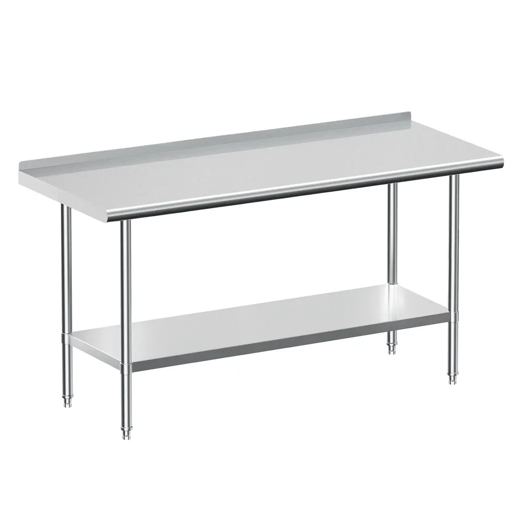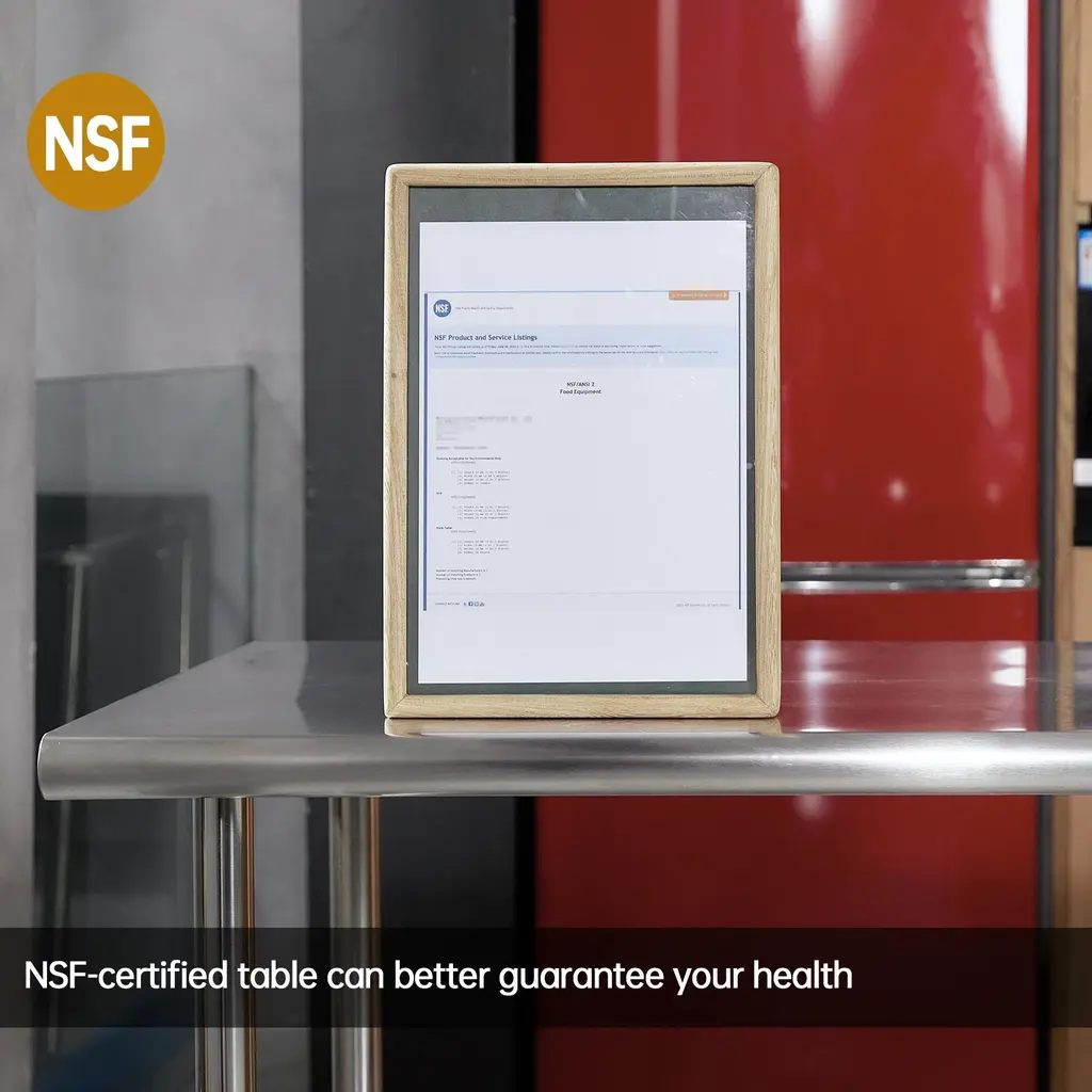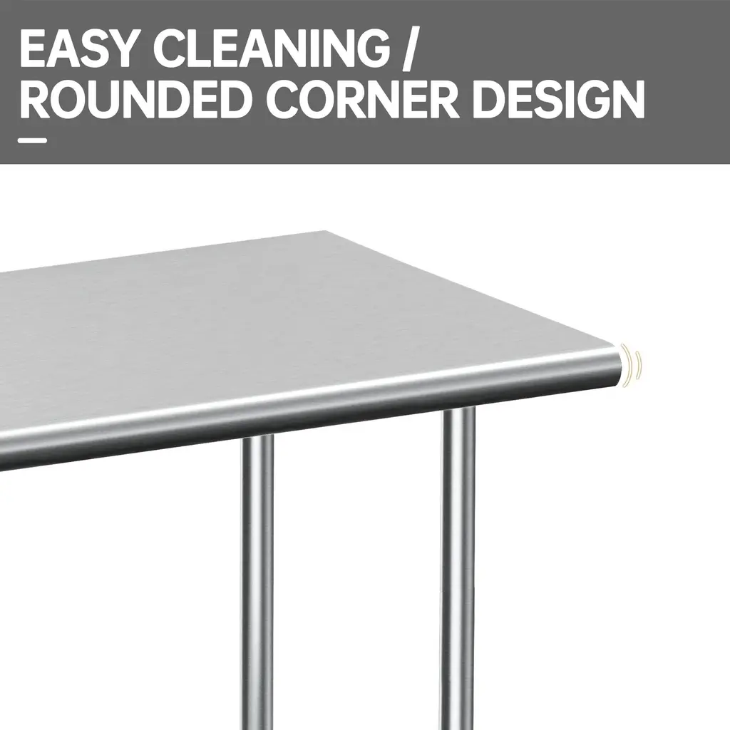 This workbench is made of stainless steel which is rich in various designs, the table is designed with rounded corners to avoid bumps and injuries. The table top is brushed and polished for a smooth finish that is easy to clean, and the adjustable base and legs provide the height you need and keep the table stable. We also have an NSF certified work table for commercial and home use.1.NSF-certified table can better guarantee your health.2.Rounded corner design: The table is designed with rounded corner to prevent injury.3.Stability: Adjustable feet ensure stability on uneven surfaces.4.Adjustable height: The height of the undershelf can be adjusted to your needs.5.Easy to clean: Smooth tabletop surface is easy to clean.