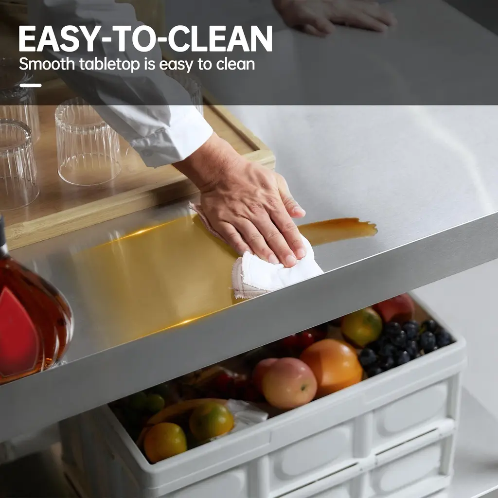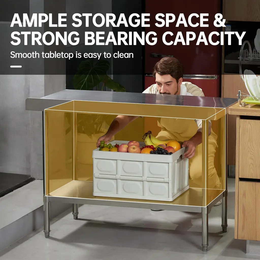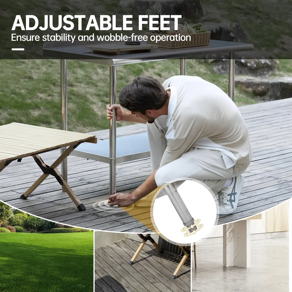 This workbench is made of stainless steel which is rich in various designs, the table is designed with rounded corners to avoid bumps and injuries. The table top is brushed and polished for a smooth finish that is easy to clean, and the adjustable base and legs provide the height you need and keep the table stable. We also have an NSF certified work table for commercial and home use.1.NSF-certified table can better guarantee your health.2.Rounded corner design: The table is designed with rounded corner to prevent injury.3.Stability: Adjustable feet ensure stability on uneven surfaces.4.Adjustable height: The height of the undershelf can be adjusted to your needs.