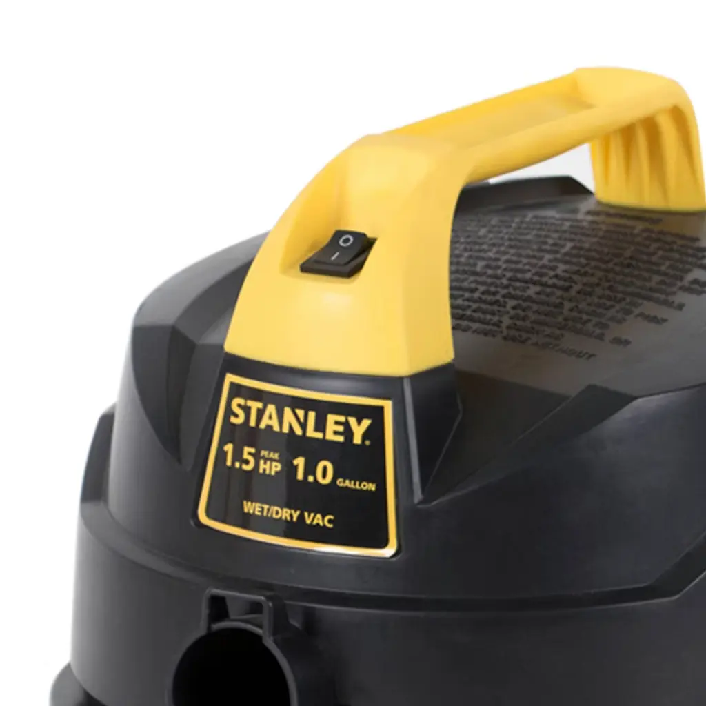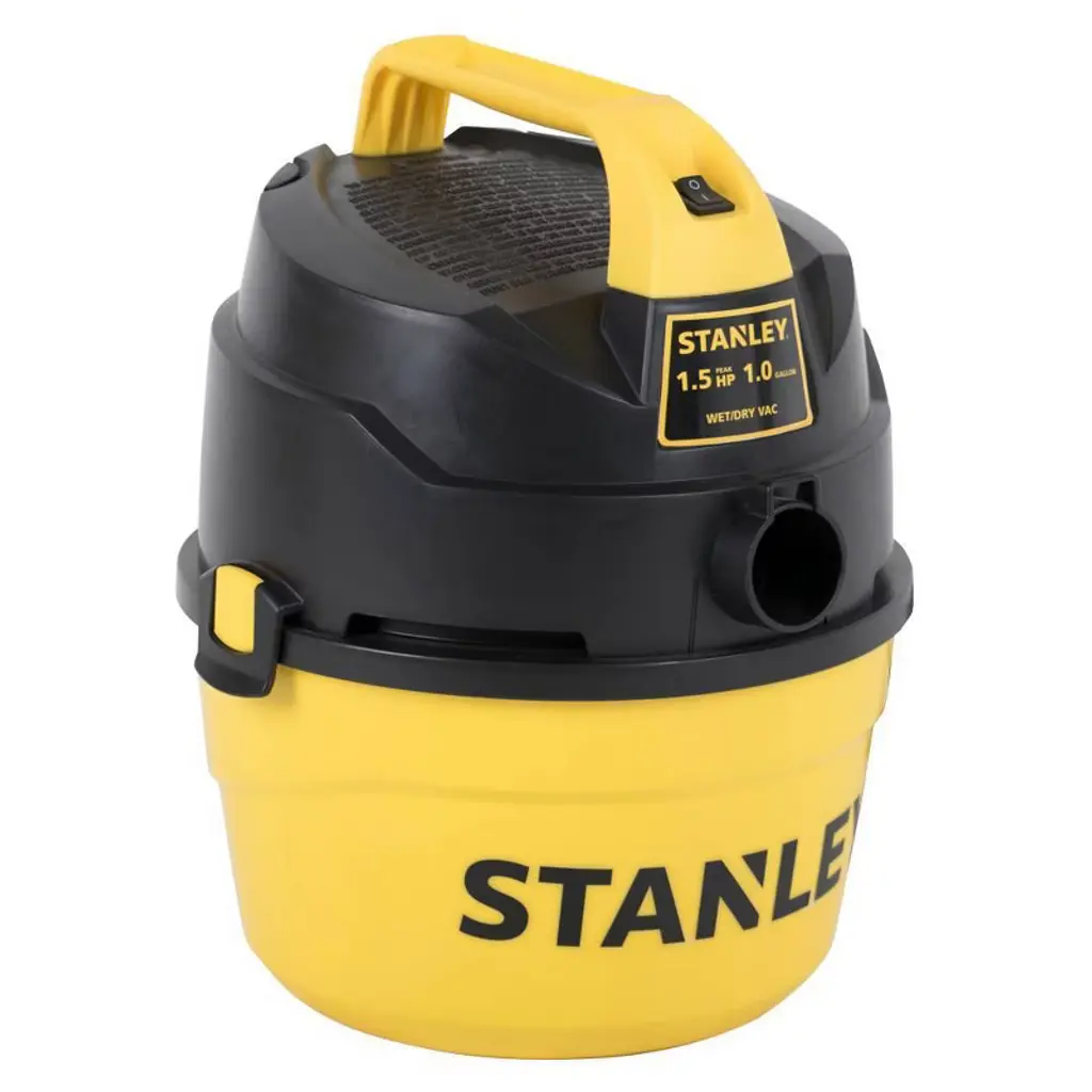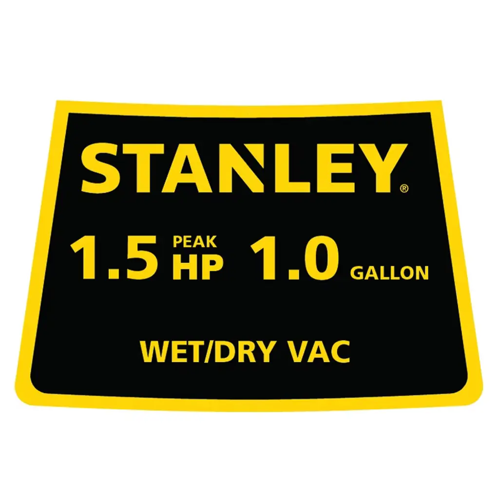 This Stanley 1gal. 1.5 peak horsepower, wall mounted wet/dry vacuum features a high performance motor which provides maximum suction power. The light weight and compact design is ideal for easy carrying. The 6 ft. power cord with cord wrap design aids in organization. Accessories included: 1 in. to 1/4 in. x 4 ft. flexible hose, crevice nozzle, utility nozzle, reusable dry filter, foam filter, and wall mount. Tank capacity refers to actual tank volume and does not reflect capacity available during operation. Peak Horsepower" (PHP) is a term used in the wet/dry vacuum industry for consumer comparison purposes. It does not denote the operational horsepower of a wet/dry vacuum but rather the horsepower output of a motor, including the motor's inertial contribution, achieved in laboratory testing. In actual use, motors do not operate at the peak horsepower shown.