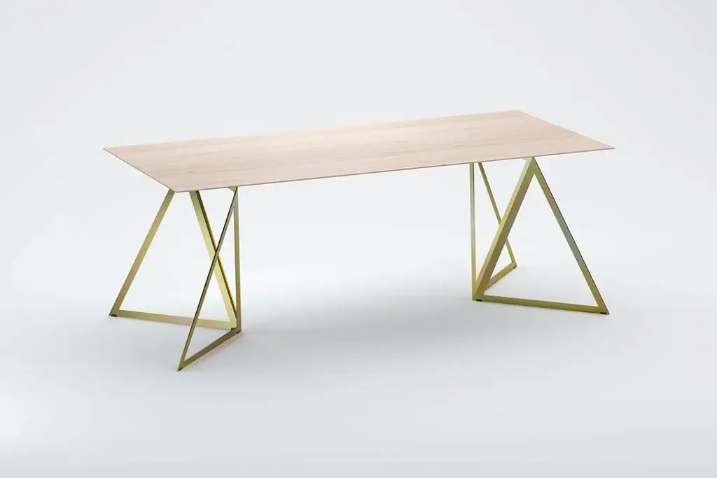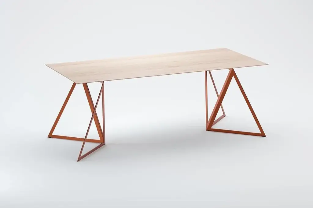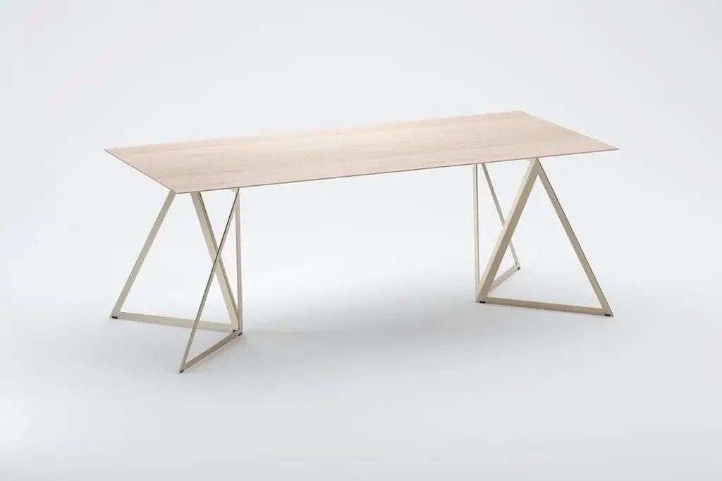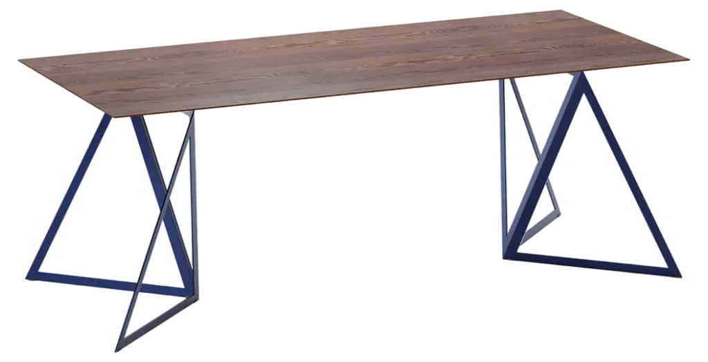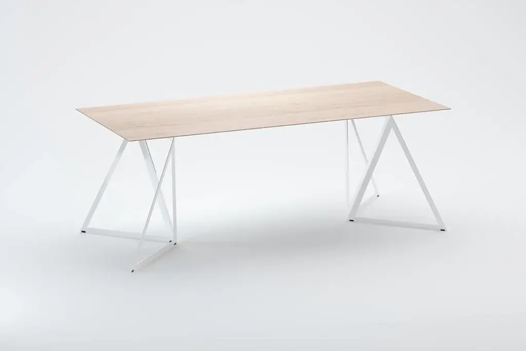 Steel stand table 200 ash by sebastian scherer dimensions: d 200 x w 90 x h 74 cm materials: ash, steel, wood also available: colours:solid wood (matt lacquered or oiled): black and white stained ash / natural oak / american walnut steel (matt): snow white / light sand / sun yellow / clay orange / rust red / space blue / graphite grey / dark bronze / ink black trestles galvanized steel : yellow (gold) / blue (silver). this piece is attributed to the mentioned designer/maker. It has no attribution mark and no official proof of authenticity, however it is well documented in design history. I take full responsibility for any authenticity issues arising from misattribution