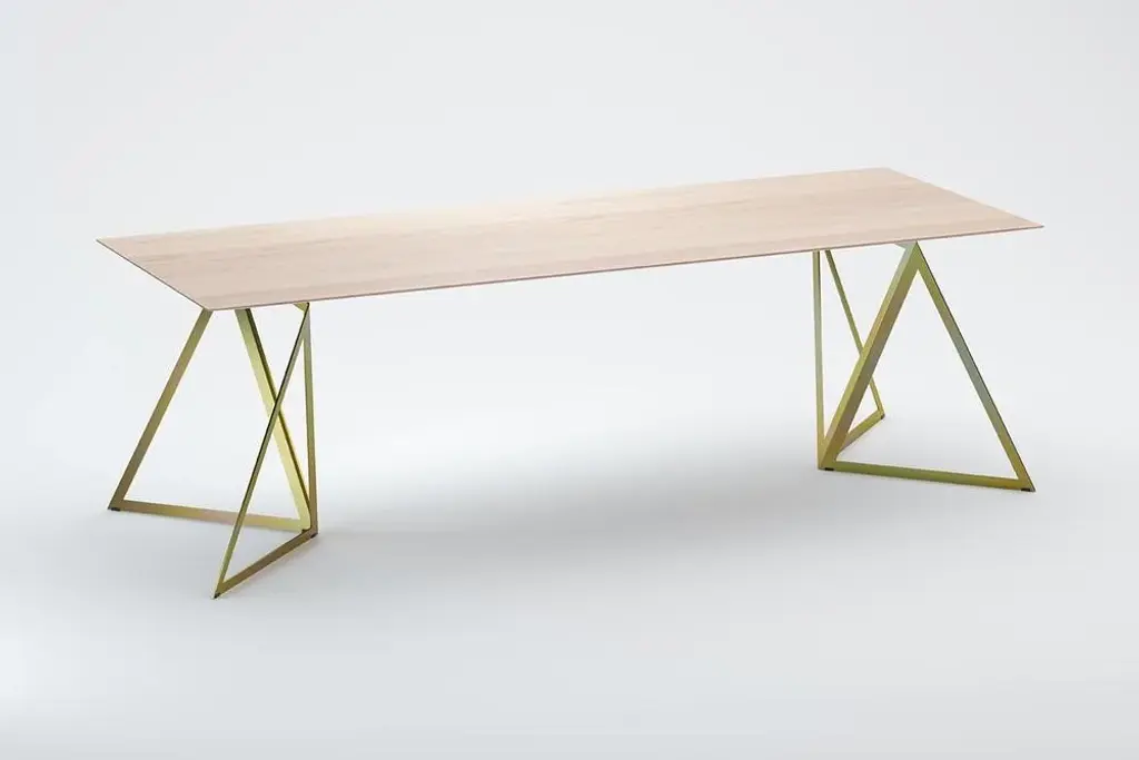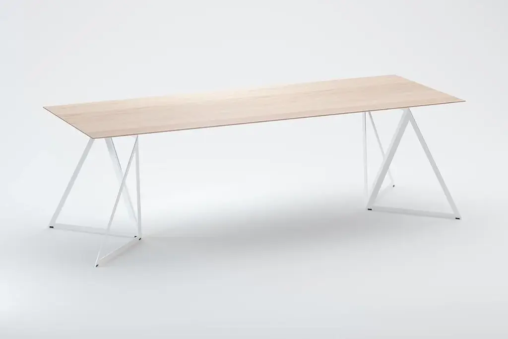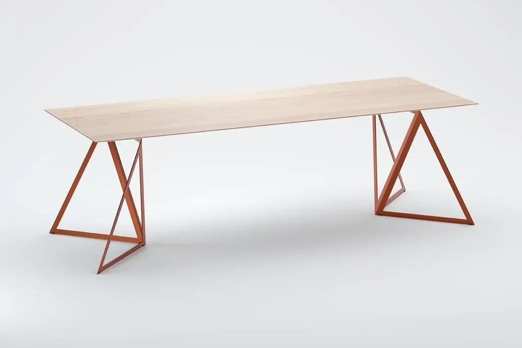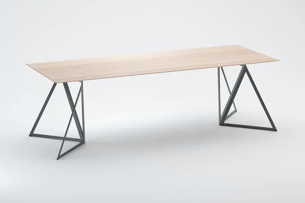 Steel stand table 240 ash by sebastian scherer dimensions: d240 x w90 x h74 cm materials: ash, steel, wood also available: colours:solid wood (matt lacquered or oiled): black and white stained ash / natural oak / american walnut steel (matt): snow white / light sand / sun yellow / clay orange / rust red / space blue / graphite grey / dark bronze / ink black trestles galvanized steel : yellow (gold) / blue (silver). this piece is attributed to the mentioned designer/maker. It has no attribution mark and no official proof of authenticity, however it is well documented in design history. I take full responsibility for any authenticity issues arising from misattribution