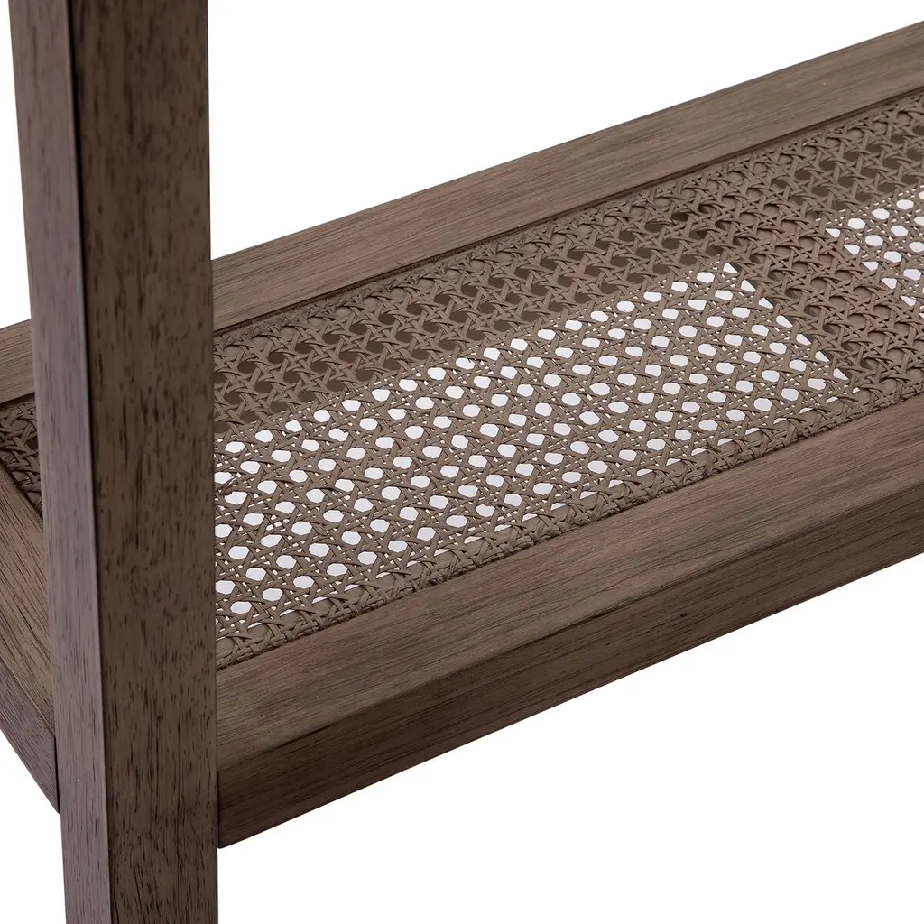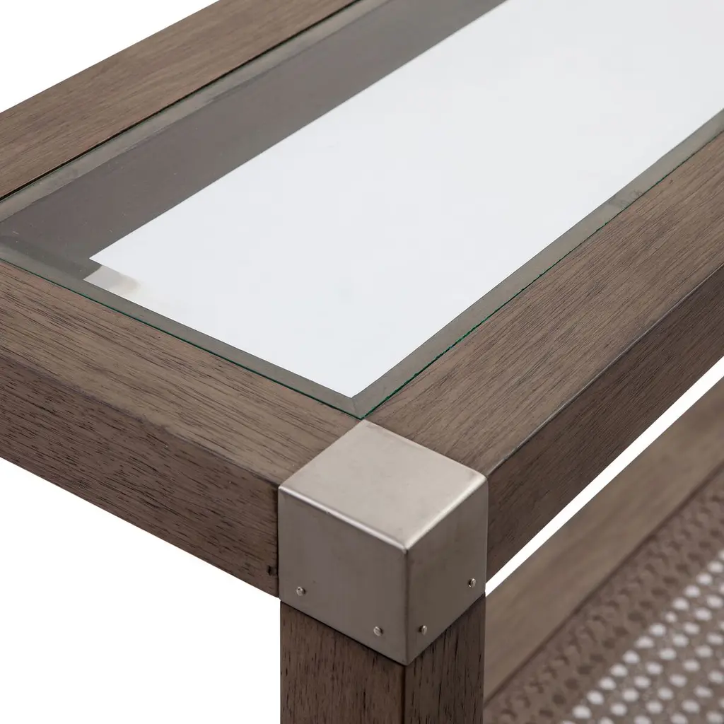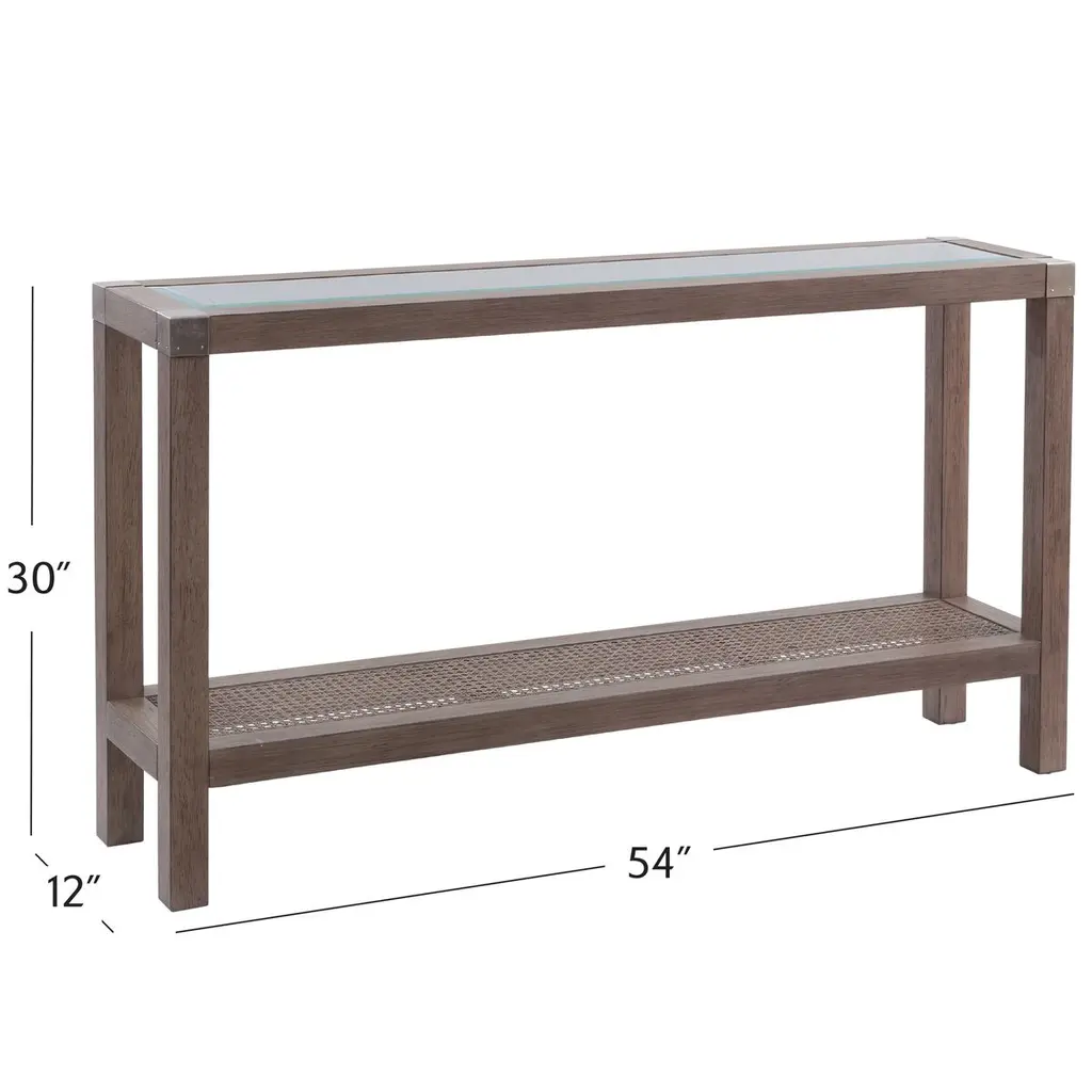 Introducing the Sterling Console Table, inspired by coastal farmhouse aesthetics. Crafted from solid wirebrushed rubberwood, it features clear tempered glass inset tops and charming cane inserts in the base. The neutral finish, complemented by corner cap detailing, brings tranquility to your space.