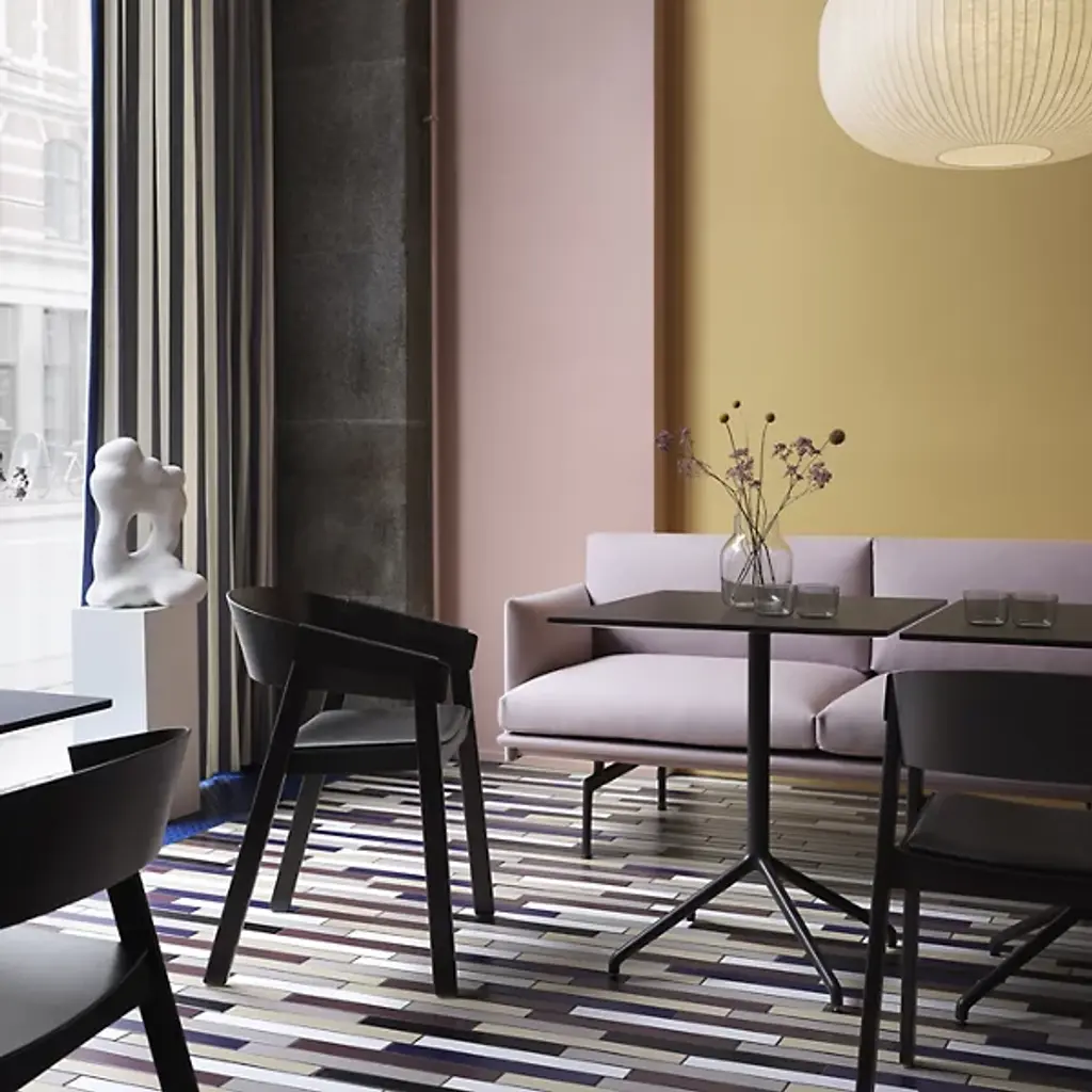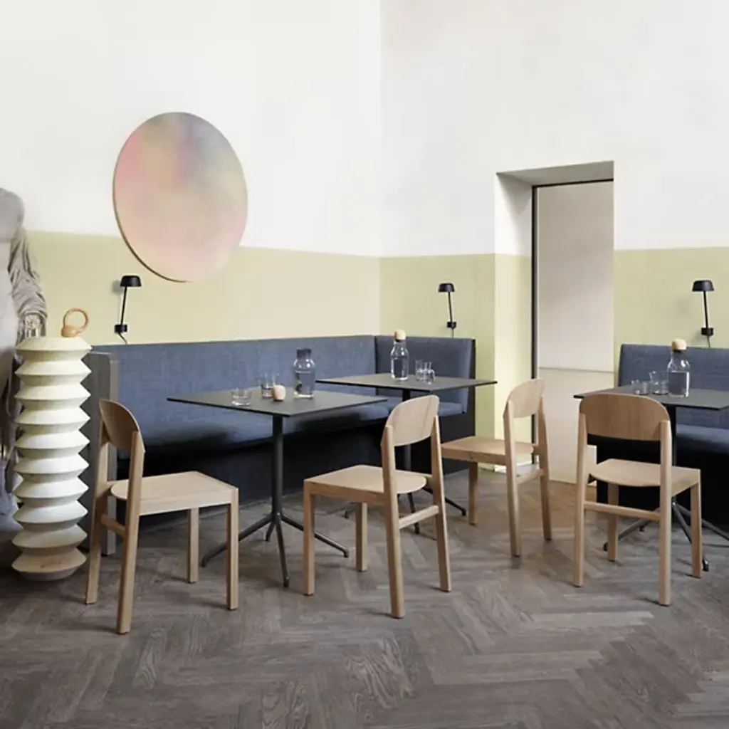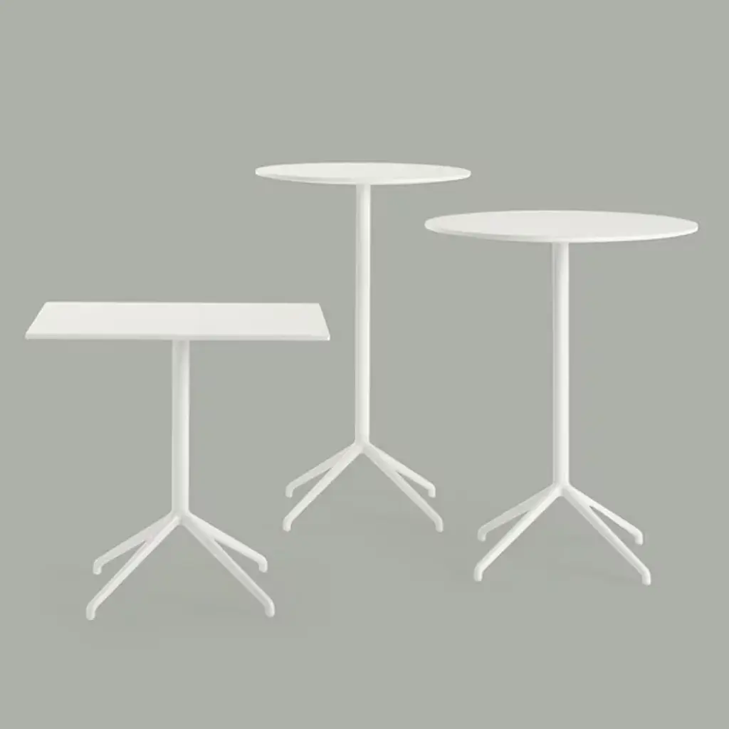 A subtle showcase of enchanting simplicity. The Still Cafe Table from Muuto presents a clean contemporary character. Secured by a four-legged base of slender, die-cast aluminum, it sends a single column stem of powder-coated steel up to a sturdy mounting plate of the same material that seats a slim but strong, square tabletop above. The matte, tactile texture of the metal contrasts well with the smoothness of the MDF top, creating a signature look that doesn’t overpower refined surroundings.