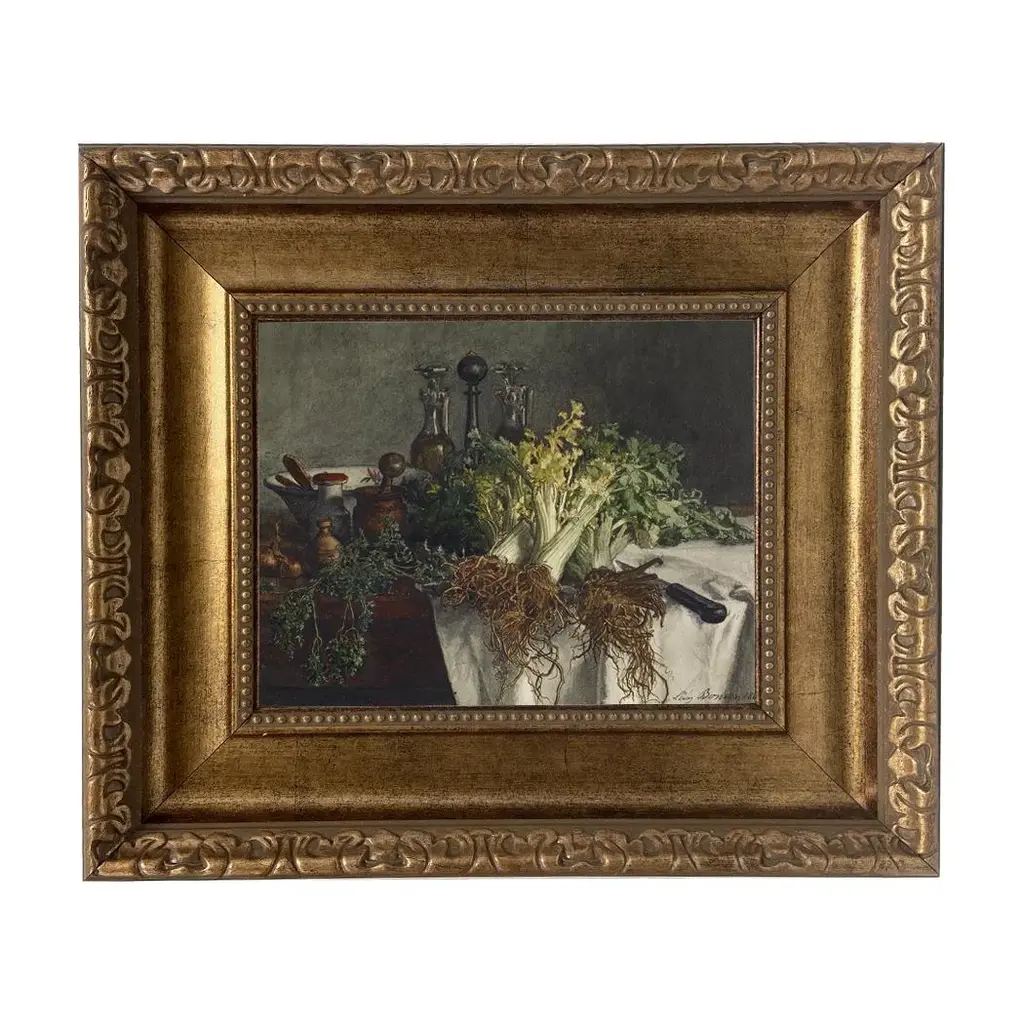 DESCRIPTION Accurately reproduced from the original work"Still Life on Kitchen Table" After Leon Bonvin, this antiqued print reproduction after is framed in the proper period frame. FRAMING 3-1/2" Antiqued gold resin frame Complete with flush-mounted sawtooth hanger installed on back. DIMENSIONS Painting Dimensions (in):8x10 Outside Frame Dimensions (in):16x14 SHIPPING Will ship within 1-3 business days.