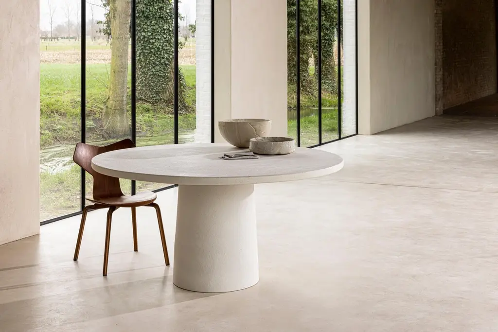Stone table by Studio LohoDimensions: D 120 x H 75 cmMaterials: clayAvailable in other sizes: From 120cm to 220cm.The table is made of two parts: a tabletop on a central pedestal. The tabletop is made of composite concrete, having mostly the same characteristics as natural stone. Studio LoHo is a Belgian design office located in Bruges, Belgium. Founded in the autumn of 2017 by Karel Loontiens and Jo Hoeven, the studio focused from the beginning on high-end bespoke interior projects which forms an ideal matrix for product - and material design that is both innovative and durable. In current times there’s no more room for influx of disposable products, it is our studio’s goal to strive for design that will last and will be cherished for multiple generations.The introduction of the first collection “clay series” fully articulated the DNA of the newborn Studio and led to their international breakthrough. The appreciation of materials reflects their unique view on interior design with a strong and recognizable signature. Soon after, the collection was expanded on request by other architects and designers with new sinks and bathtubs.Other collections of lighting, sofa’s and tables followed. While not only paying attention to the actual design, the studio concentrated also on the production process to be lean and therefore guarding the cost structure. This resulted in organizing the production process under their own supervision.