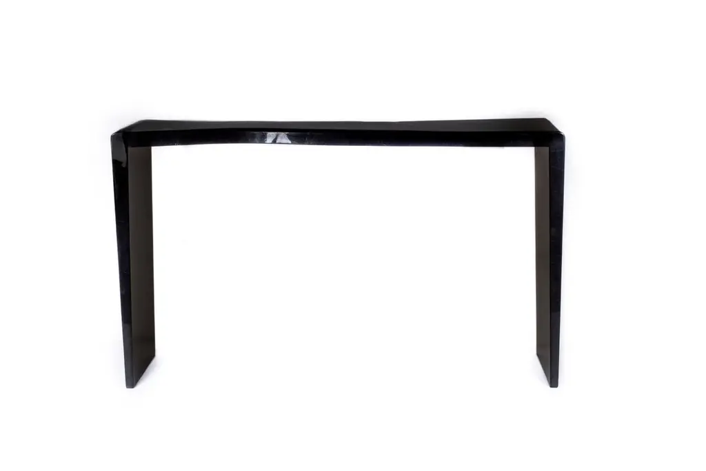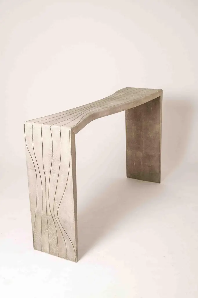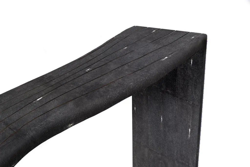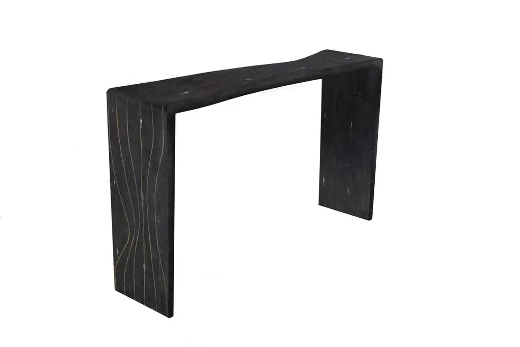 The Paris based label has distinguished themselves since their launch, with their iconic use of shagreen mixed with brass and other exotic materials. All furniture is handcrafted by skilled artisans, ultimately making each piece unique, designed in Paris and produced in the Philippines.The Storm Console is both simplistic and bold with it's design. The amorphous shape is inlaid in black pen shell, with thin and whimsical bronze-patina brass inserts to create the 'storm' inspired effect. Available in black shagreen and cream shagreen, image at end of slide. This piece is designed by Kifu Augousti the daughter of Ria and Yiouri Augousti. All shell pieces are hand-selected by artisans before being inlaid, making each piece a one of a kind.The dimensions of this piece are 150 x 35 x 90 cm / 59" x 13.77" x 35.5"All Kifu Paris pieces are handmade by artisans, ultimately making each piece unique. Custom color/sizing available on request. Wipe clean with soft dry cloth.Although inspired by her parents, her collection of Home Accessories and Furniture is a distinct identity of its own. Kifu uses handmade techniques of elaborate inlay patterns of shagreen, shells, semi-precious stones, materials she experienced as a child growing up in her parent’s studio, but interpreted in a younger quirkier way reflecting her youth. From her "jewelry inspired knobs" on decorative boxes, gold bar boxes and an extravagant inlay pattern mix of shagreen and shell inspired by galactic constellations, as seen on her enormous round mirror, is refreshing to see. Kifu embodies whimsical elements throughout her collection and is not afraid to be daring and unexpected in her approach to design. All shagreen-covered items should be kept out of direct sunlight, color variants may occur on the stingray and other exotic finishes, but this showcases the Parisian label's commitment to creating authentic luxurious products using natural components.