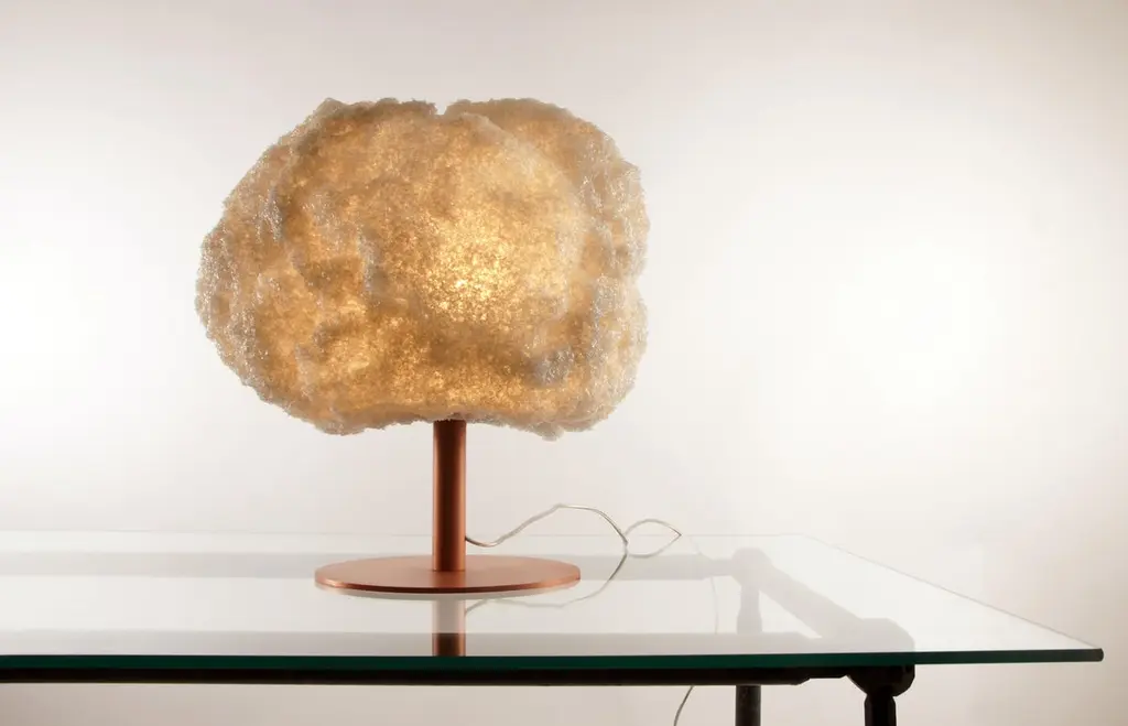 Storm table light copper by Johannes HemannMaterial: Polycarbonate, walnutDimensions: Ø 38 x H 45 cm.The Storm Series is by its concept the purest example of a process-design, where the designer seeks to set creative parameters to allow an object to shape itself, without any further direct involvement. The aim of this project is to create forms through storm winds. Johannes Hemann creates storm boxes, in which he releases storms from high pressure air . The storm is the base of the project: ‘the silence before the storm’. The ma- terial lies on the bottom of the box – ‘standstill’ – the air comes in, the storm begins and the energy is transferred from the wind to the material. ‘The wind stops’ - the form has been shaped and the silence after the storm sets in. The storm energy is then visible in the shape. Each piece is unique, as each generated storm finds different expressions.All our lamps can be wired according to each country. If sold to the USA it will be wired for the USA for instance.