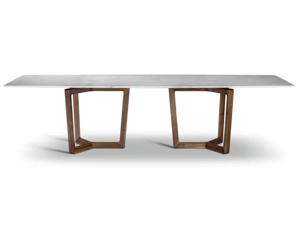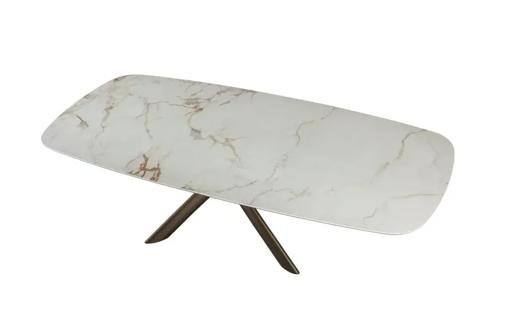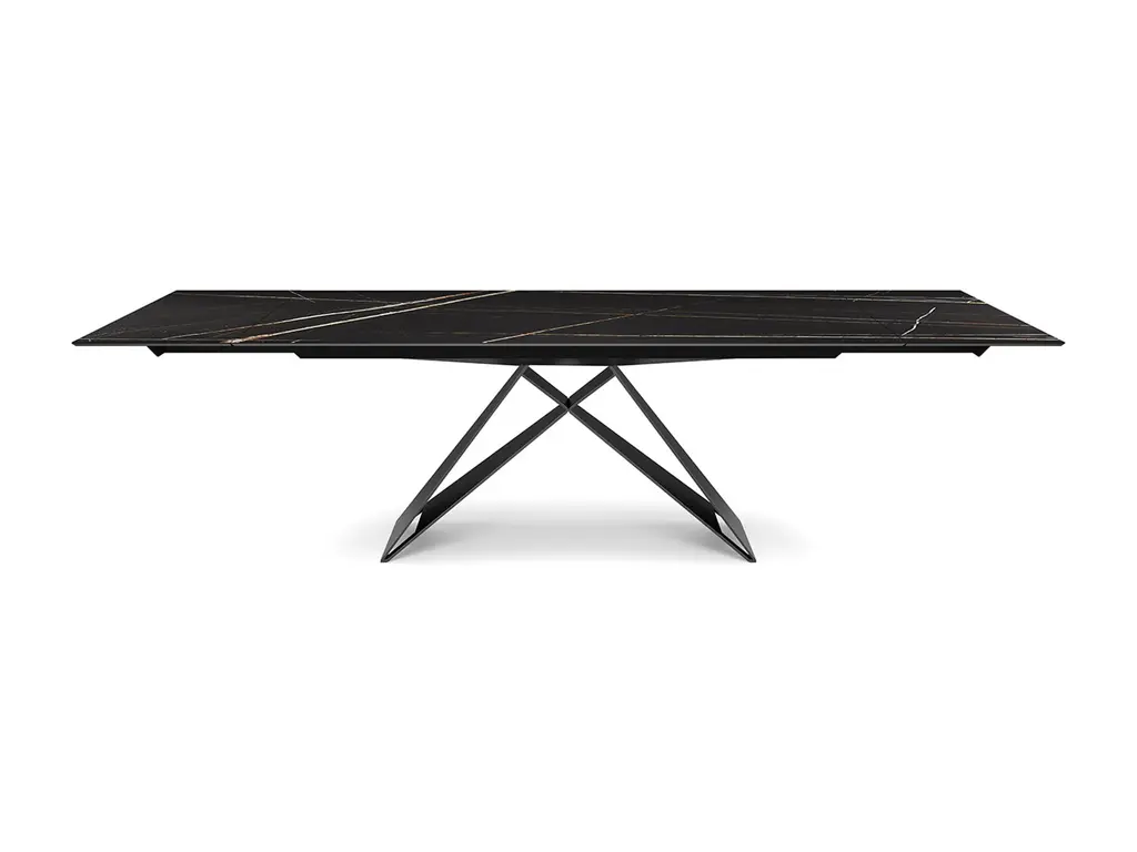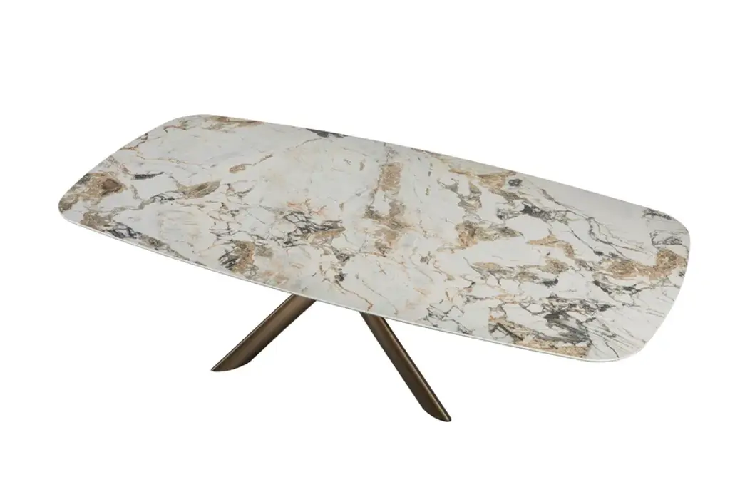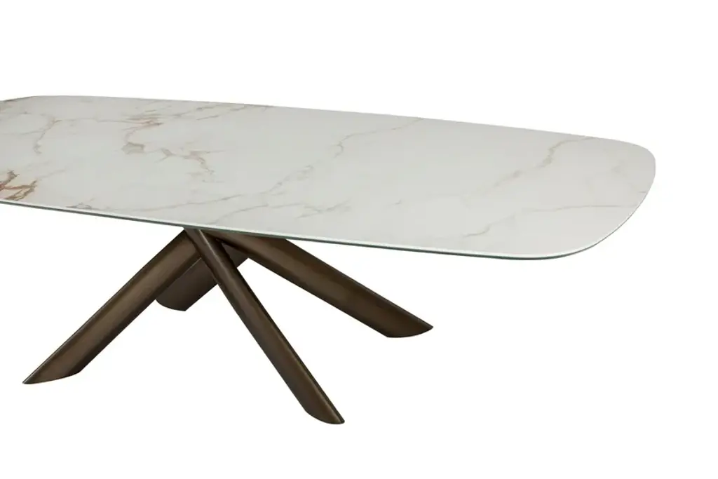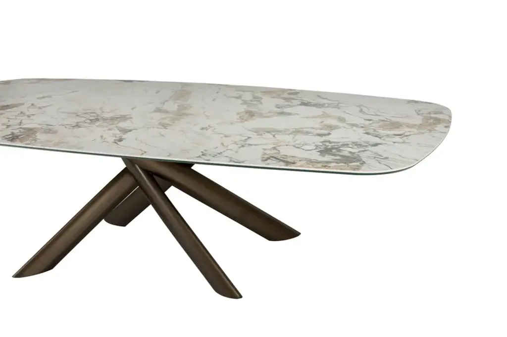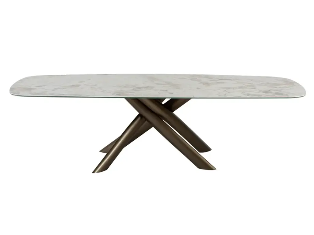 Style is the peculiarity of this new and exclusive table that stands out for an articulated aesthetic, an unicum that blends the interwoven shapes of the sumptuous base to the refined design of the porcelain stoneware tops.FinishesTop: onyx grey porcelain stoneware, statuario altissimo porcelain stoneware, Portoro porcelain stoneware, onyx amber porcelain stoneware, Emperador porcelain stoneware.Base: matt white, carbon grey, matt stone bronze, matt gold.
