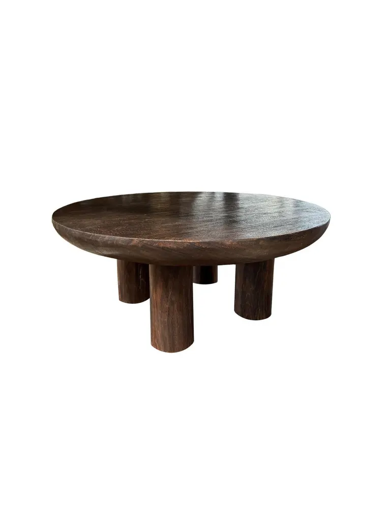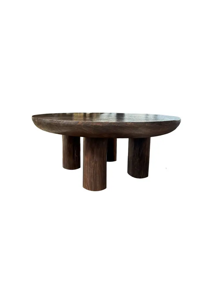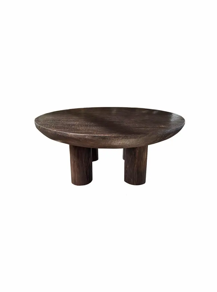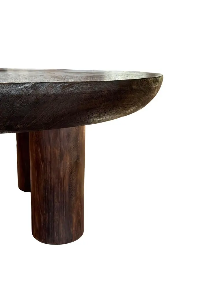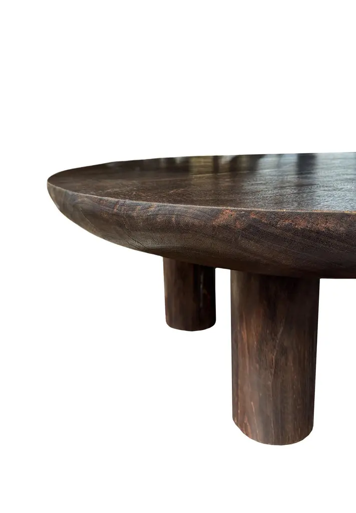 Crafted with timeless sophistication, this round table showcases the natural beauty and richness of solid suar wood. Its gracefully sculpted silhouette features a stunning tabletop with organic, flowing curves that highlight the unique grain patterns and tonal variations of the wood. The dark brown espresso finish (burnt several times) enhances its depth and character, lending a warm, luxurious presence to any space. Supporting the table are four sleek cylindrical legs, each thoughtfully designed to provide both visual balance and structural stability. The interplay of soft curves and clean geometry gives the piece a contemporary edge while maintaining its organic charm. Perfect as a refined centerpiece for a living area, this suar wood table effortlessly blends elegance with artisanal craftsmanship.
