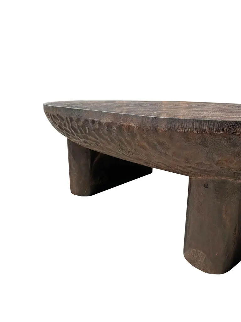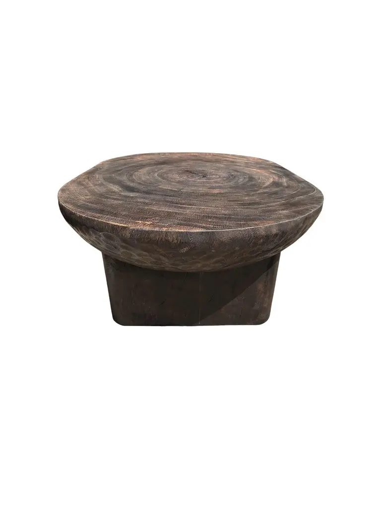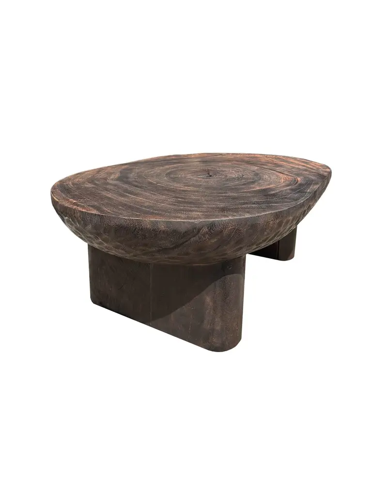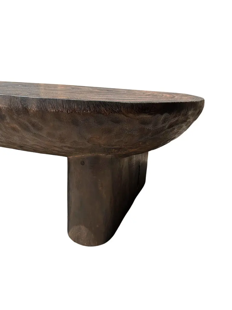 A wonderfully sculptural table crafted from suar wood. To achieve its pigment the wood was burnt numerous times and then finished with a clear coat. The mix of wood textures and shades adds to its charm. The table top was crafted from a single slab of wood and features hand-hewn detailing on its underside. The "Espresso" finish is in reference to the tone which is a mix of various shades of brown & hints of black. This table is customizable