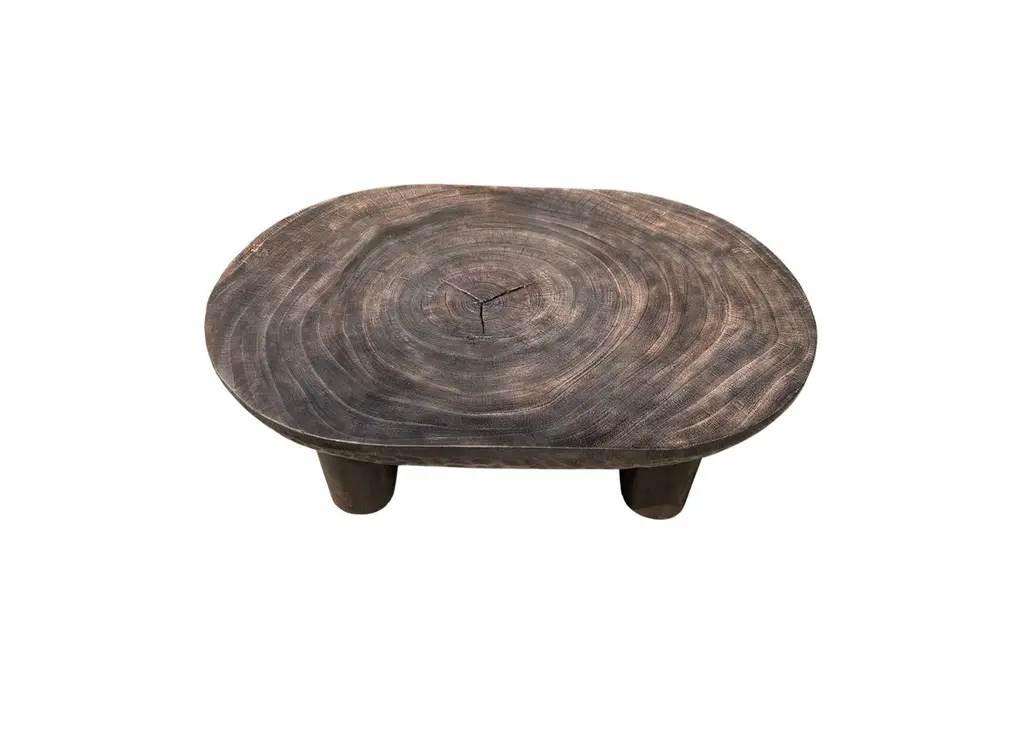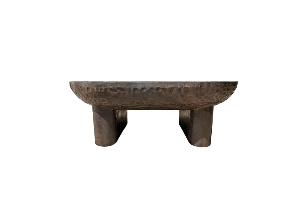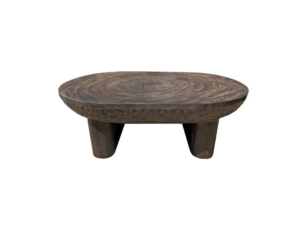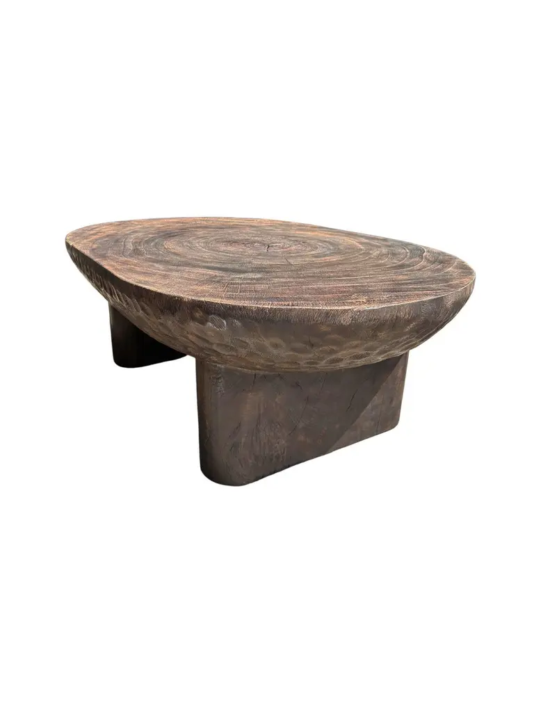 A wonderfully sculptural table crafted from suar wood. To achieve its pigment the wood was burnt numerous times and then finished with a clear coat. The mix of wood textures and shades adds to its charm. The table top was crafted from a single slab of wood and features hand-hewn detailing on its underside. The "Espresso" finish is in reference to the tone which is a mix of various shades of brown & hints of black. This table is customizable