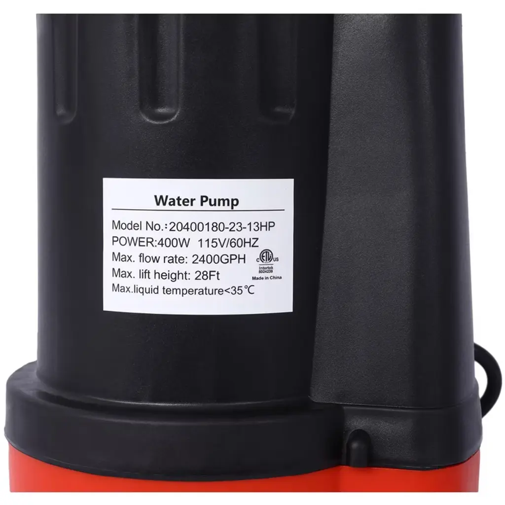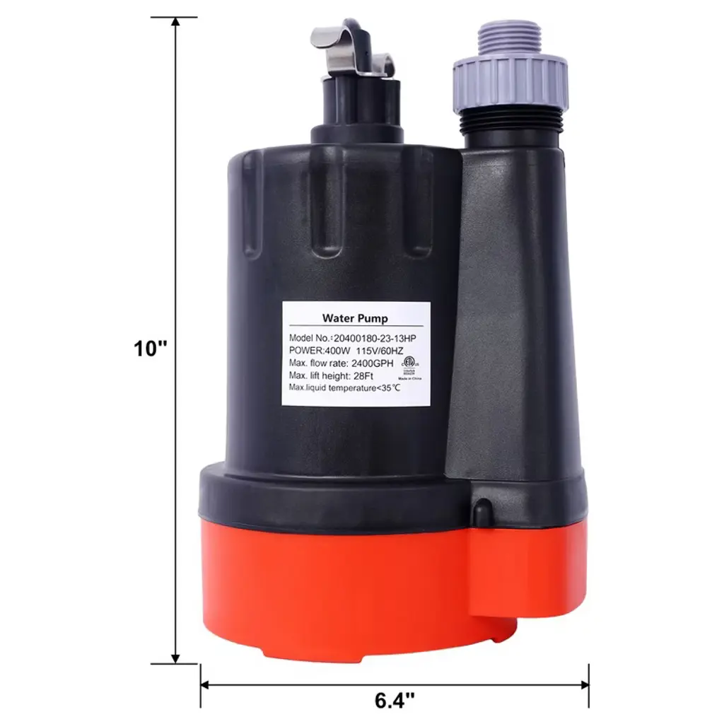 Description: Product Name:Submersible Water Pump, 1/3HP 2500GPH Thermoplastic Utility Pump Portable Electric Water Pump Sump Pump, With 10 Feet Power Cord Main Color:Black Main Material:ABS Voltage: 115v 60Hz 400w Power consumption: 1/3HP Max Discharge Flow rate:2500GPH Max lifting height: 25ft Max LIquid temperature<35℃ Dia.of pipe:1-1/4"NPT, 3/4"GHT Cable: 18AWGx3C,10FT Packing list:Submersible Water Pump, 1/3HP 2500GPH Thermoplastic Utility Pump Portable Electric Water Pump Sump Pump, With 10 Feet Power Cord x 1