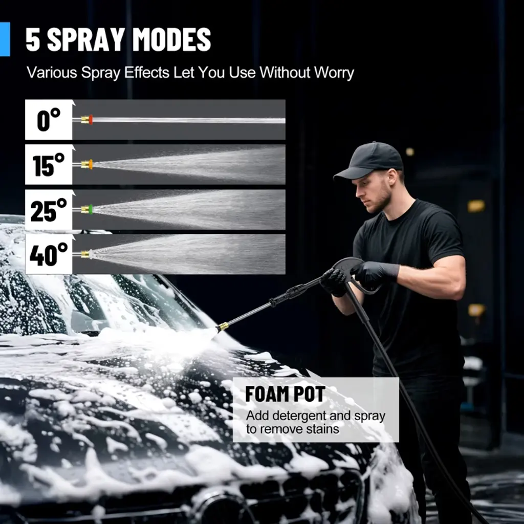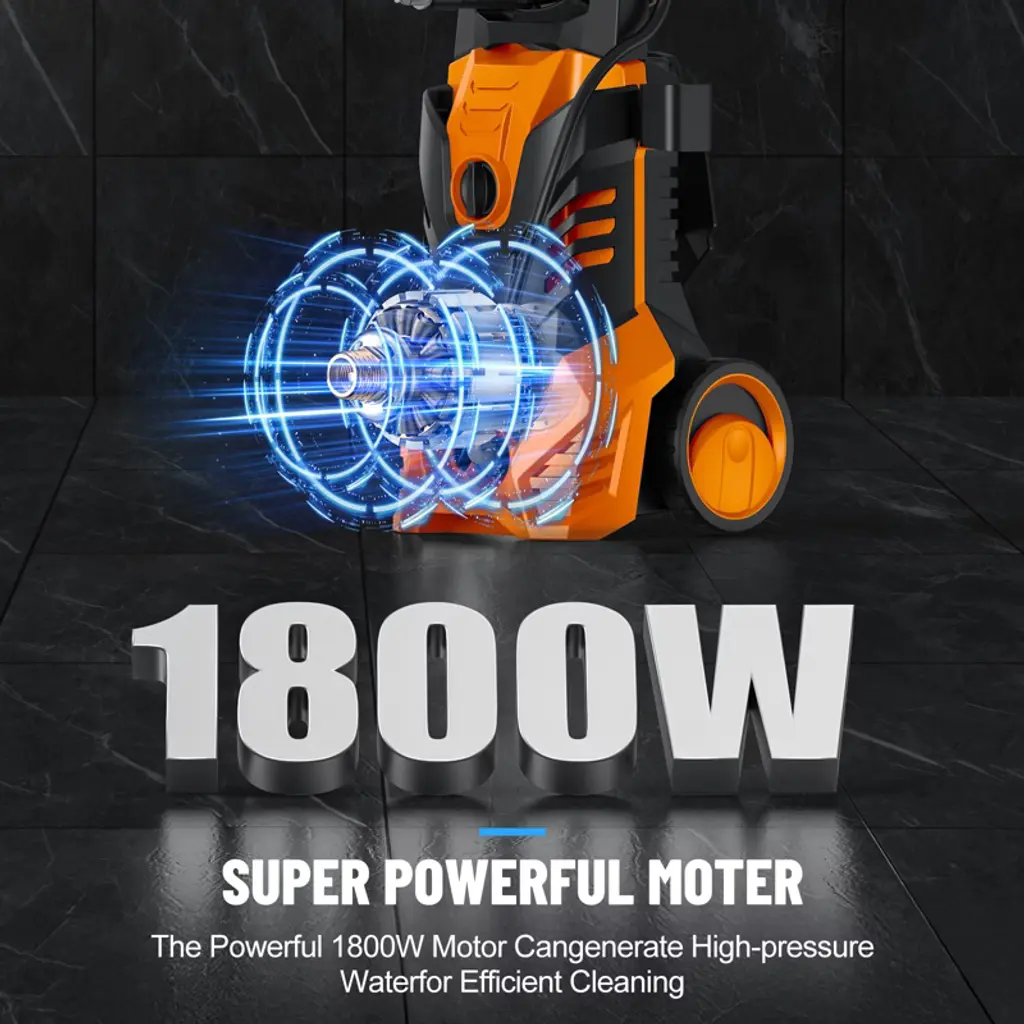 Upgrade your outdoor cleaning with the 1800W Electric Pressure Washer. Equipped with a powerful 1800W motor, this washer delivers 3500 PSI at 2.4 GPM, making it ideal for tough cleaning tasks on cars, driveways, patios, and more. The 5 adjustable nozzles allow you to customize the spray pattern for precise cleaning, while the built-in foam sprayer lets you apply detergent for better stain removal. Safety features, including auto-stop, thermal protection, and overload protection, ensure safe operation. The portable design with wheels and a built-in hose reel makes it easy to store and move, while the IPX5 water resistance ensures durability in wet conditions. Whether you need to clean large surfaces or smaller, more delicate areas, this pressure washer guarantees effective, spotless results every time. Features Powerful 1800W Motor: Delivers 3500 PSI and 2.4 GPM for quick, efficient cleaning. 5 Adjustable Nozzles: Includes 0°, 15°, 25°, 40°, and soap nozzles for various cleaning tasks. Built-in Foam Sprayer: Effortlessly apply detergent for optimal cleaning results. Portable & Convenient: Equipped with wheels and a built-in hose reel for easy transport and storage. Enhanced Safety: Features auto-stop, thermal, and overload protection for safe operation. Water-Resistant: IPX5-rated for durability and safe use in wet conditions. Sound Power Level: Operates at 98 dB(A) for powerful performance without excessive noise. Specifications Material: PP (Polypropylene), Metal Power Input: 1800W Rated Pressure: 3500 PSI Max Flow Rate: 2.4 GPM Rated Voltage: 110–120V Rated Frequency: 60Hz Max Inlet Pressure: 0.3 Mpa Protection Degree: IPX5 Sound Power Level: 98 dB(A) Max Water Temperature: 40℃ Package Includes 1 x Electric Pressure Washer 1 x Spray Gun 1 x 26FT High-Pressure Hose 1 x Steel Spray Wand 1 x Foam Pot 1 x Flat Brush 1 x Hair Brush 1 x Inlet Filter 1 x Cleaning Needle 5 x Quick-Connect Nozzles (0°, 15°, 25°, 40°, Soap) 1 x User Manual