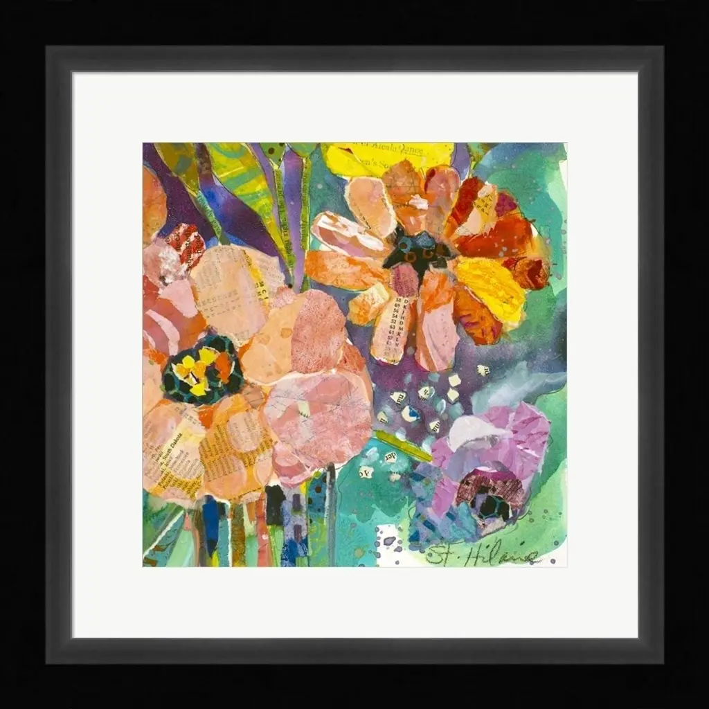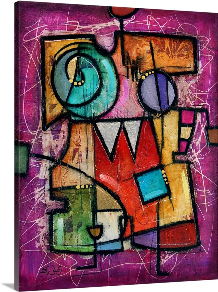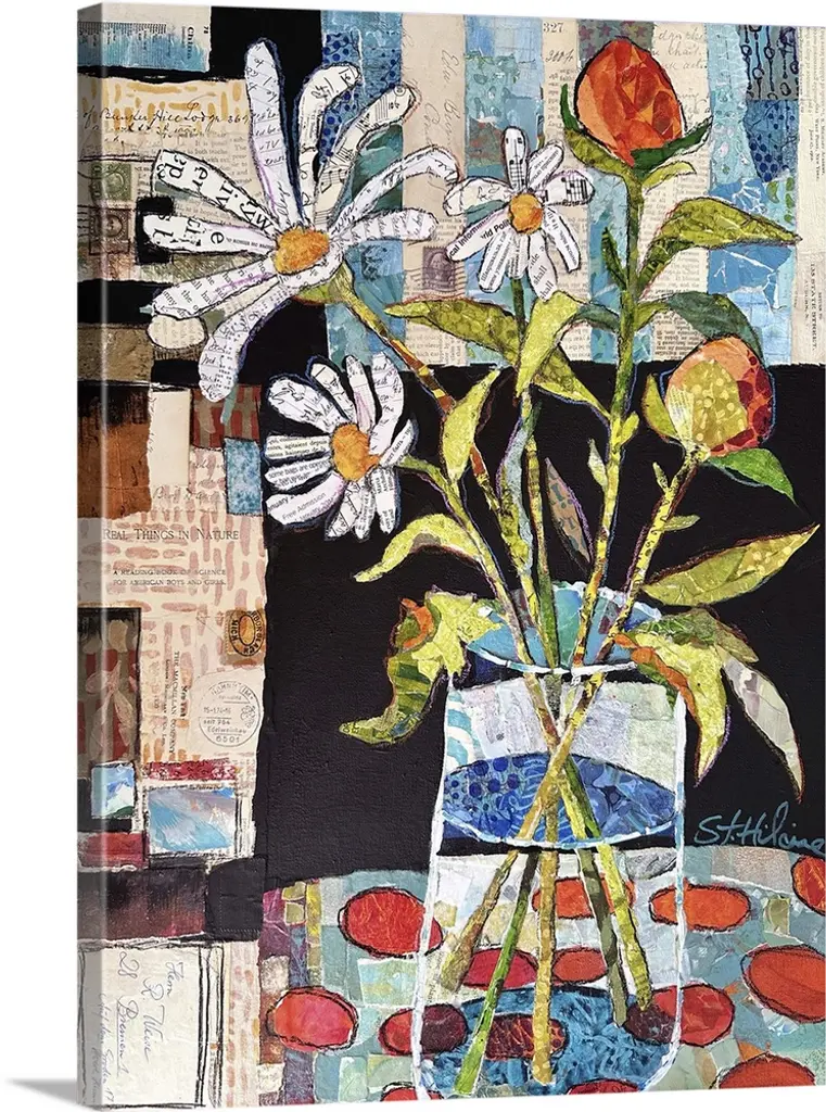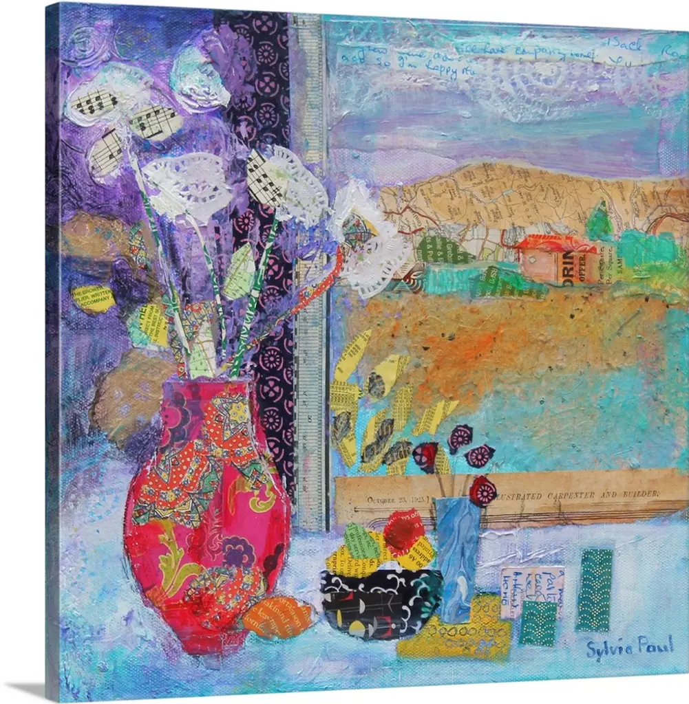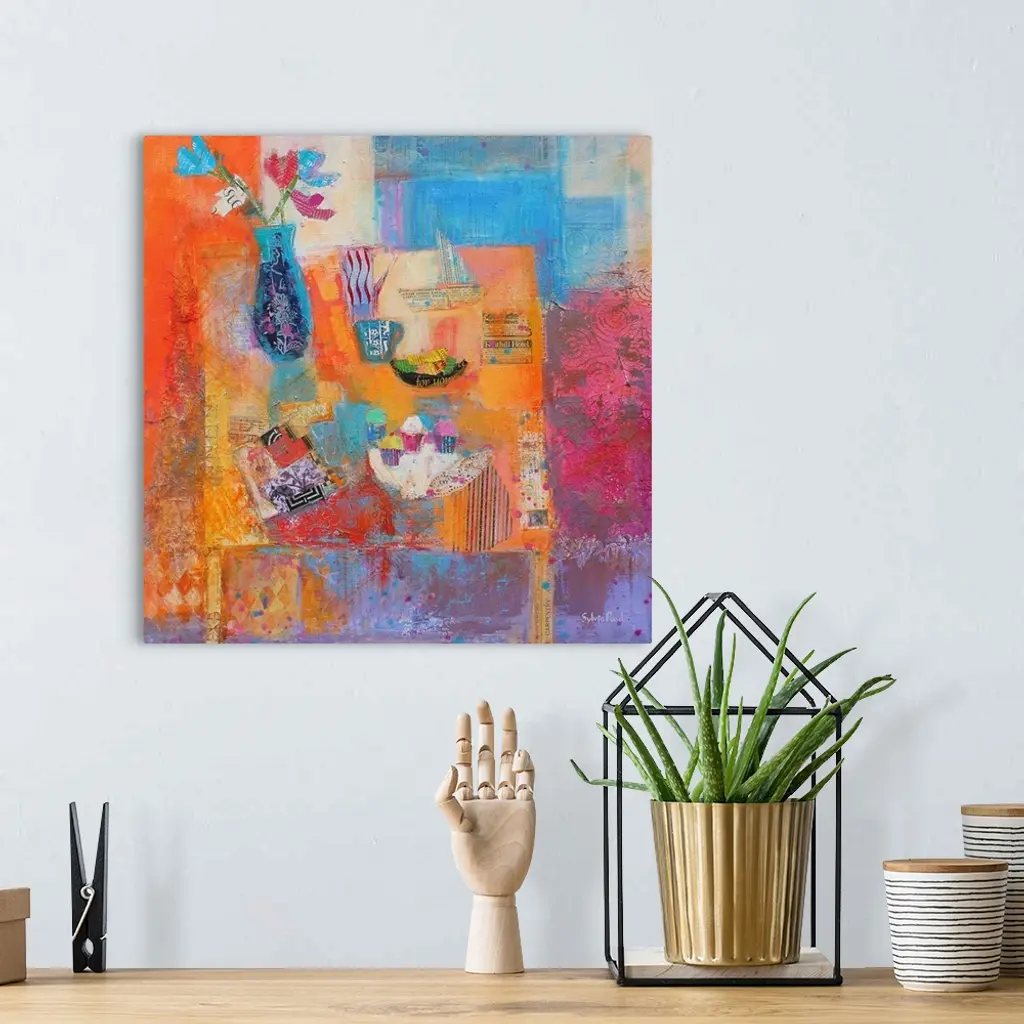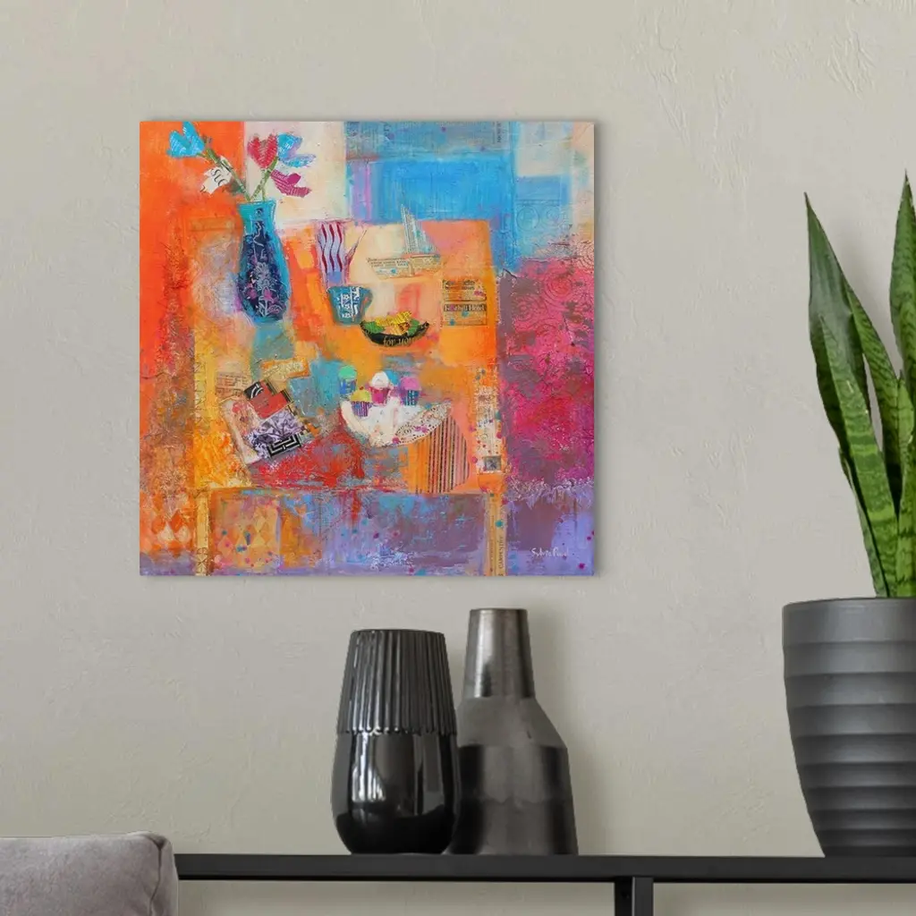 Contemporary painting of a blue vase holding flower surrounded by an array of colors.
