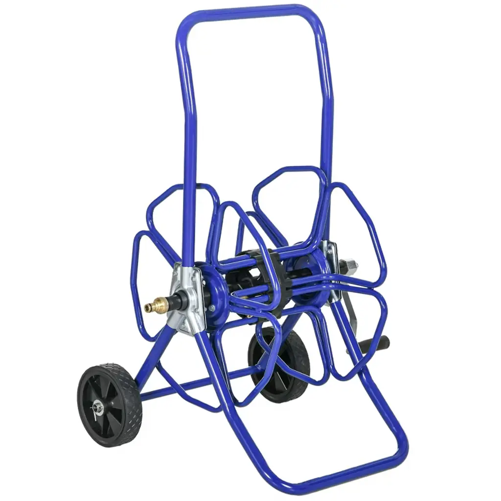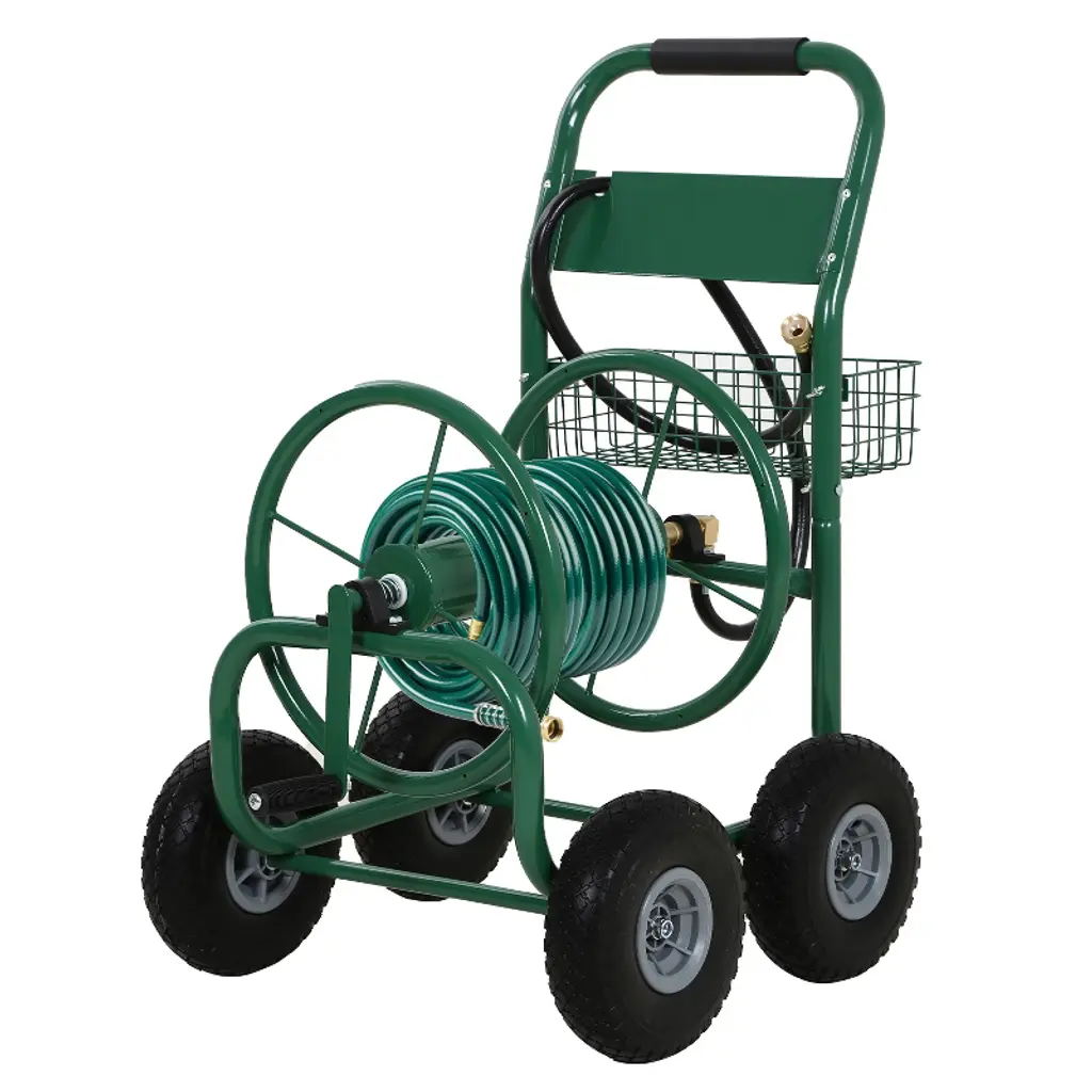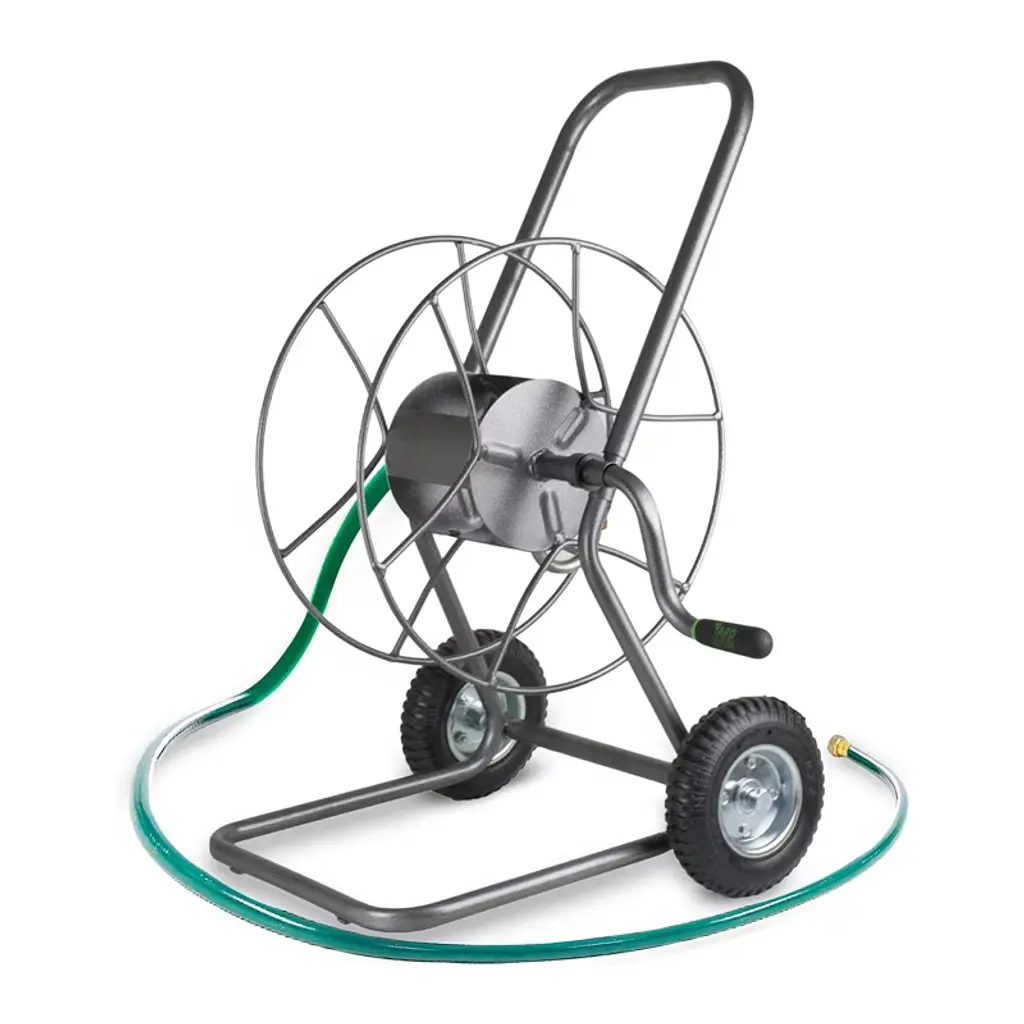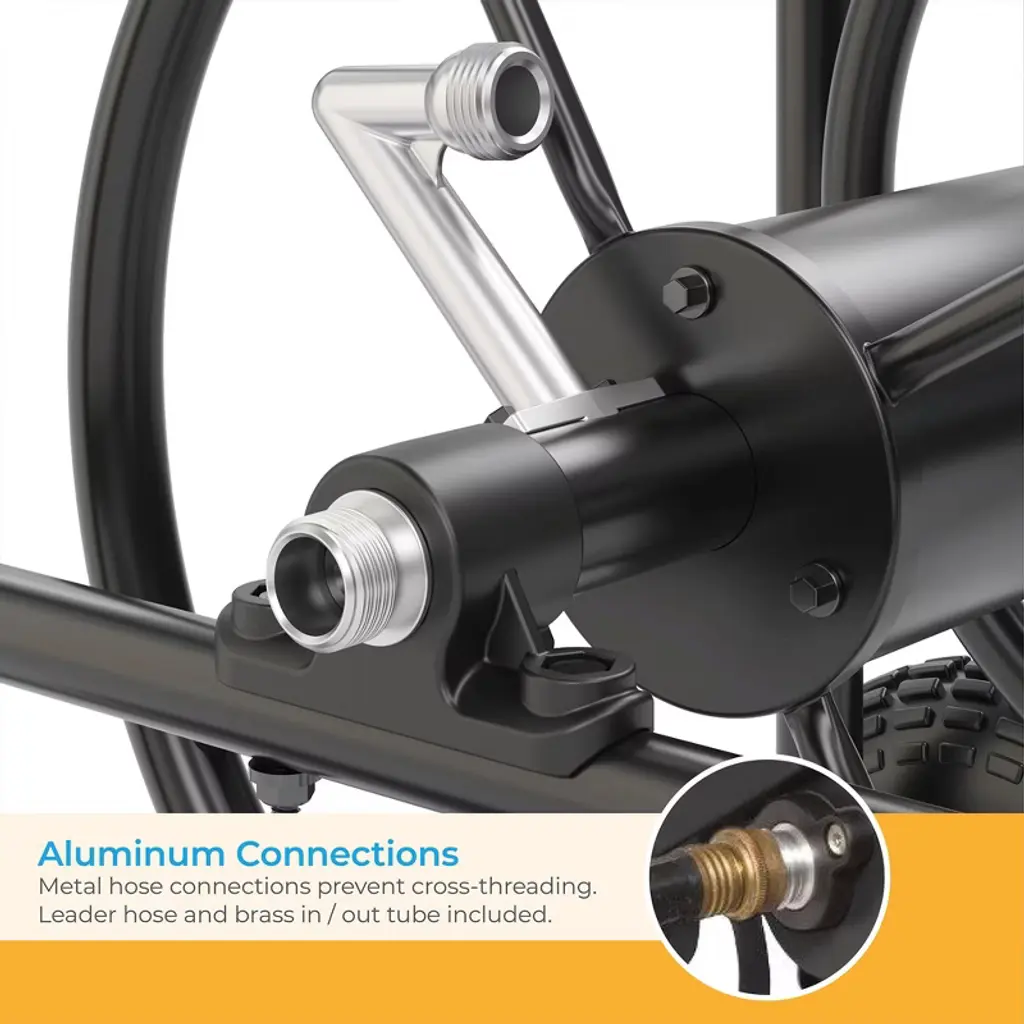 Making your lawn and garden life easier and more convenient is possible with Suncast Professional Hose Reel Cart, a reliable and durable solution to your outdoor maintenance needs. This manual crank hose reel cart is made from powder-coated steel that resists weather to ensure longevity through the changing seasons. The 10-inch flat-free rubber tires with ribbed treads make it easy to transport your hose storage reel across any terrain. Featuring a cushioned handle, this wheeled hose reel ensures a comfortable grip while you're maneuvering the cart around your yard. The Slide Track feature helps guide the hose evenly for kink-free winding, while the metal crank with a swivel grip allows for effortless winding (hose not included). Metal hose connections prevent cross-threading for a secure fit. Partially assembled to save you time, the Suncast Professional Hose Reel Cart is designed to store up to 200 feet of hose, making it perfect for heavy-duty jobs. Invest in a durable hose reel cart that can withstand the elements and make outdoor maintenance a breeze.