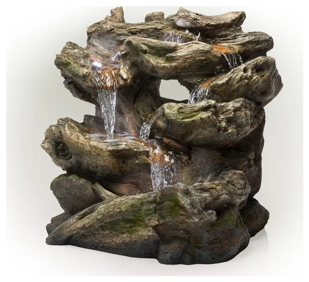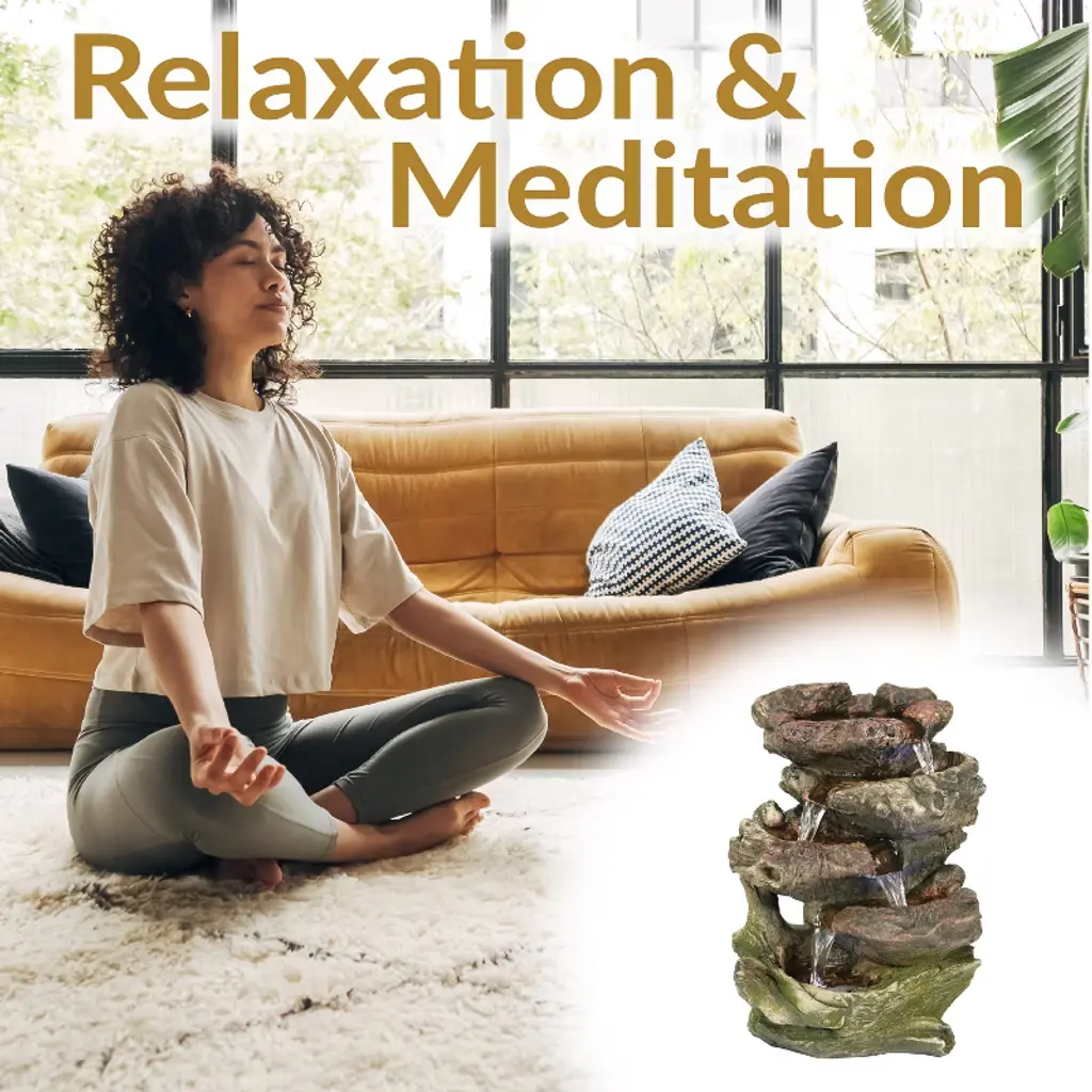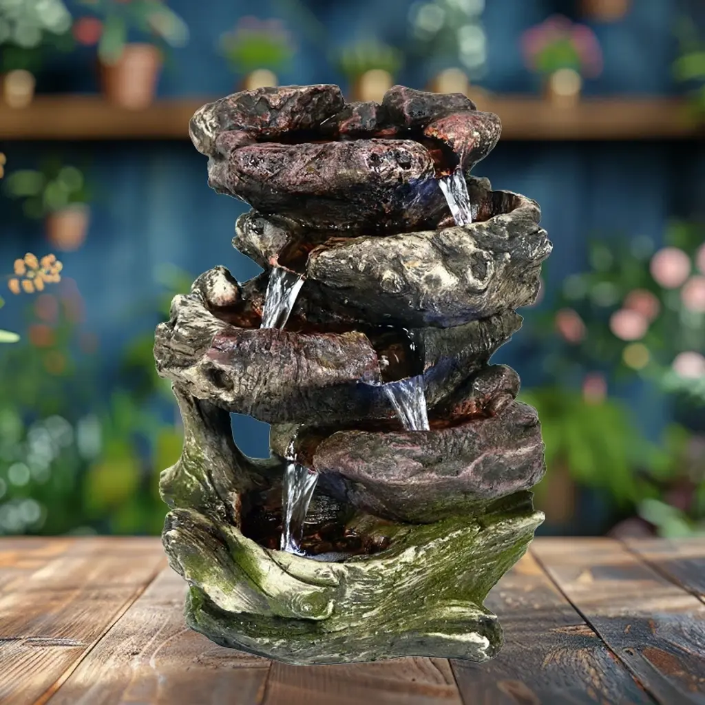 This durable lightweight desk water fountain is designed to look like real stacked stones with water gracefully flowing over each of the 5 levels. Made from polyresin and fiberglass, this tabletop office fountain captures the beauty of nature but with a lightweight, easy-to-maintain construction. The soothing sounds combined with the neutral gray, white, and subtle red color scheme will have everyone relaxing in no time. The electric submersible pump enables the gently flowing water to flow from the top tier all the way down to the bottom pool where it then circulates back through the fountain. The pump is submersible to make sure it's quieter than the soothing sounds of falling water. The fountain features small pebbles in each rock pool, padded feet to protect the table surface, natural detailing, and LED lights on the 2nd, 3rd and 4th levels so you can easily stay relaxed well into the evening. Place in any living room, bedroom, kitchen, or office to stay relaxed anywhere.• TABLETOP FOUNTAIN DIMENSIONS: This relaxing water fountain measures 9.5" W x 7.5" D x 14" and weighs 6 lbs. It has a weight capacity of 1 gallon. It's a great size for a desk or shelf in an office, living room, or bedroom.• DURABLE CONSTRUCTION: The polyresin and fiberglass material ensures that the small water fountain for desk will be long-lasting and easy to move due to its lightweight.• COMPLETE FOUNTAIN: This small desktop fountain includes pads on the bottom of the waterfall fountain to protect a table surface, LED lighting to illuminate the fountain, and a quiet submersible pump.• EASE OF USE: No plumbing is required. Simply add water to the indoor water feature and plug it into a standard electrical outlet. It also features a camouflaged back side door for quick access to the pump and light.• WORRY-FREE PURCHASING: Sunnydaze Decor backs its products with a 1-year manufacturer's warranty.