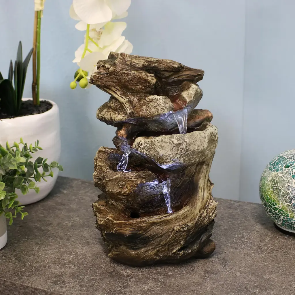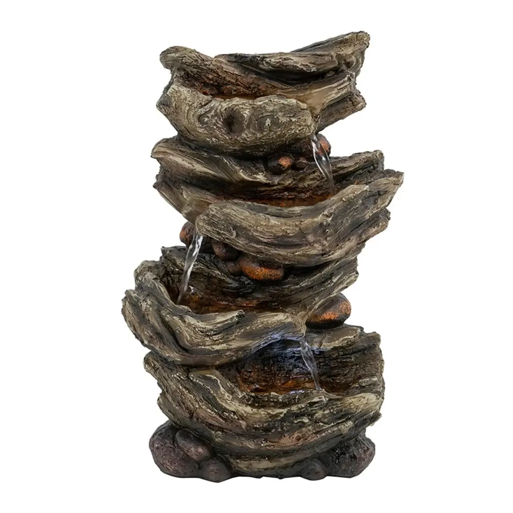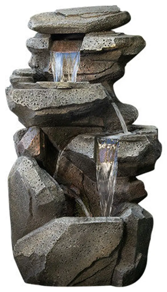 Don't want just one waterfall? How about three? This durable lightweight fountain is designed to look like real stacked stones with water flowing down over the 4 levels of rock. The soothing sounds will have everyone calm and relaxed in no time. This tabletop fountain has a natural color scheme featuring neutral grey, white, and subtle red. The electric pump enables the gently flowing water to trickle from the top tier all the way down to the bottom pool where it circulates back through the fountain thanks to included electric submersible pump. The fountain features small pebbles in each rock pool, padded feet to protect the table surface, natural detailing, and LED lights on the 1st, 2nd, and 3rd levels. The lights allow anyone to enjoy the fountain's beauty even after the sun sets. Place this fountain in any living room, bedroom, kitchen, or office.• 4-TIER WATERFALL FOR SOOTHING AMBIENCE: This tabletop water fountain features a cascading design with four rock-like levels, creating a continuous, tranquil stream that enhances any living room, bedroom, or office as a relaxing fountain indoor centerpiece.• DURABLE, LIGHTWEIGHT MATERIALS FOR VERSATILE PLACEMENT: Crafted from polyresin and fiberglass, this tabletop fountain mimics the look of real stacked stone while weighing just 4 lbs, making it a durable and movable option for shelves, desktops, or countertops.• ENHANCED DESIGN WITH PRACTICAL FEATURES: This table fountain includes built-in LED lights on the first three tiers for soft evening illumination, foot pads to prevent scratches on surfaces, and a camouflaged access door for easy maintenance of the submersible pump and lighting.• SIMPLE OPERATION WITH CONTINUOUS FLOW: Designed as a small water fountain indoor setup, this indoor fountain holds 1 gallon of water and runs quietly with an adjustable electric pump, just plug into a standard outlet for a steady waterfall desktop fountain experience.• WORRY-FREE PURCHASING: Sunnydaze Decor backs its products with a 1-year manufacturer's warranty.
