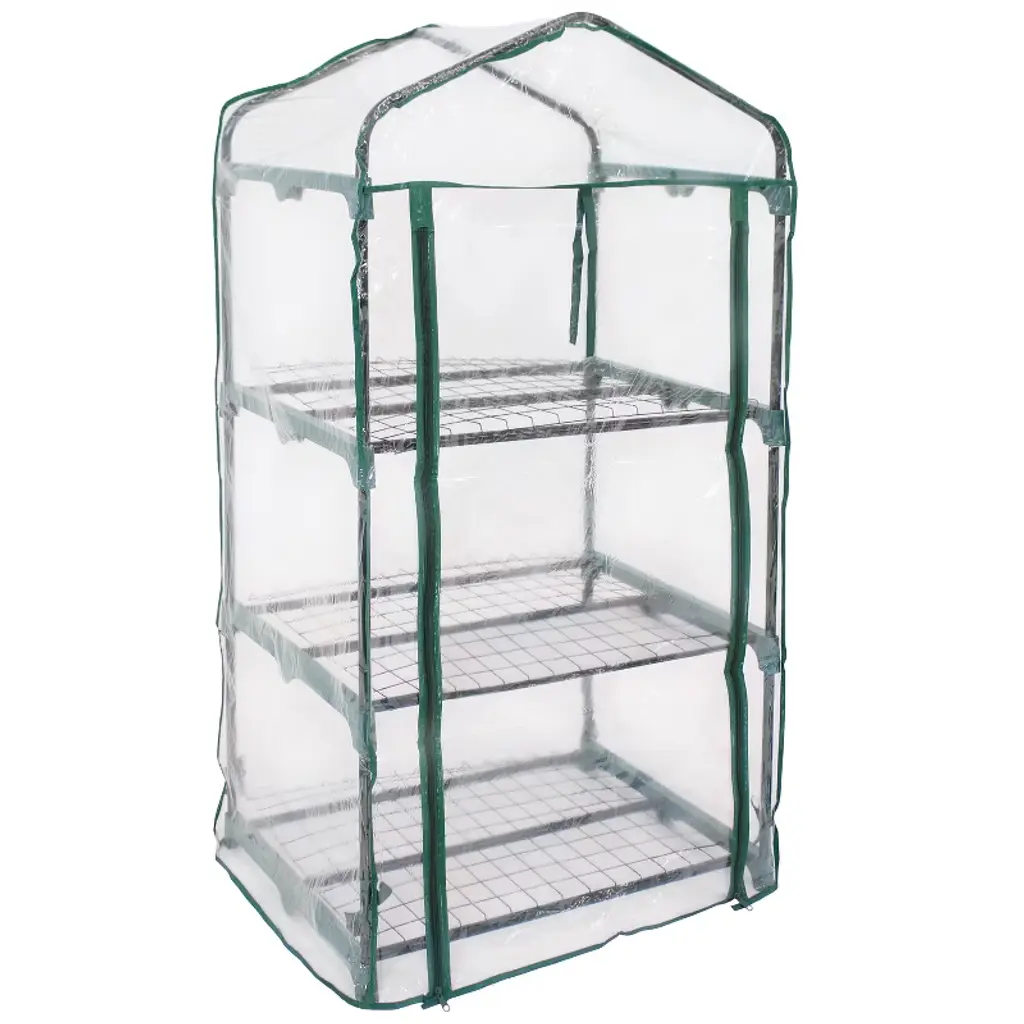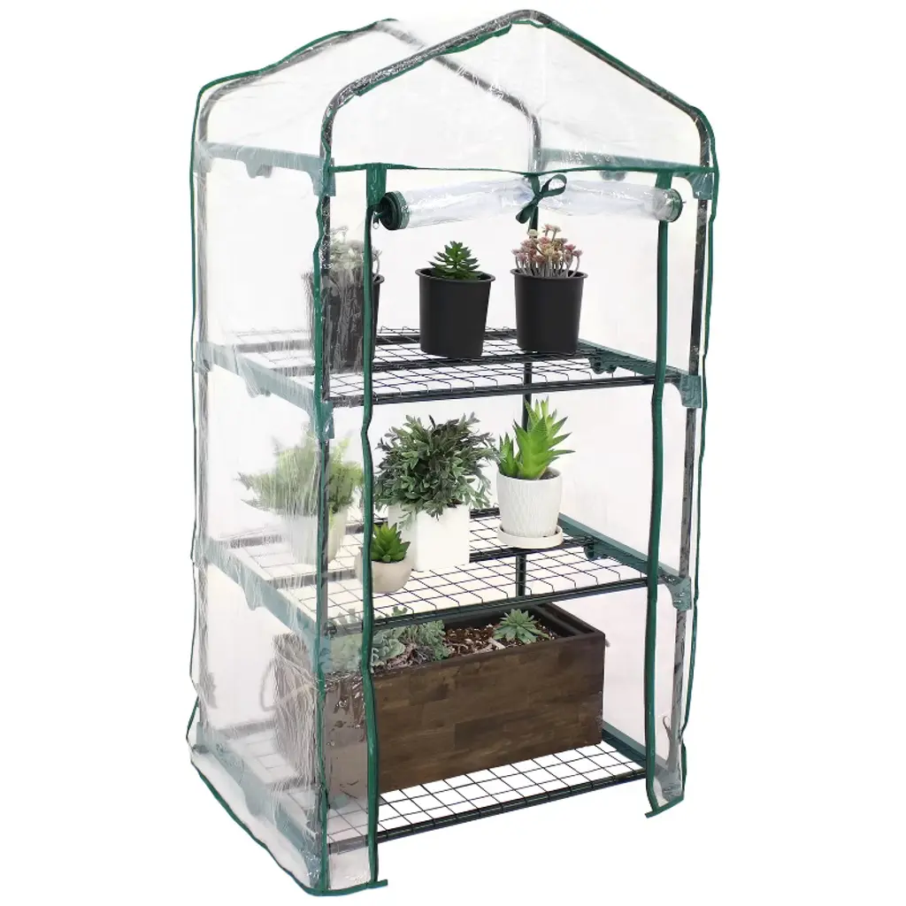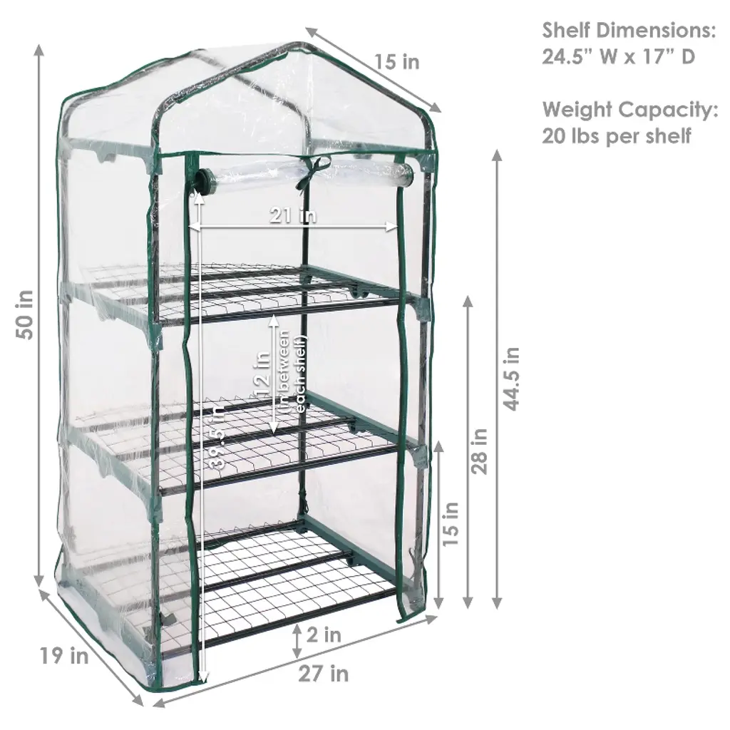 Have a successful growing season with help from this small greenhouse for plants. With three shelves for growing plants and storing supplies, this portable mini greenhouse is great for creating just the right climate for growing vegetables, herbs, fruits, and flowers. This greenhouse is durably constructed from an iron tube frame with steel wire shelves and a polyethylene covering coated with a UV ray protective finish. The durable cover protects plants from inclement weather, like frost and excessive heat or too much moisture. The cover of this mini greenhouse is transparent so light can filter through to ensure plants receive the right amount of sunlight needed to grow. A roll-up door makes accessing plants easy and allows for controlled airflow in and out of the greenhouse. Simply tie the door up to keep it open or untie and zip the sides down to keep it closed.• PORTABLE PATIO GREENHOUSE: Move this small greenhouse across the yard, patio, or deck easily to ensure plants receive the best sunlight to grow. This mini greenhouse measures 27" W x 19" D x 50" H and weighs 6.4 lbs. Each shelf is 24.5" W x 17" D and has a weight capacity of 20 lbs. The bottom shelf is 2" from the ground, the middle shelf is 15" from the ground, and the top shelf is 28" from the ground with 12" between each shelf. The door measures 21" W x 39.5" H.• USE YEAR AFTER YEAR: Made from an iron tube frame, this portable greenhouse for plants is sure to last through several growing seasons. Each shelf is made from steel wire to support the weight of growing plants. The light-filtering cover is made from durable PVC plastic with a transparent coating to protect plants from harmful UV rays and weather conditions.• 3-SHELF GREENHOUSE: This small outdoor greenhouse has 3 shelves to grow greenery, vegetables, herbs, flowers, and other plants outdoors. Shelves are great for keeping gardening supplies close at hand and for growing plants. Store the heaviest plants and planters on the lowest shelf.• PROMOTES PLANT GROWTH: A transparent cover protects plants from UV rays and inclement weather, including frost, excessive heat, and too much moisture. A zippered door allows for controlled airflow in and out of the greenhouse.• WORRY-FREE PURCHASING: Sunnydaze Decor backs its products with a 1-year manufacturer's warranty.