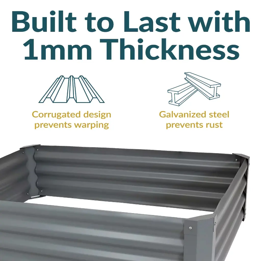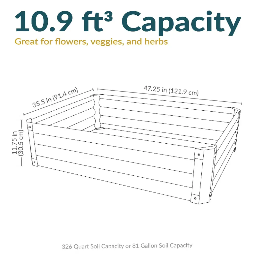 Enhance outdoor gardening with this durable steel raised garden bed, designed to support healthier plant growth and simplify garden maintenance. The elevated structure helps improve soil conditions, drainage, and root development, making it easier to grow vegetables, herbs, and flowers in compact spaces. Its raised height reduces the need for bending and kneeling, offering a more comfortable gardening experience while also helping to deter pests. Crafted from weather-resistant steel, this planter box is built to withstand the elements and resist rust and corrosion over time. The kit includes all necessary components for easy assembly: steel panels, corner connectors, and hardware. Once assembled, simply add soil and begin planting. With its clean lines and modern look, this garden bed adds visual appeal to patios, yards, or greenhouse spaces. Available in multiple color options, it offers both function and aesthetic flexibility for a range of outdoor garden designs.• AMPLE GROWING SPACE: This elevated garden bed has plenty of space for growing a variety of vegetables and flowers. The raised bed measures 47.25" W x 35.5" D x 11.75" H, weighs 14.8 lbs, and has a 10.9 cubic foot soil capacity. Each side panel is 1 mm thick, and each corner panel is 1 mm thick.• DURABLE CONSTRUCTION: This raised garden bed kit is made from galvanized steel, providing superior durability and stability compared to wood or plastic. Galvanized steel withstands harsh weather conditions for long-lasting use.• EASY TO USE: All hardware and tools are included to assemble the garden bed. Simply place the kit above ground, add soil, and watch as veggies and plants begin to grow.• PROMOTES HEALTHY ROOTS: This raised bed for gardening vegetables, fruits, flowers, and herbs supports root development for healthy and strong plants.• WORRY-FREE PURCHASING: Sunnydaze Decor backs its products with a 1-year manufacturer's warranty.